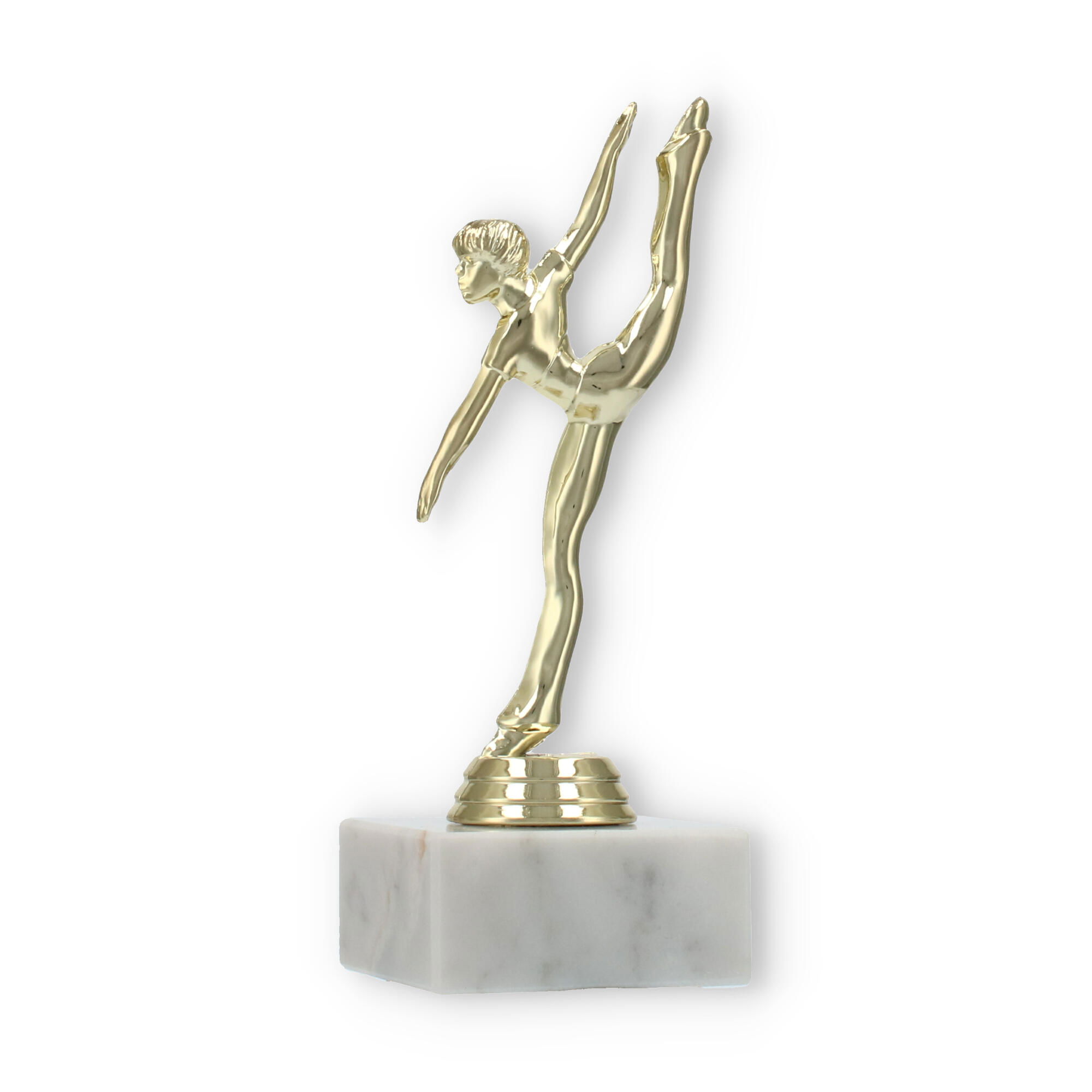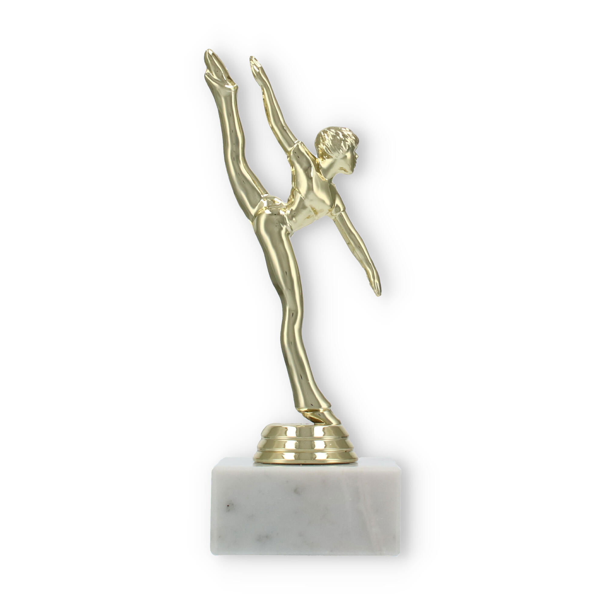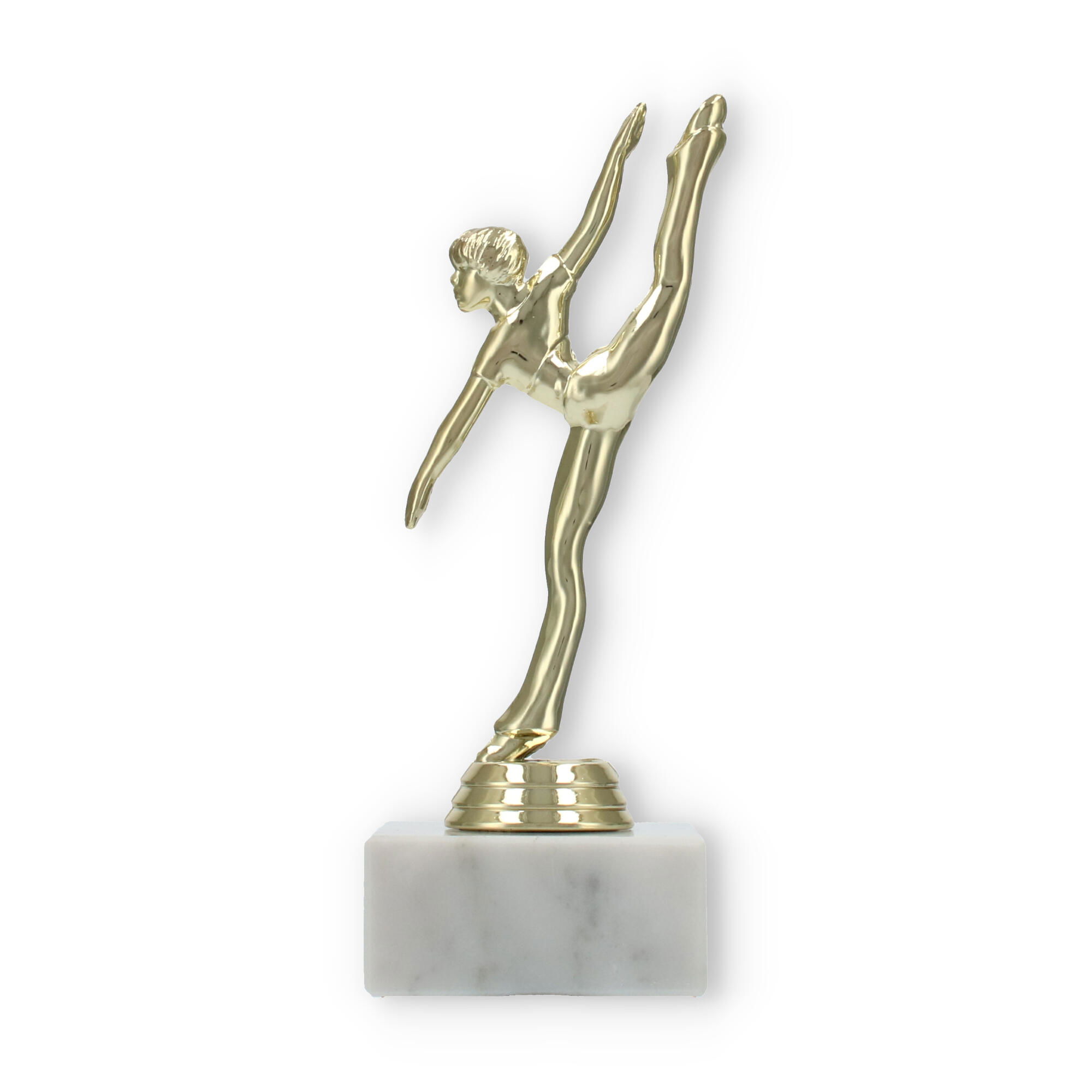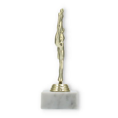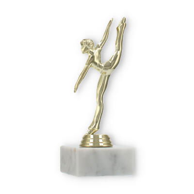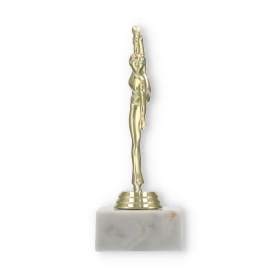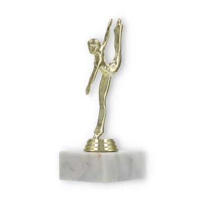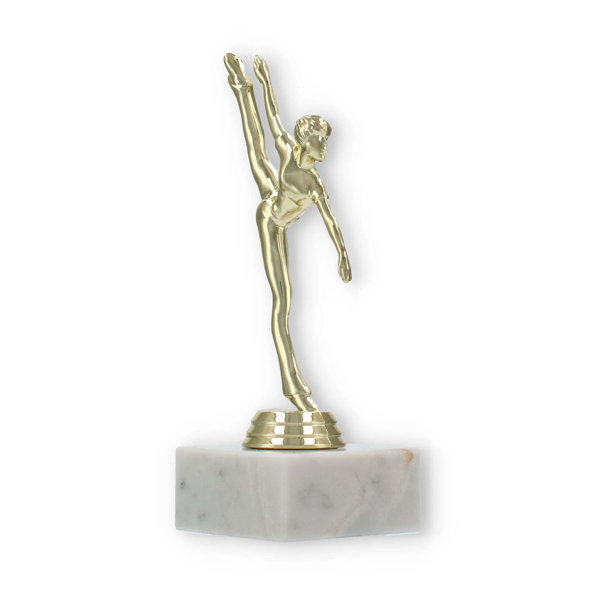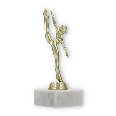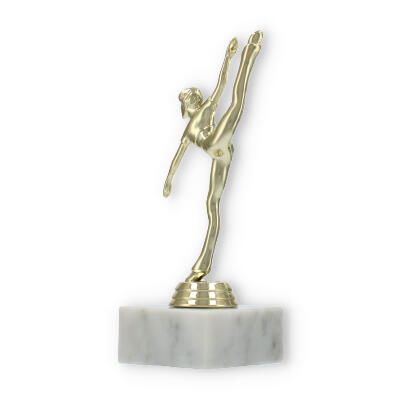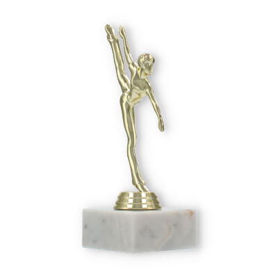 Imagina la emoción del evento, donde cada participante anhela alzarse con este trofeo. La combinación del resplandeciente dorado del bailarín y la pureza del mármol blanco de la base otorga un equilibrio visual cautivador.