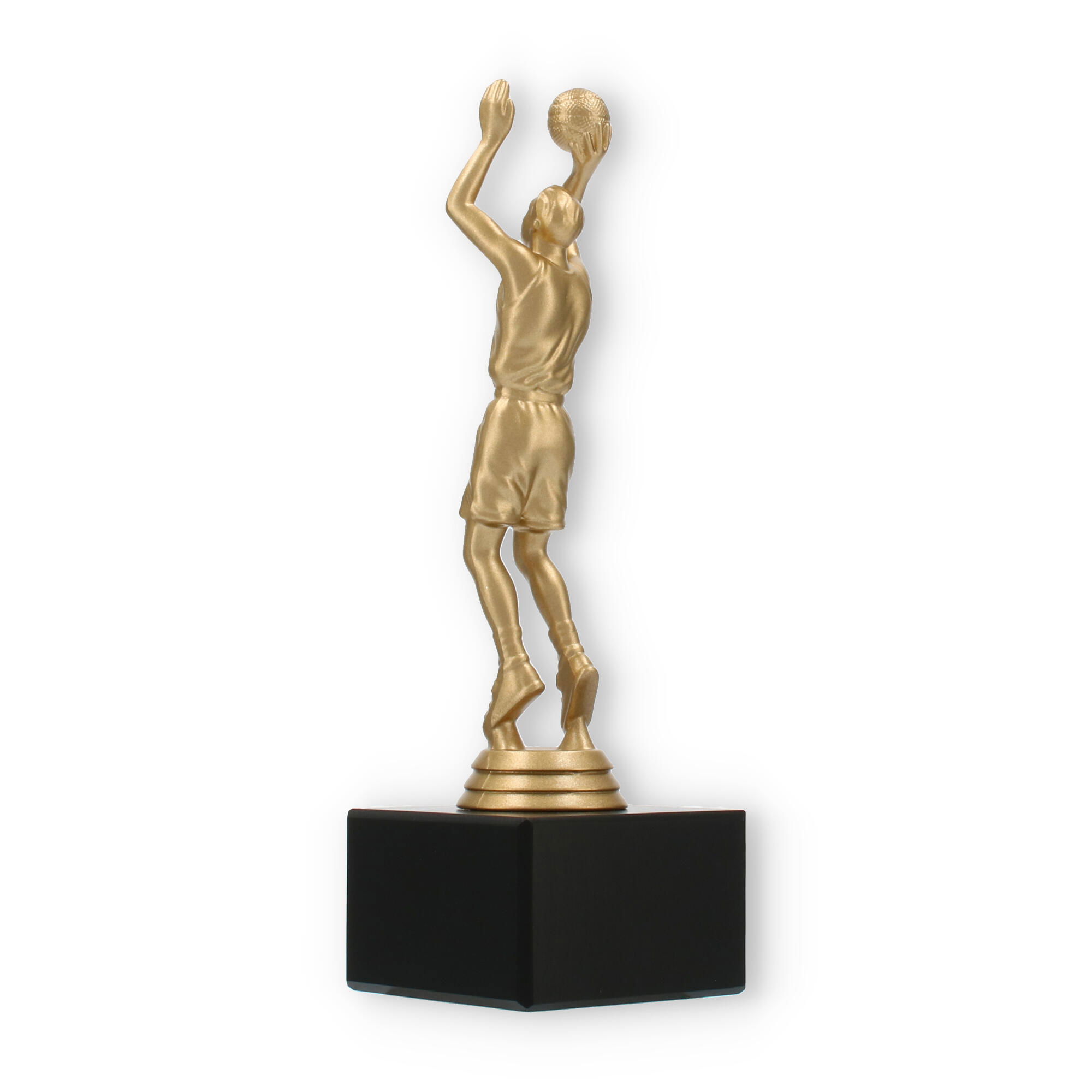 Diseñado con una base de mármol negro, este trofeo no solo ofrece estabilidad, sino que también añade un toque de sofisticación. La combinación del material plástico de la figura y la robustez del mármol asegura que el galardón sea tanto estéticamente impresionante como duradero. El contraste entre la figura dorada y el mármol negro hace resaltar la elegancia del trofeo, haciéndolo apto para cualquier evento especial.