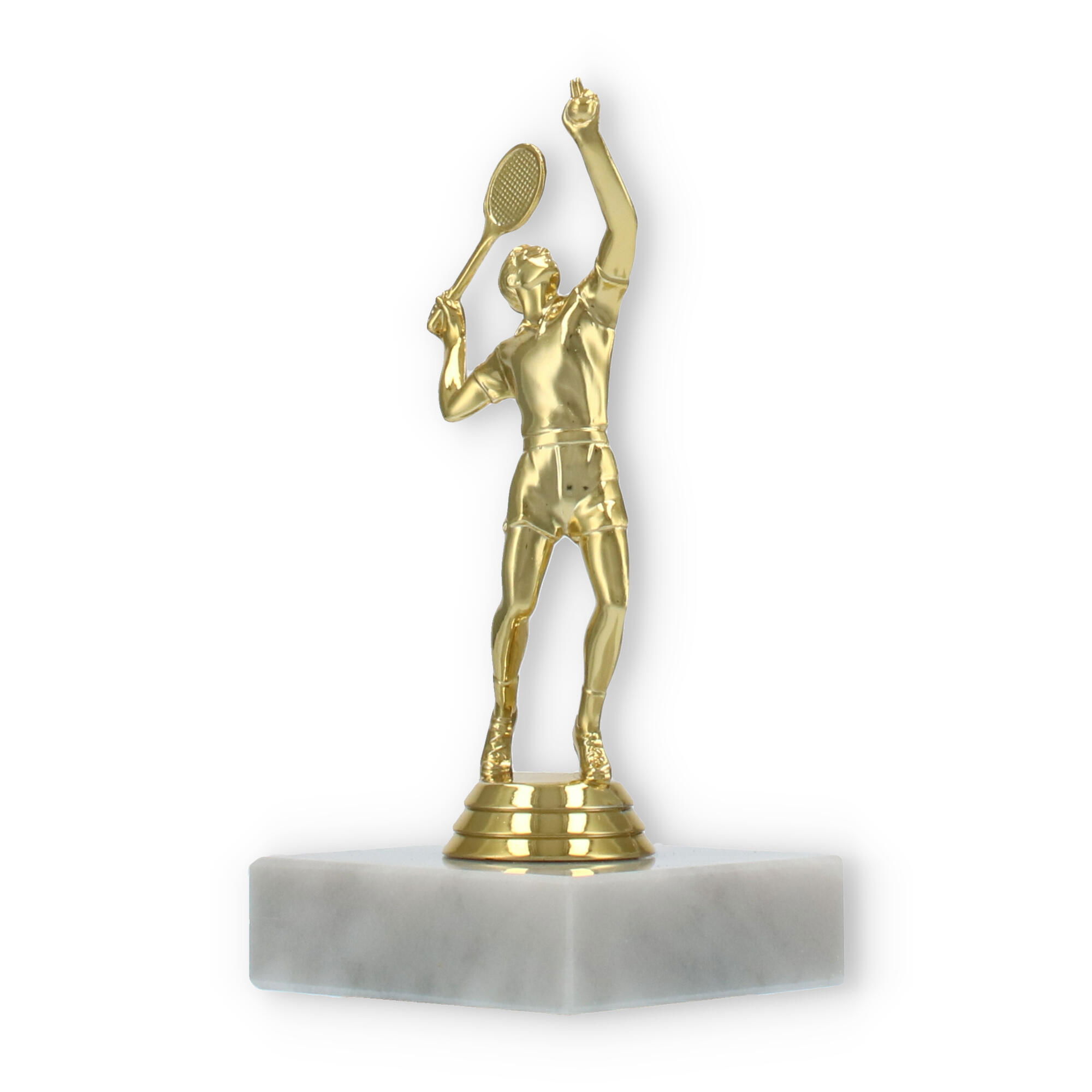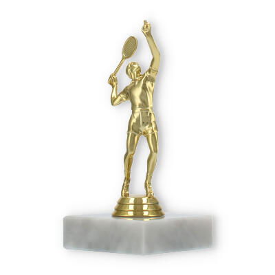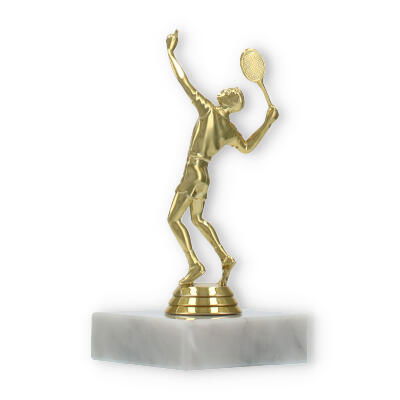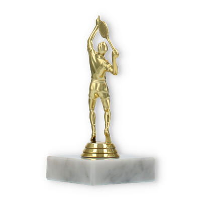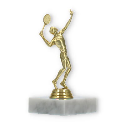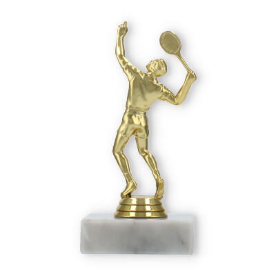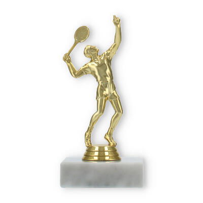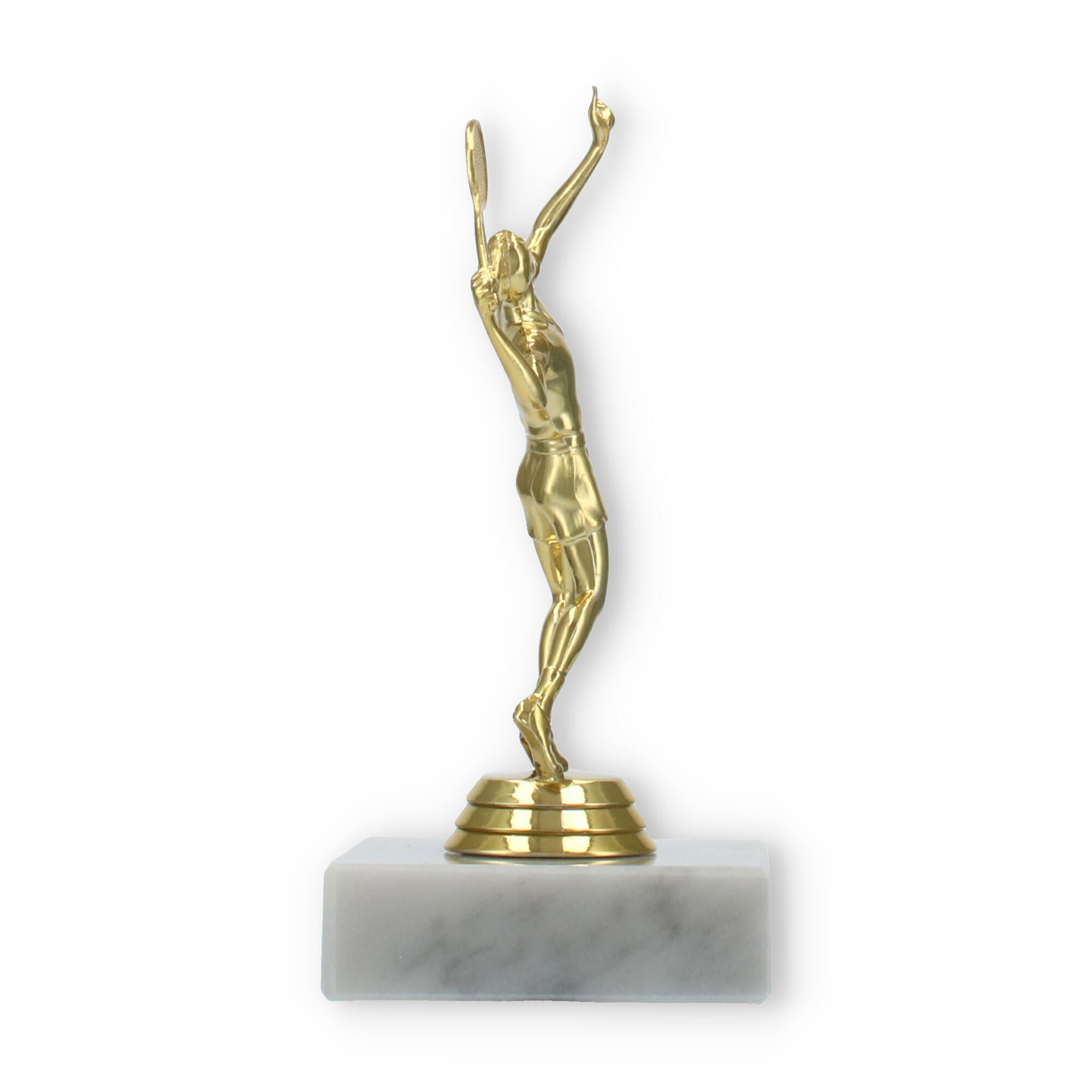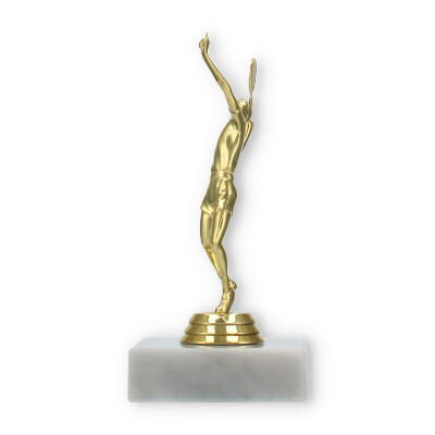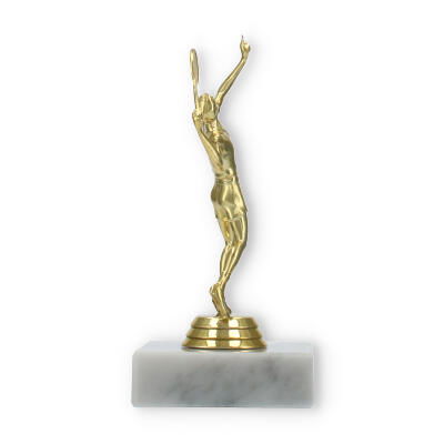 Este trofeo, diseñado con una base de mármol blanco, proporciona estabilidad y durabilidad. La superficie texturizada del mármol destaca el color dorado de la figura, creando una combinación visualmente impresionante que resalta en cualquier colección de trofeos.