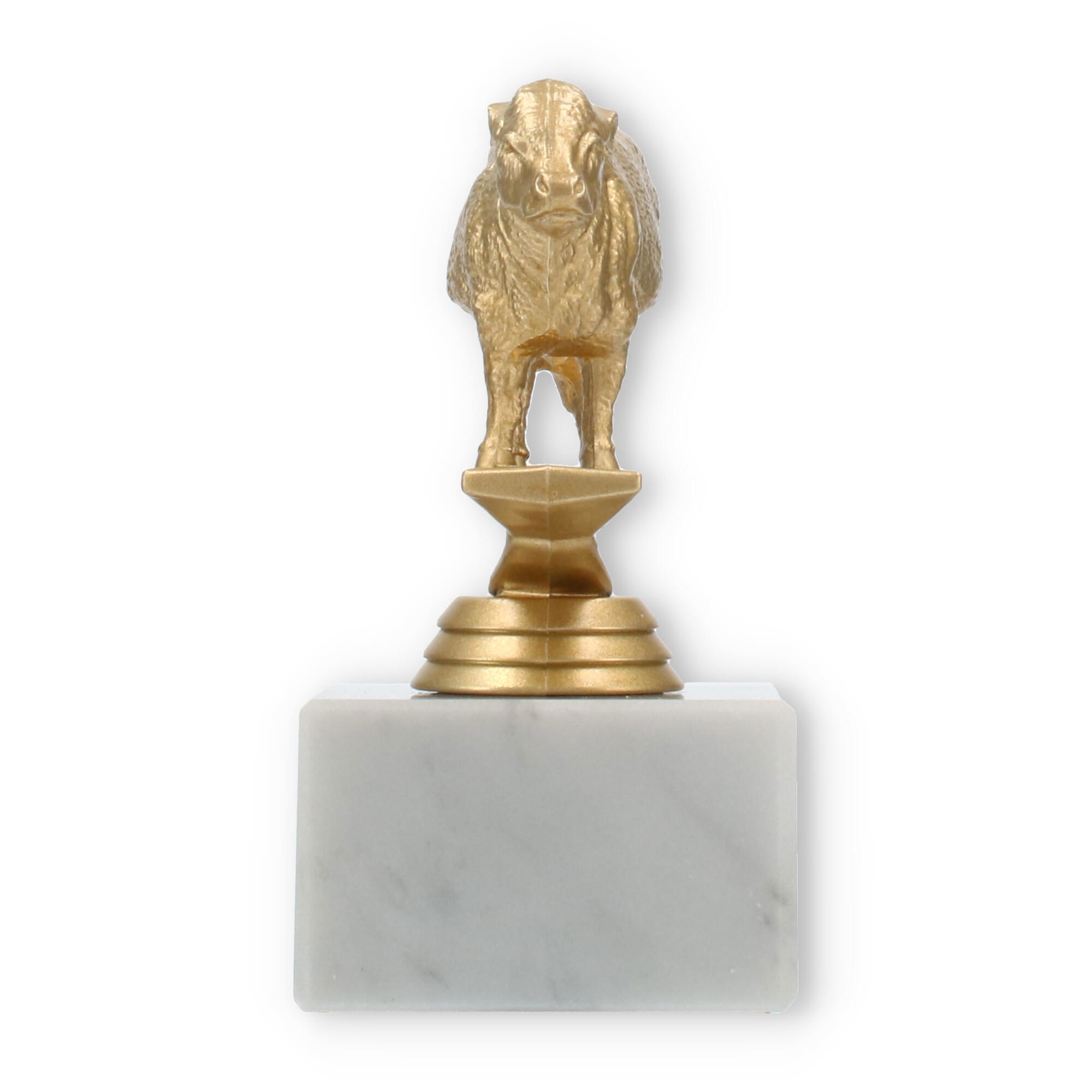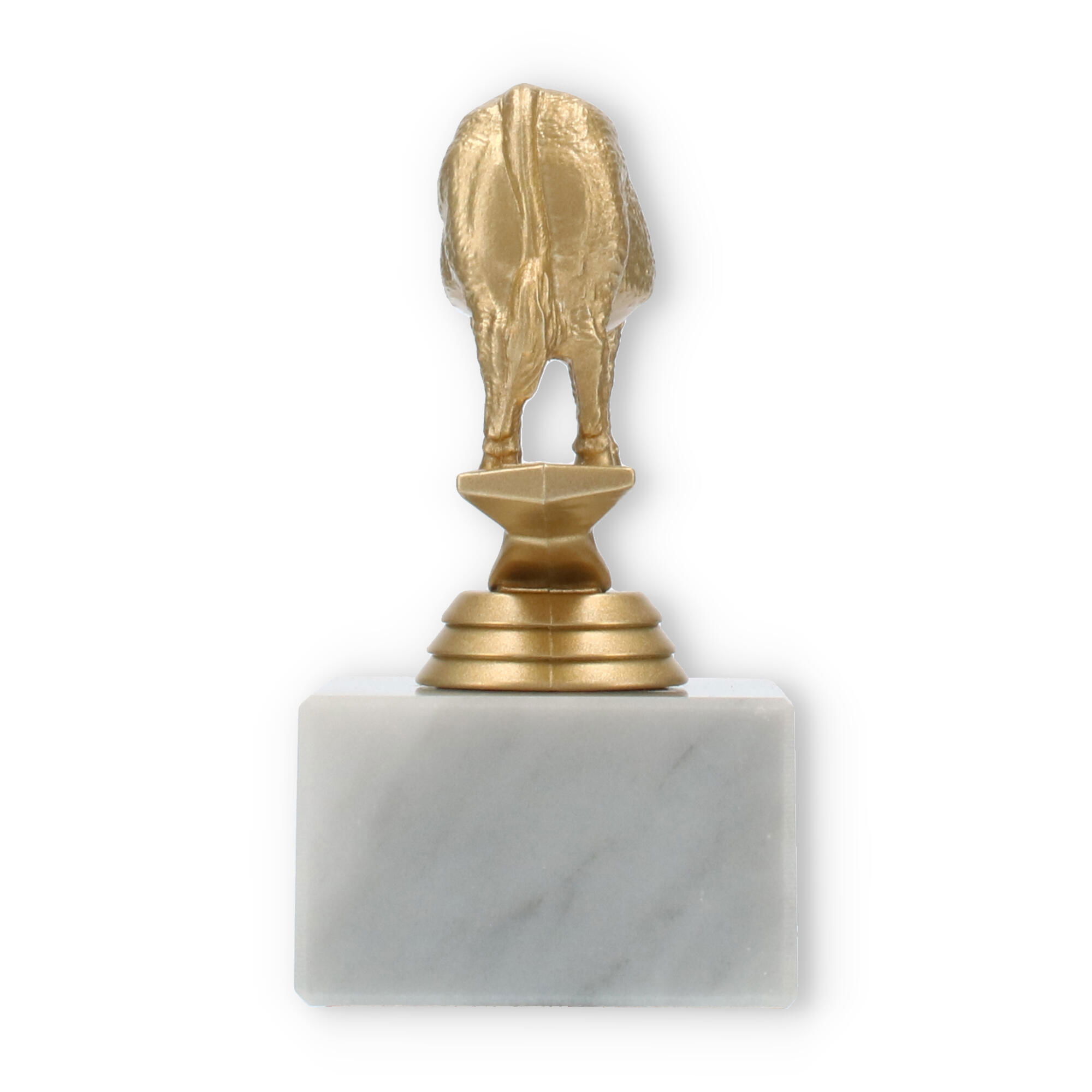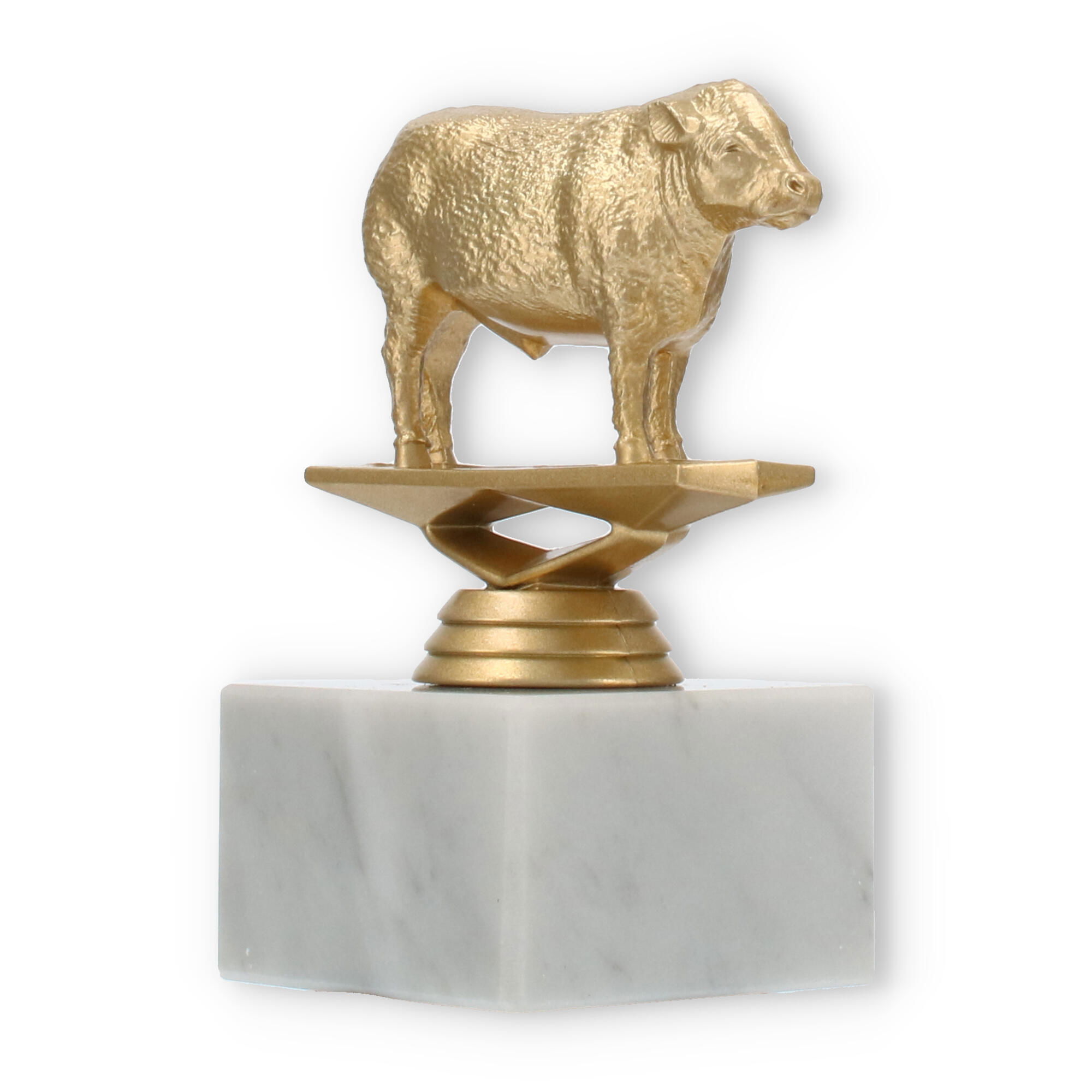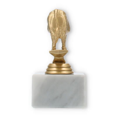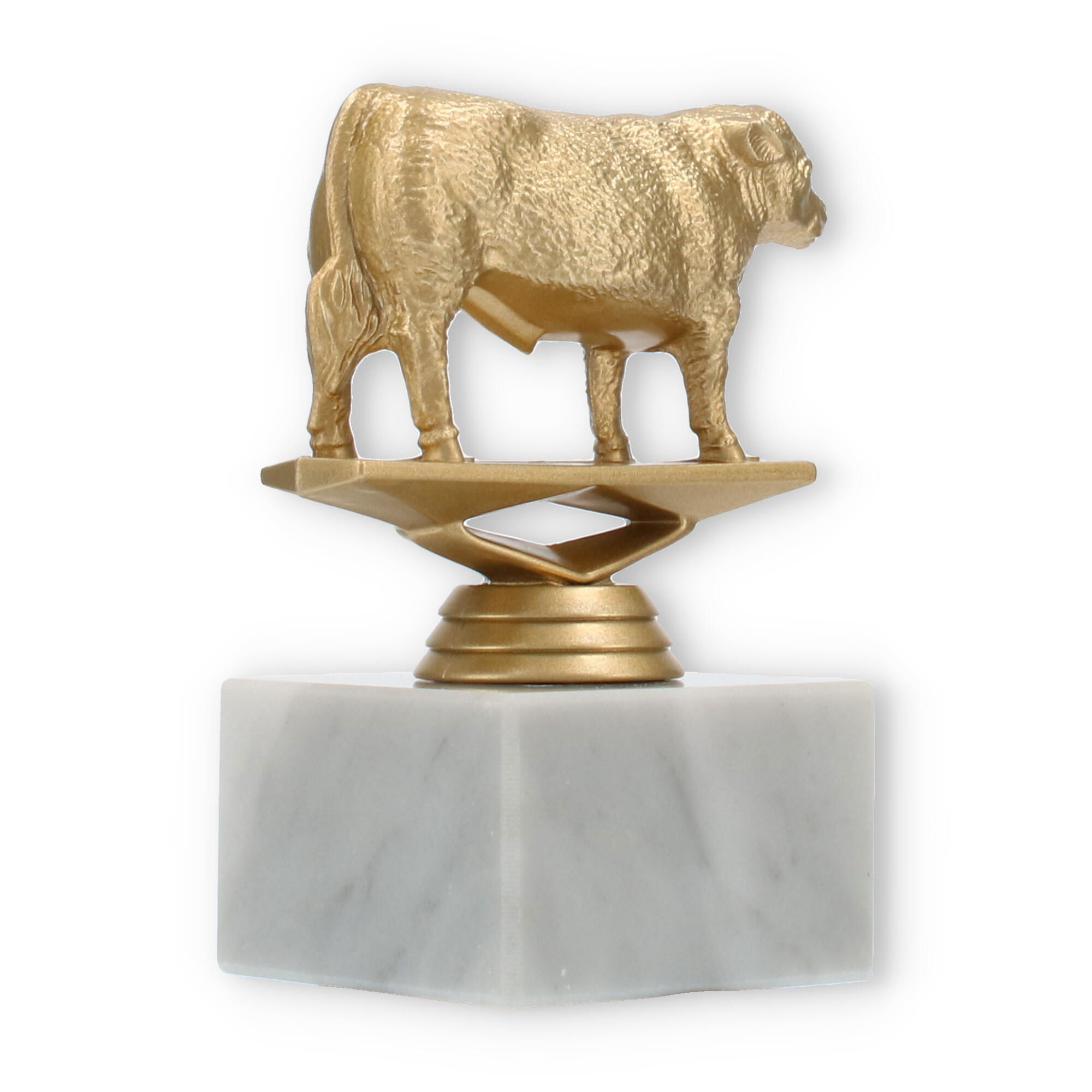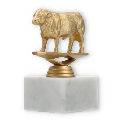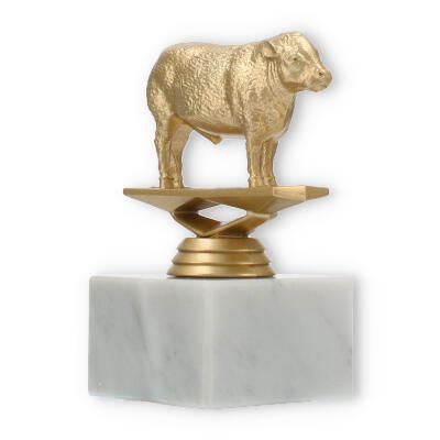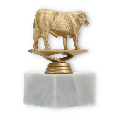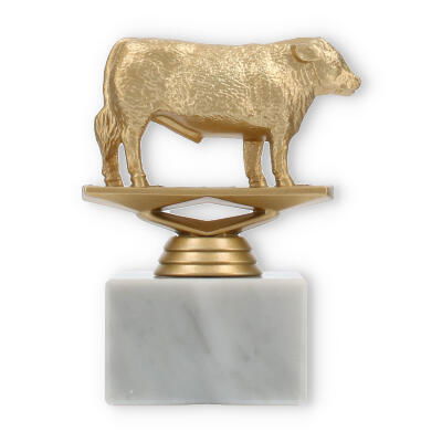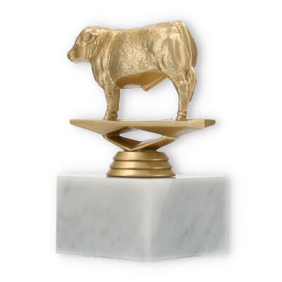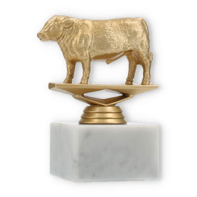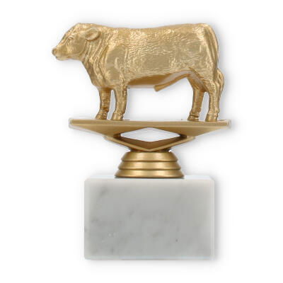 Descubre el trofeo figura de toro: una pieza impactante para honrar a los mejores. Con su figura de plástico color dorado y base de mármol blanco, su diseño es perfecto para destacar en cualquier evento. Personalizable para añadir un toque único a cada premiación.
