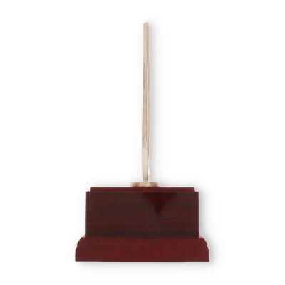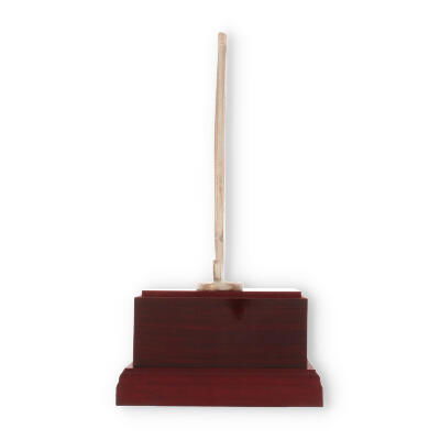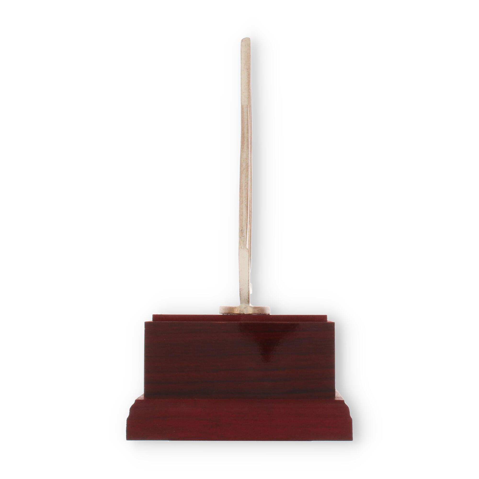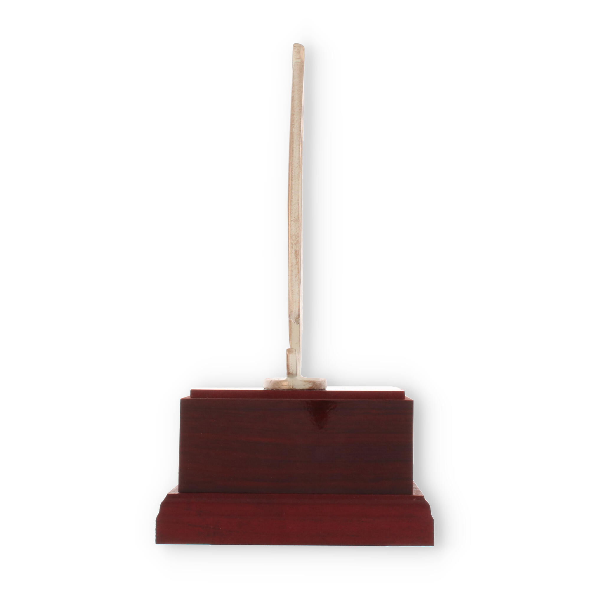 La base, con su acabado en color caoba, proporciona al trofeo una presencia robusta y atractiva, mientras que la figura en color dorado y blanco captura la esencia de la victoria con elegancia. La altura del trofeo, de 19,4 cm, se adapta perfectamente a la mano, brindando confort y presencia.