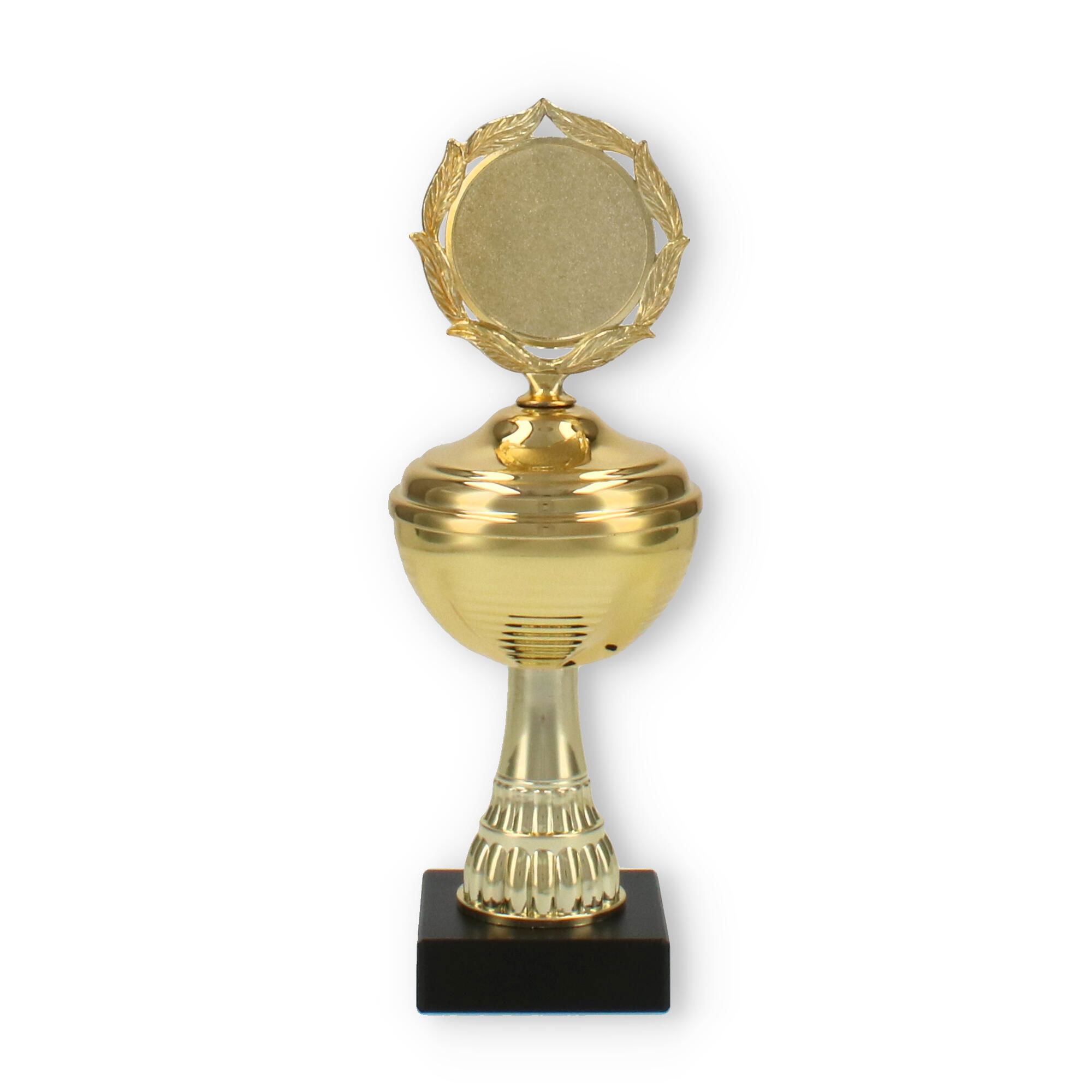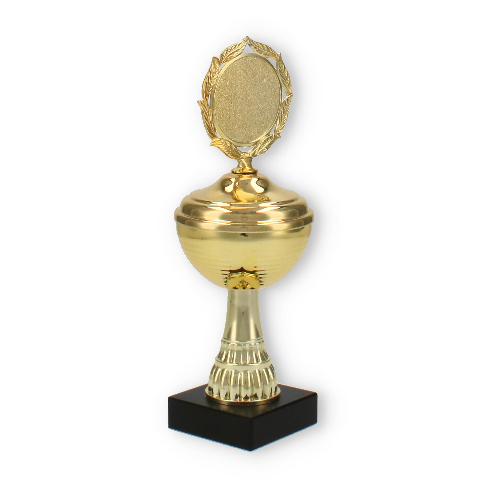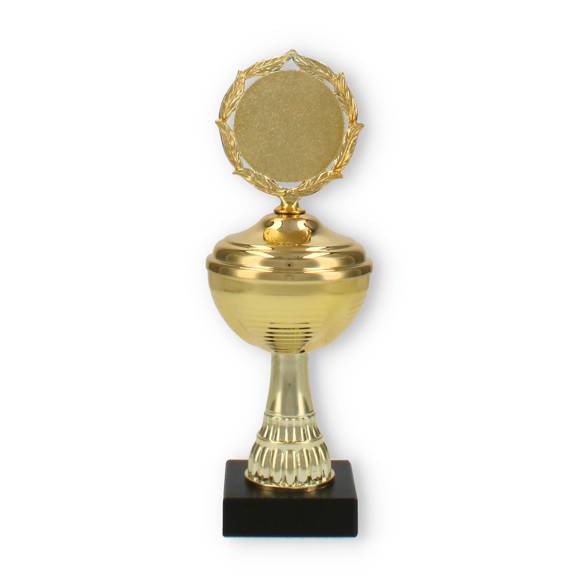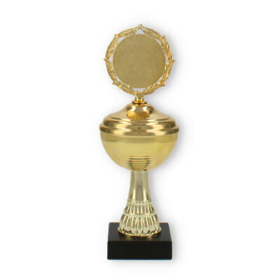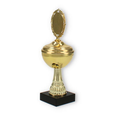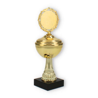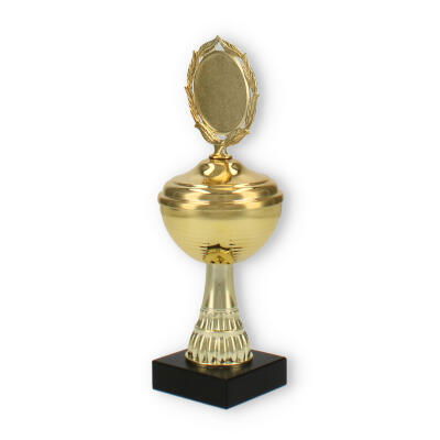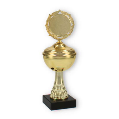 La estructura del trofeo, que combina un soporte de plástico resistente y detalles metálicos en color dorado, asegura tanto su durabilidad como su atractivo diseño. La pieza superior incluye un decorativo marco de laureles, simbolizando la victoria y agregando un elemento clásico al conjunto.