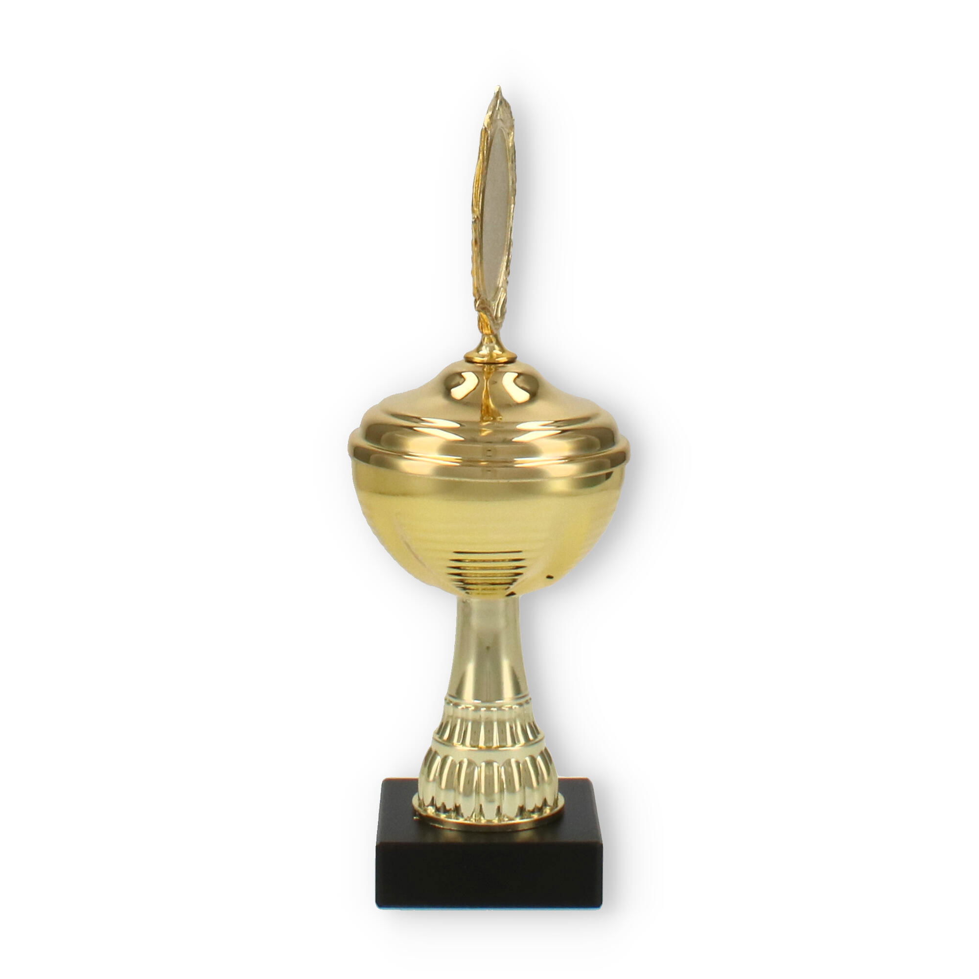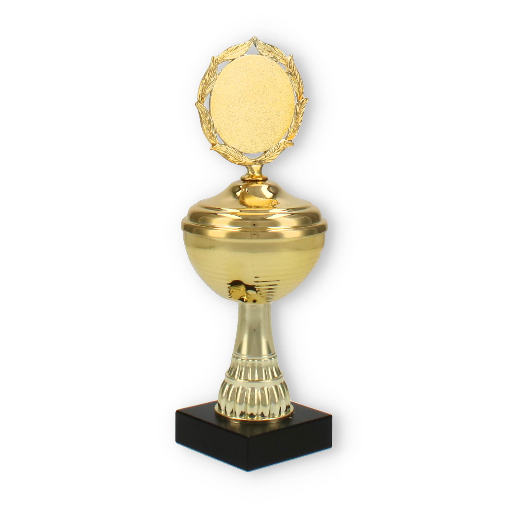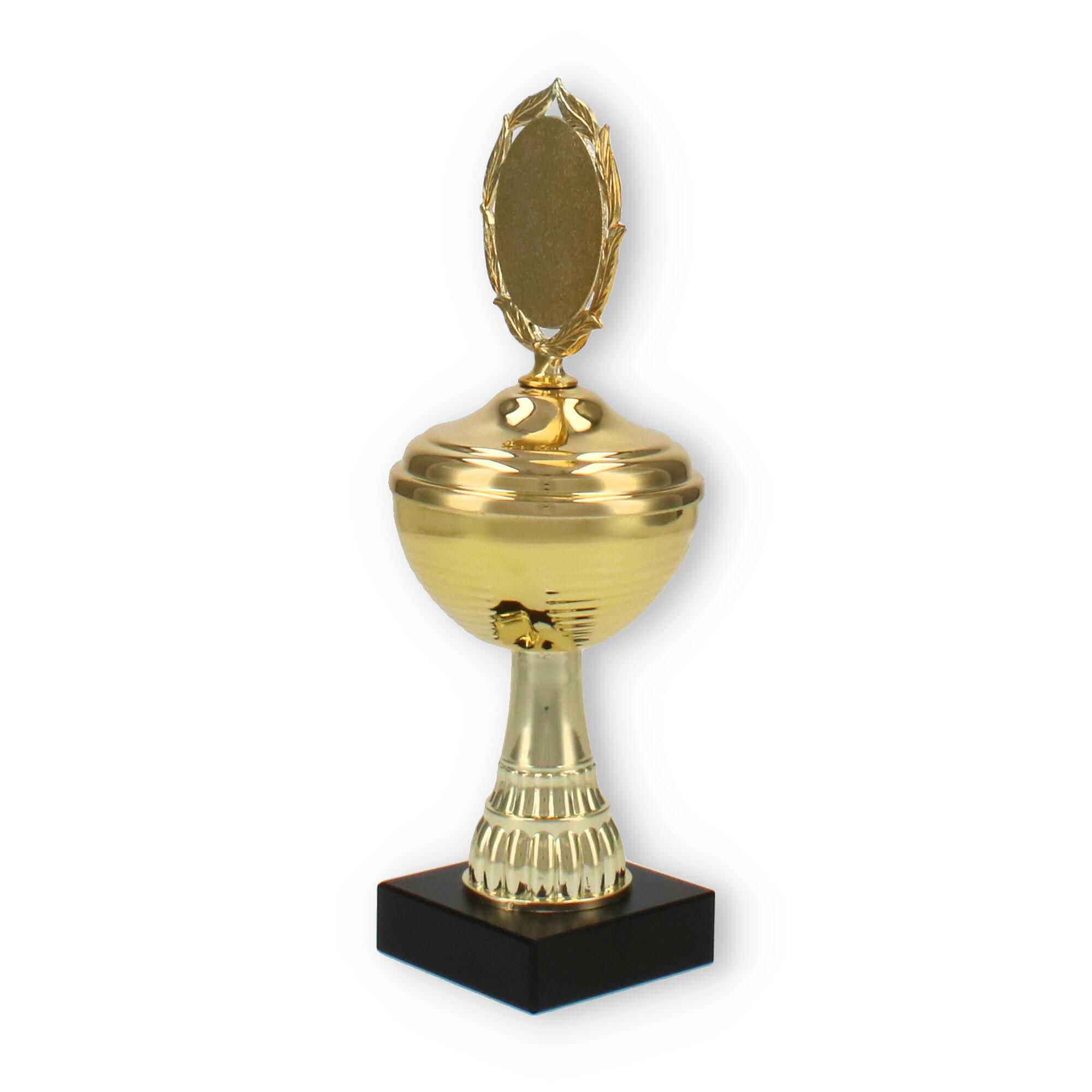 La estructura del trofeo, que combina un soporte de plástico resistente y detalles metálicos en color dorado, asegura tanto su durabilidad como su atractivo diseño. La pieza superior incluye un decorativo marco de laureles, simbolizando la victoria y agregando un elemento clásico al conjunto.