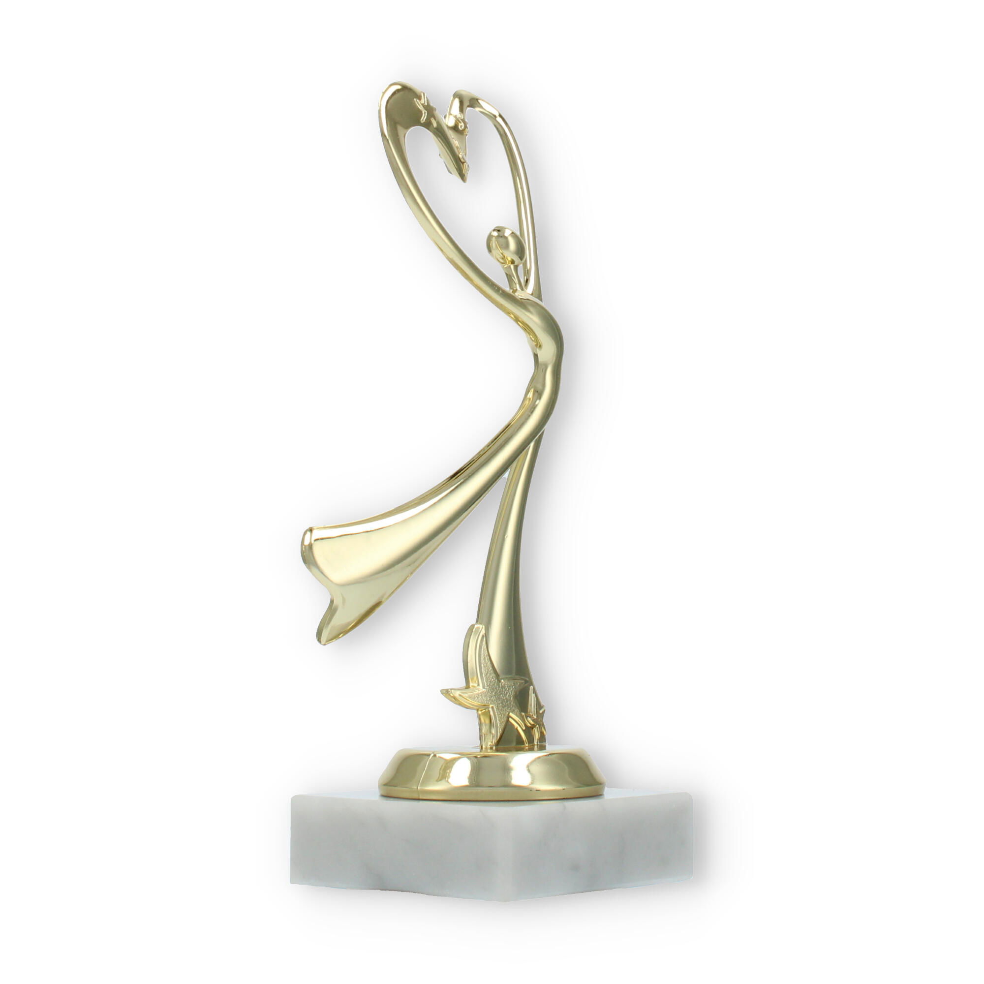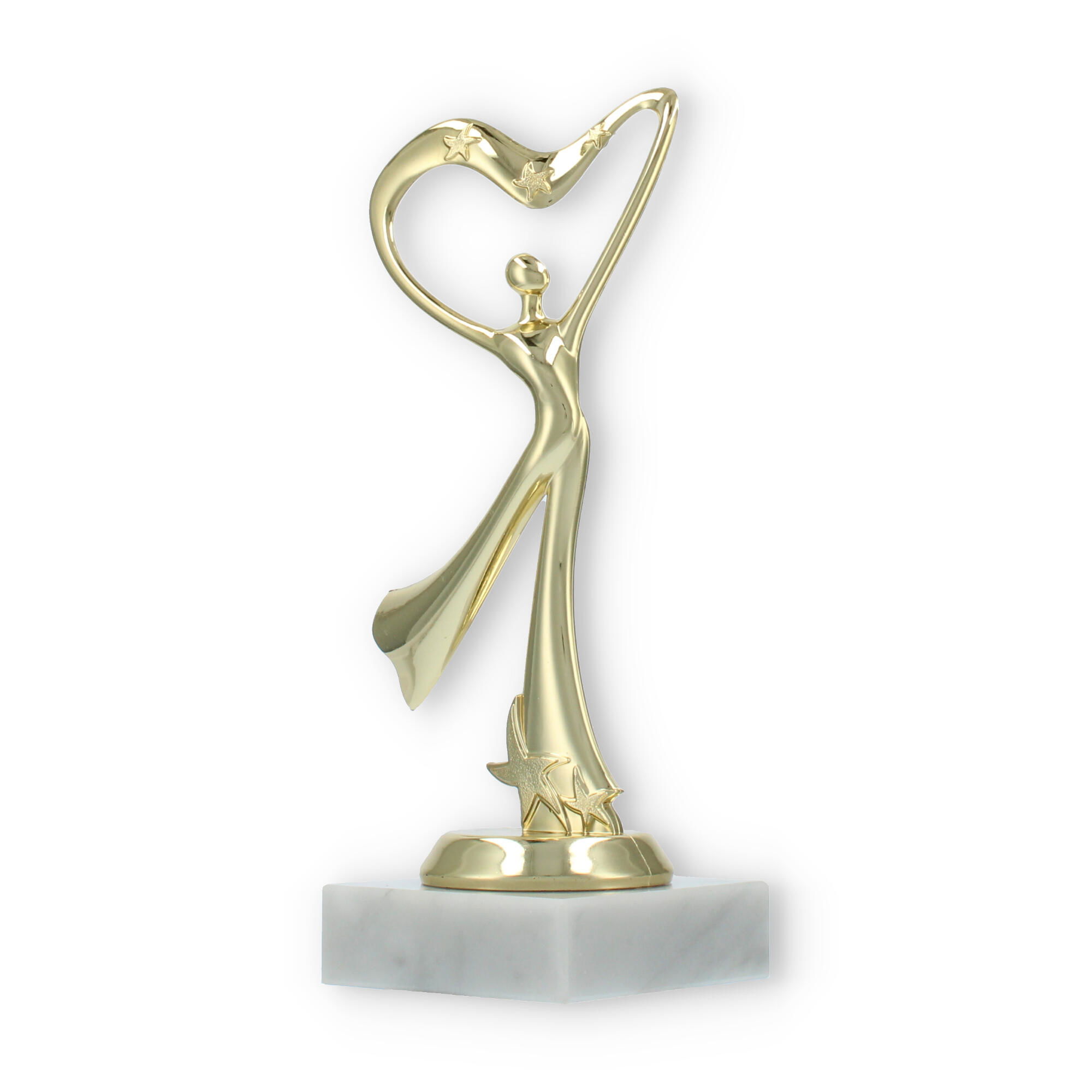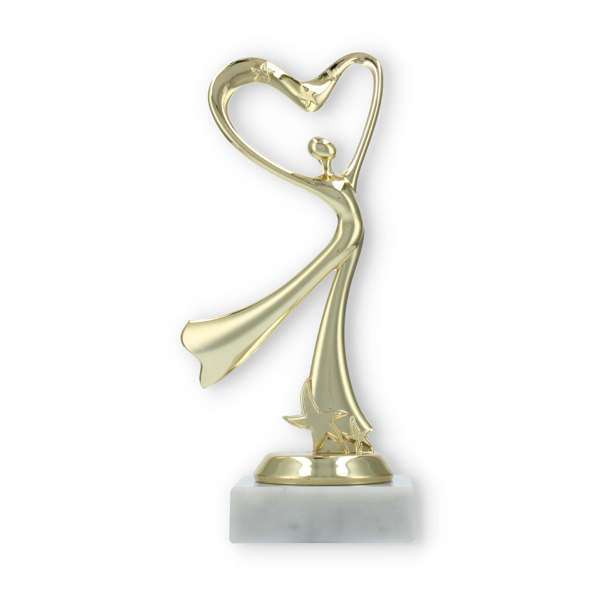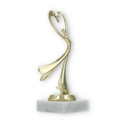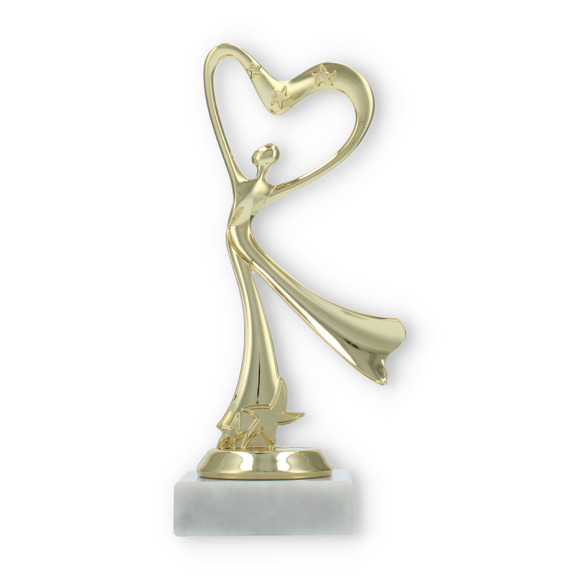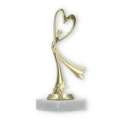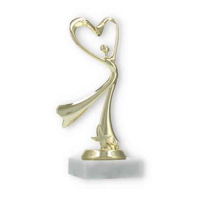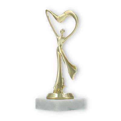 El trofeo presenta una figura central que parece bailar hacia un corazón estilizado en la parte superior. Esta representación simbólica es perfecta para aquellos eventos donde el amor por la danza y la expresión corporal son protagonistas.