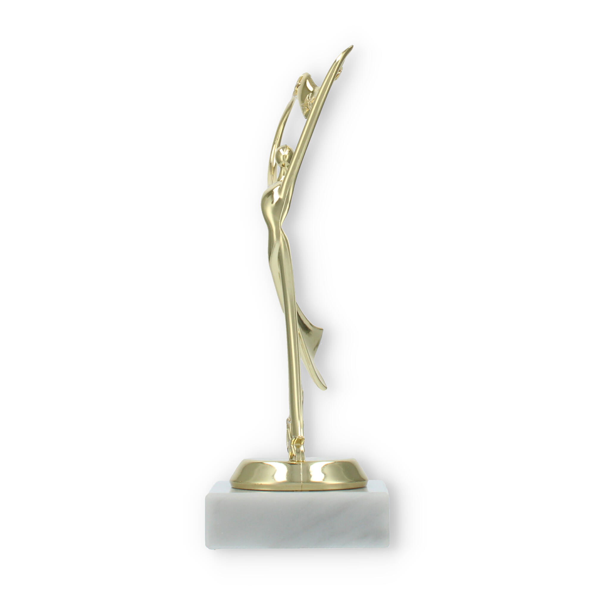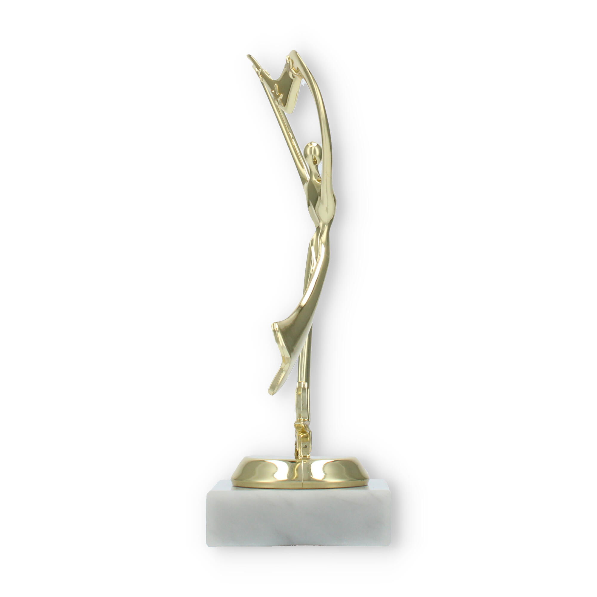 Los trofeos Danza Moderna son una expresión de elegancia y movimiento. Con un diseño que evoca el arte de la danza, estos trofeos capturan momentos de triunfo y celebración. La figura en color dorado ofrece un reflejo brillante, complementado por la solidez de su base de mármol blanco.
