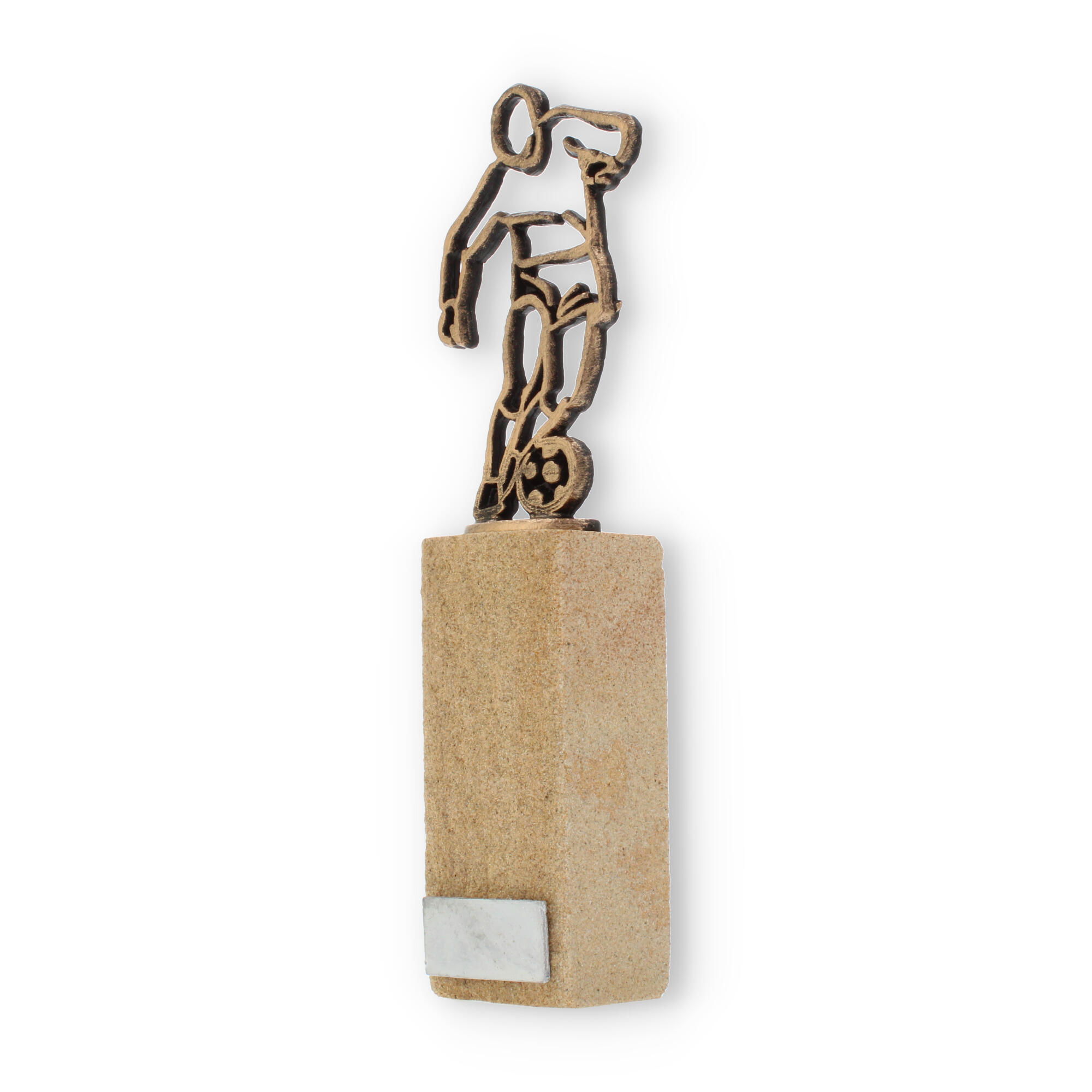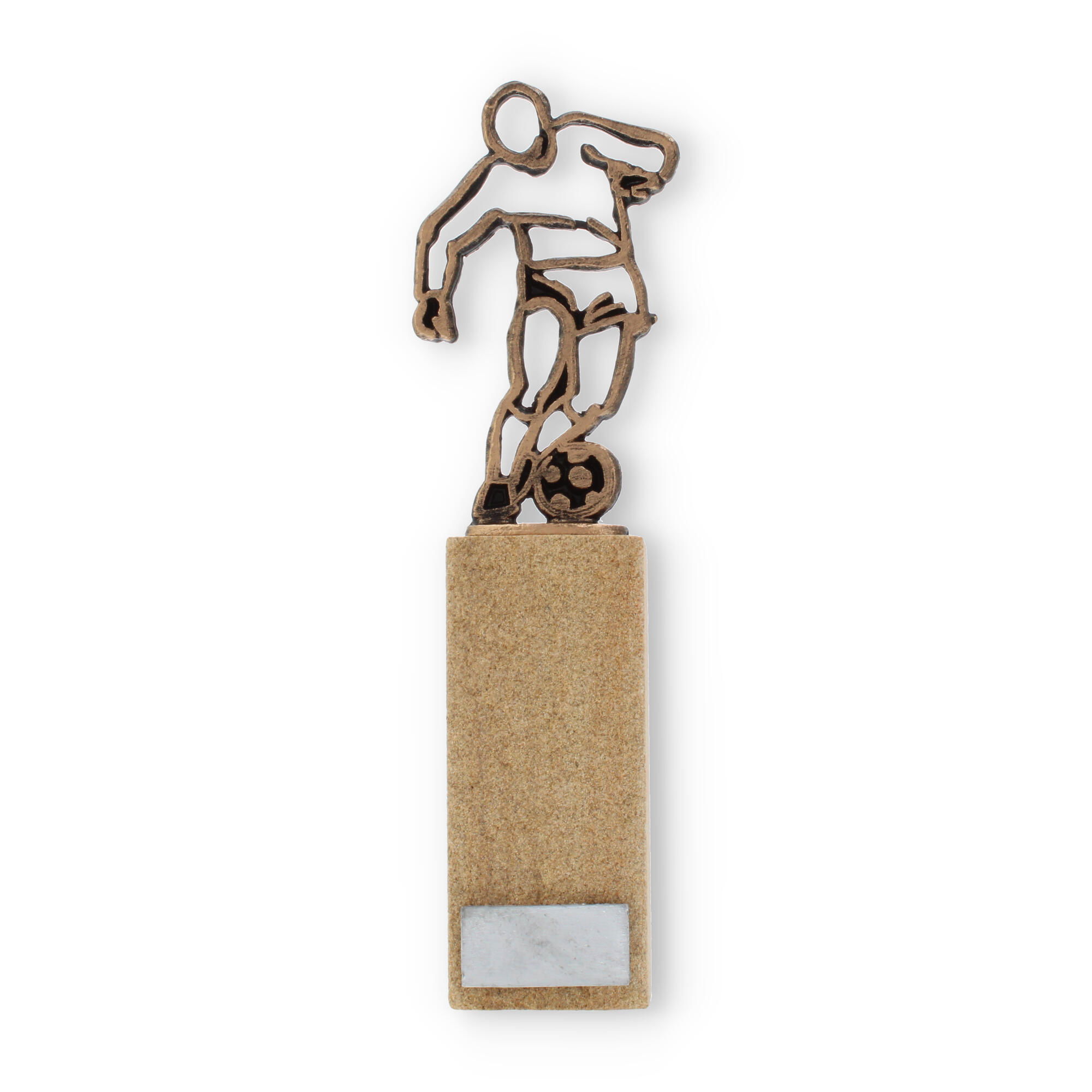 Tu cherches un trophée qui célèbre avec distinction une performance exceptionnelle dans le football ? La Coupe Figure de contour footballeur est idéale pour toi. Haute de 24,4 cm, cette coupe se distingue par sa silhouette élégante d’un joueur en pleine action, finement travaillée dans une teinte vieux or.