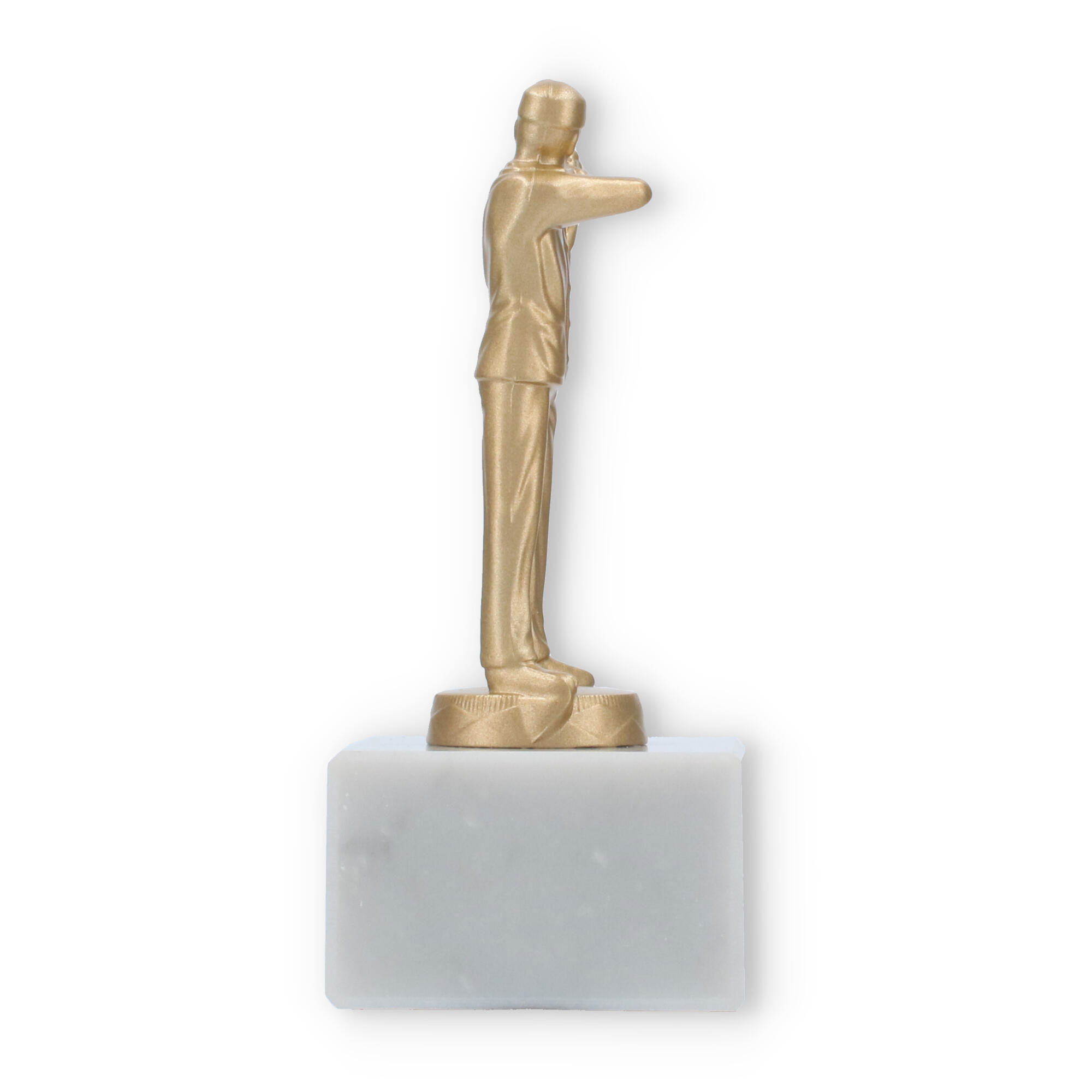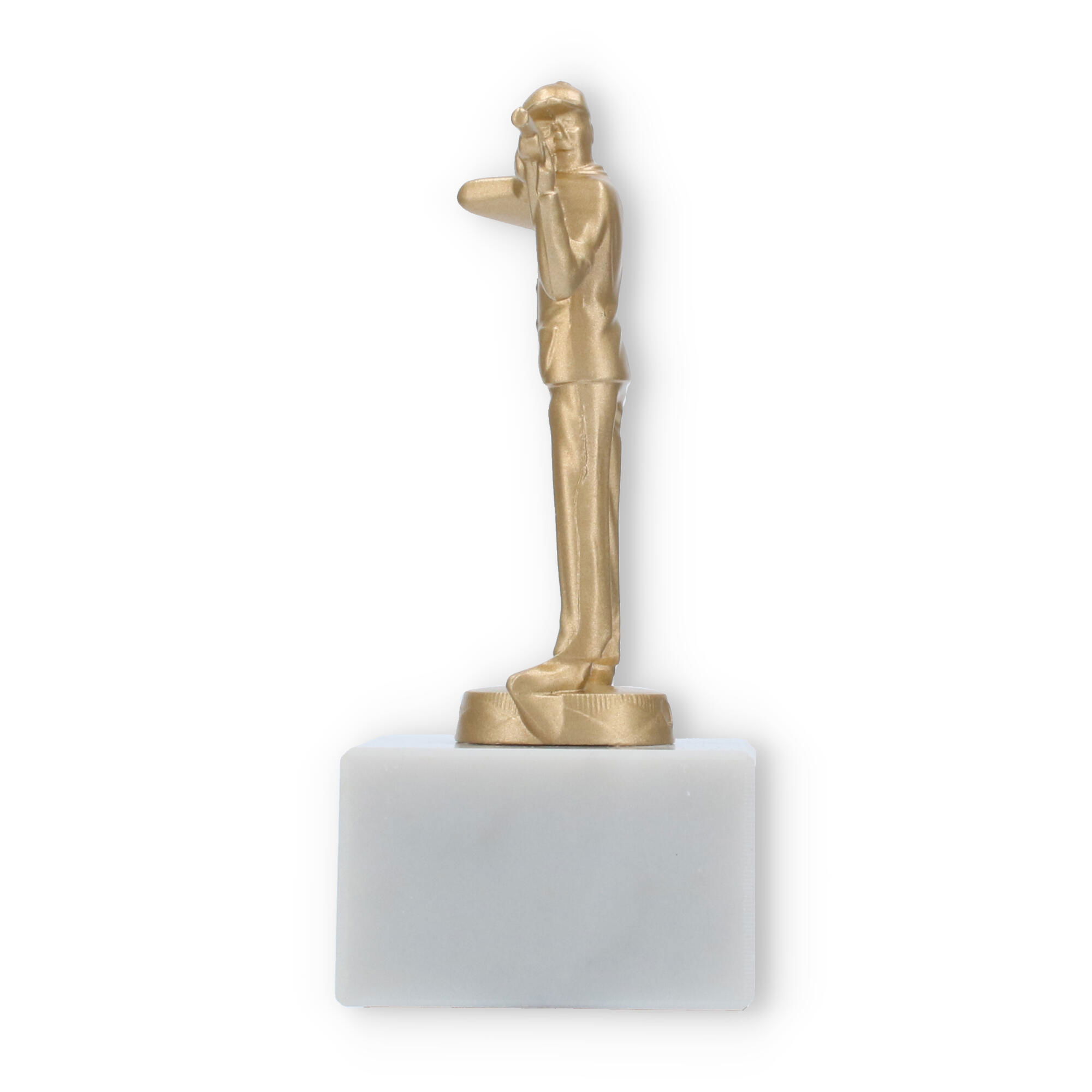 Le contraste entre la couleur dorée de la figure et la teinte blanche polie du socle en marbre crée une esthétique harmonieuse qui attire les regards. Ce trophée de 14 cm de hauteur est suffisamment compact pour être exposé fièrement sans occuper trop d'espace.
