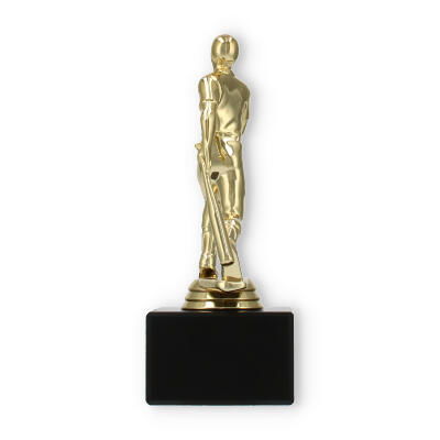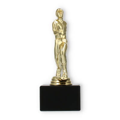 Le socle en marbre noir contraste élégamment avec la figurine dorée, créant une base solide et distinguée pour cette coupe. Le marbre noir, aussi exceptionnel que durable, assure non seulement une stabilité parfaite mais ajoute également une touche de sophistication à l'ensemble.