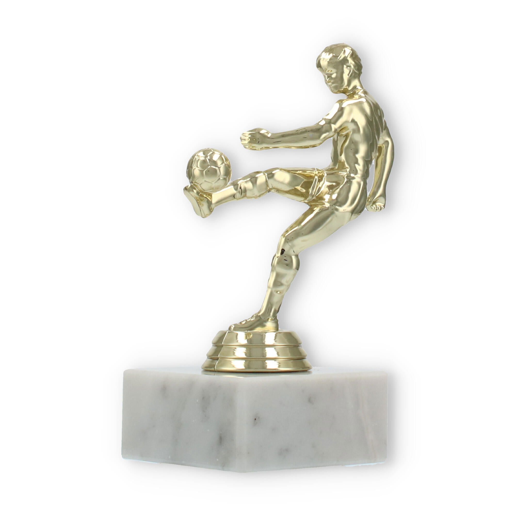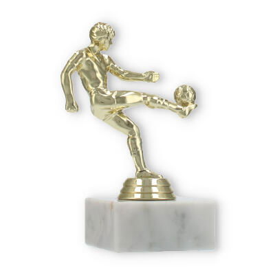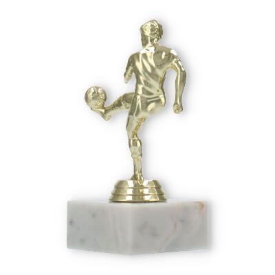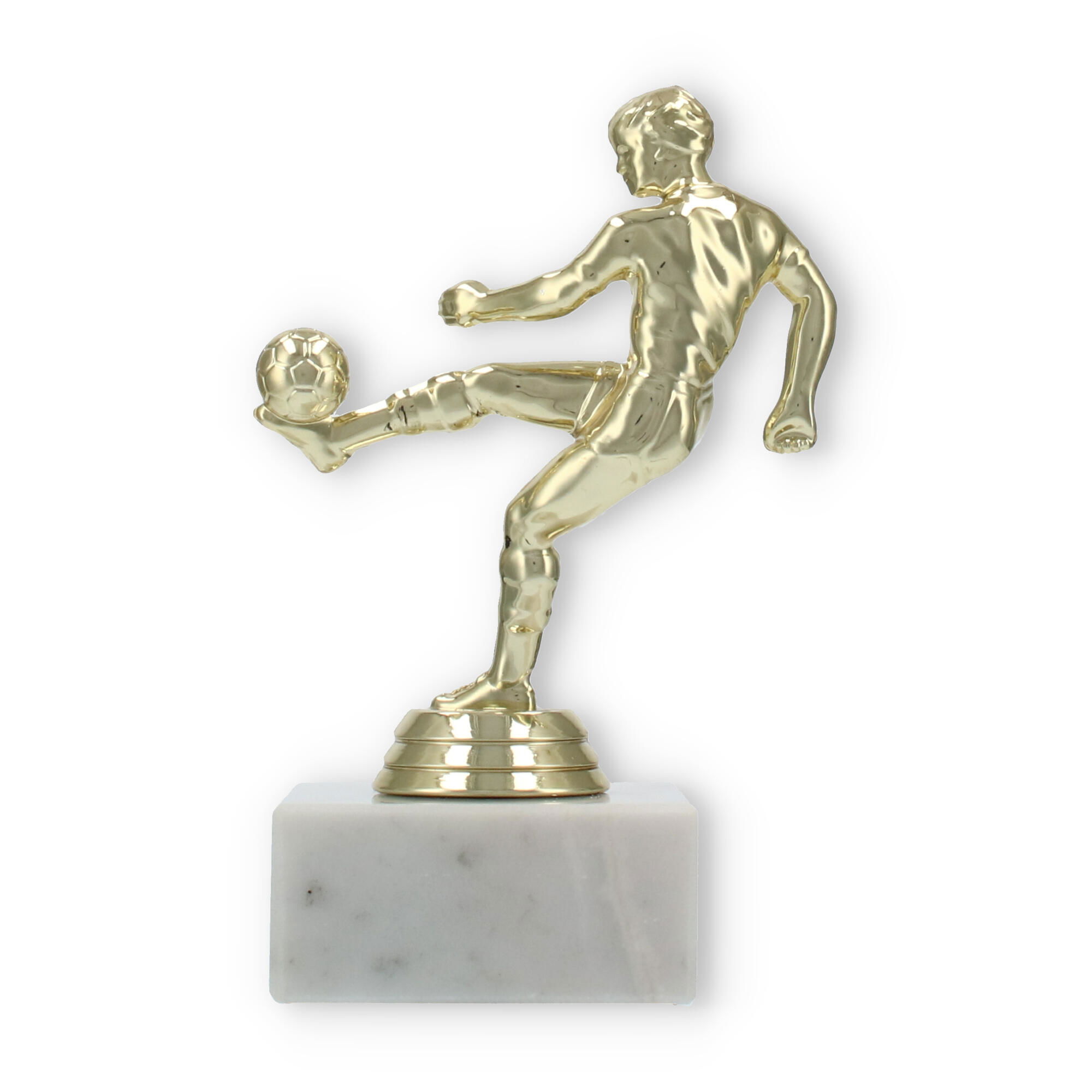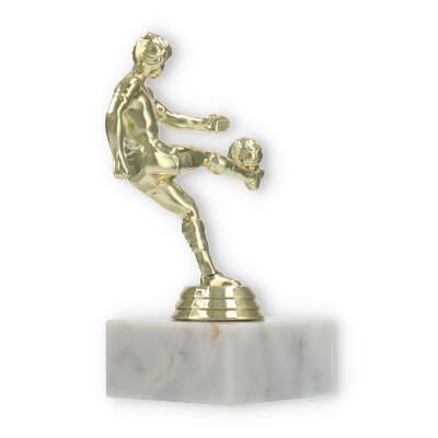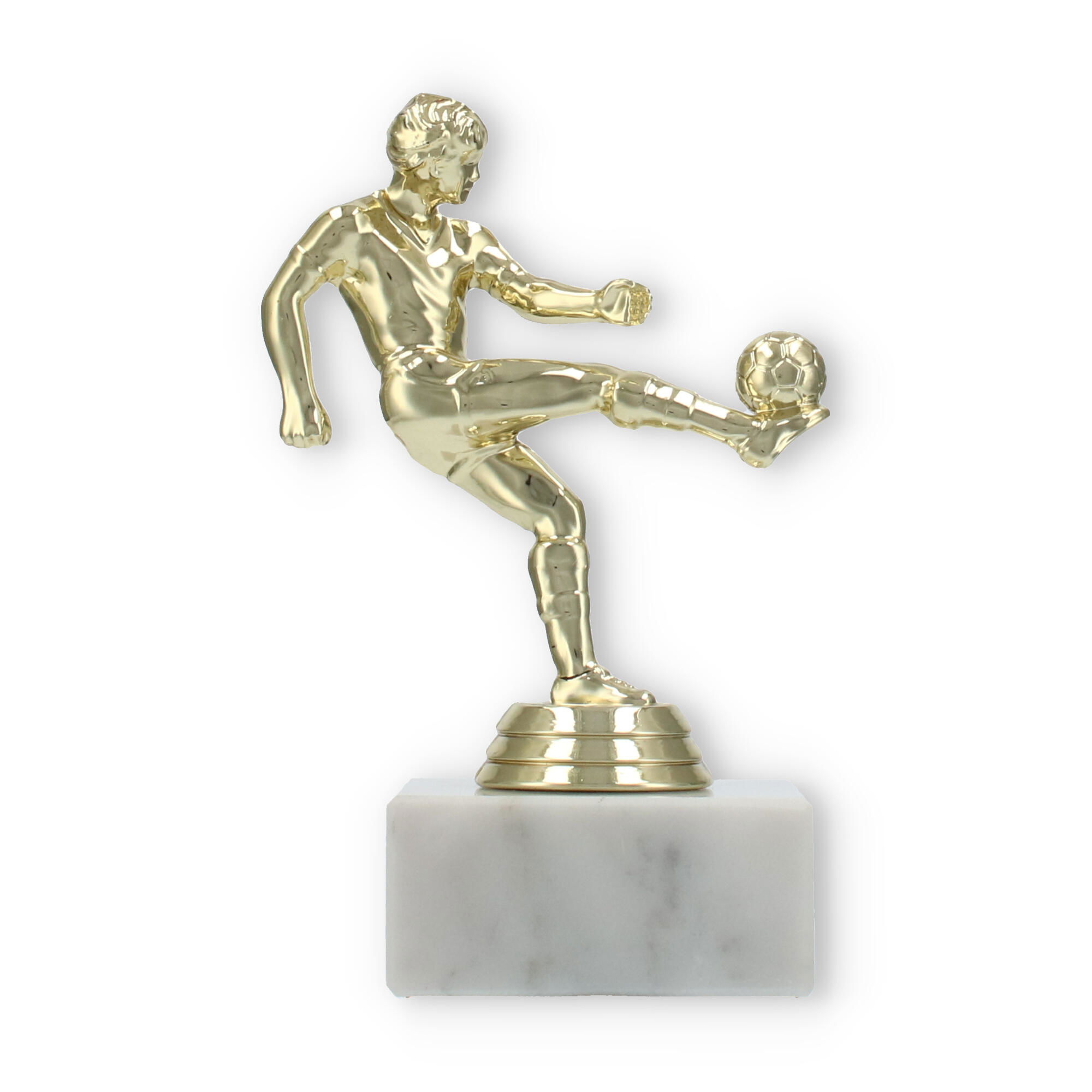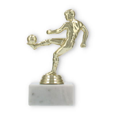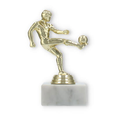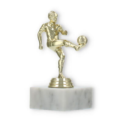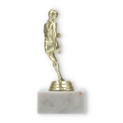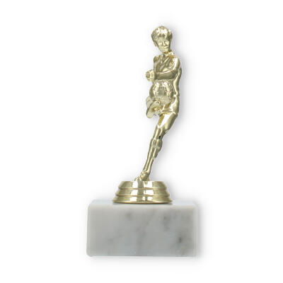 Cette figurine, mesurant 14,0 cm de hauteur, est conçue pour être robuste et élégante, grâce à une base en marbre blanc et un joueur de football en plastique or brillant. La combinaison de ces matériaux crée une pièce attrayante et durable.