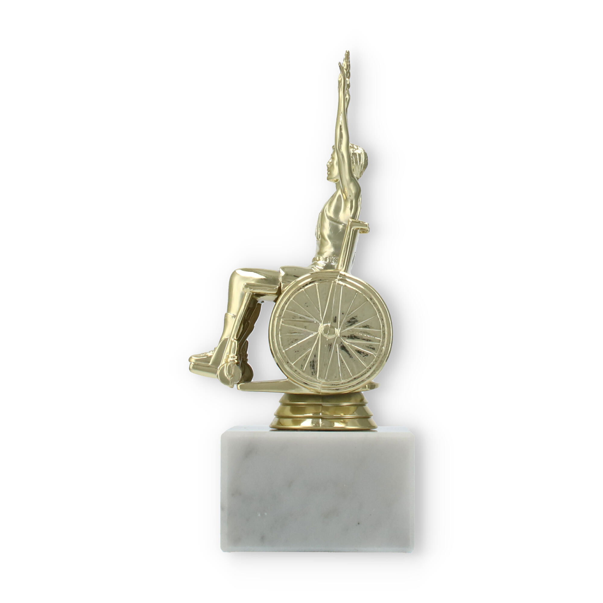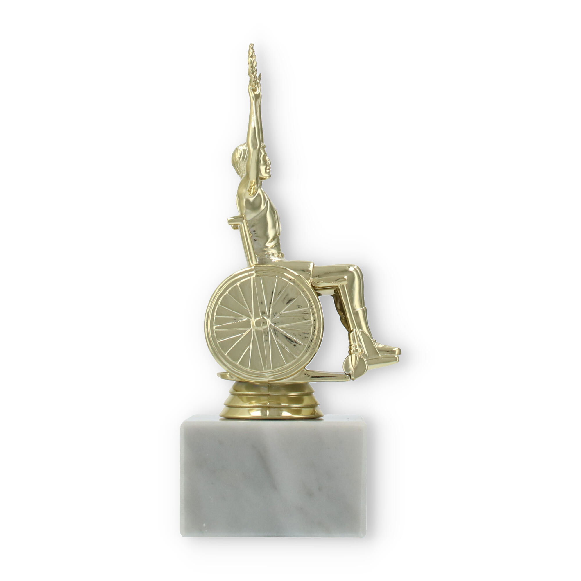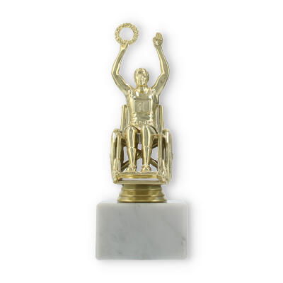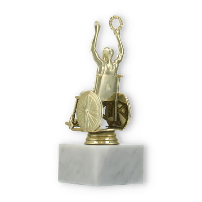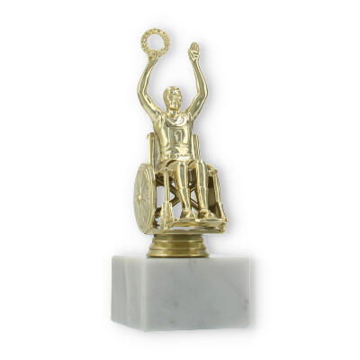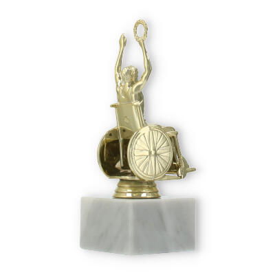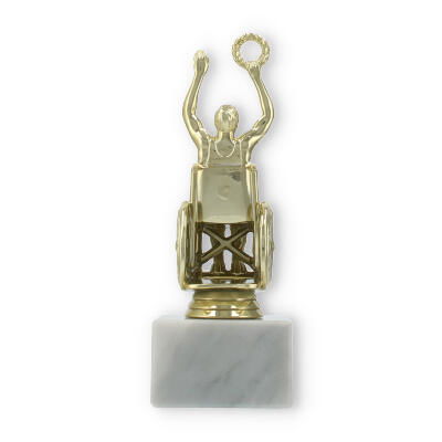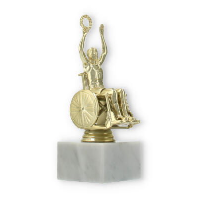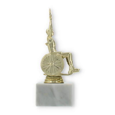 Le Trophée fauteuil roulant est conçu spécifiquement pour célébrer des prouesses incroyables dans le cadre des compétitions sportives en fauteuil roulant. La figurine dorée représente un athlète en position de victoire, tenant un laurier, symbole de triomphe et d'accomplissement. Celui-ci est monté sur un élégant socle en marbre blanc, apportant une touche de classe à chaque remise de prix.
