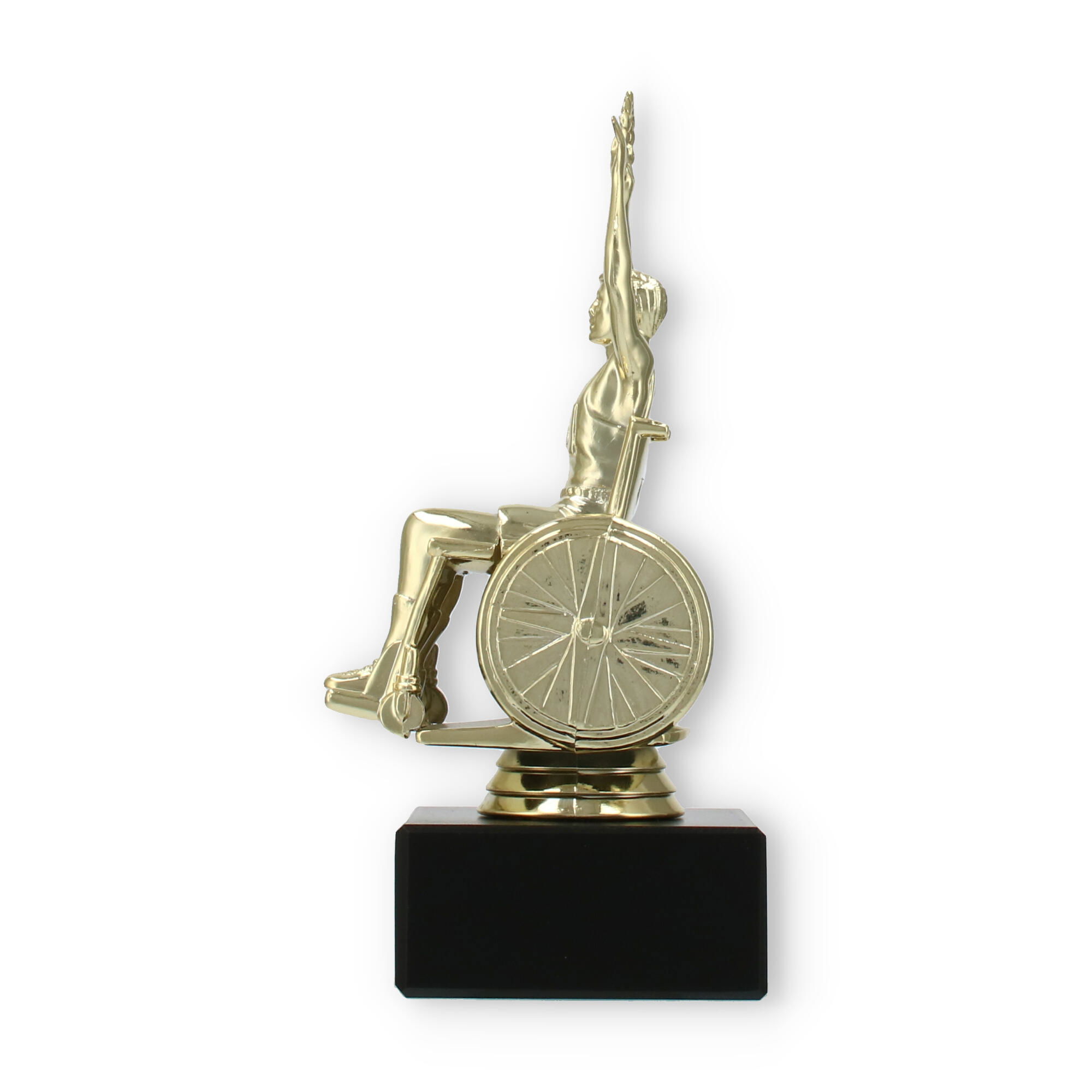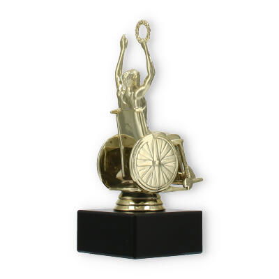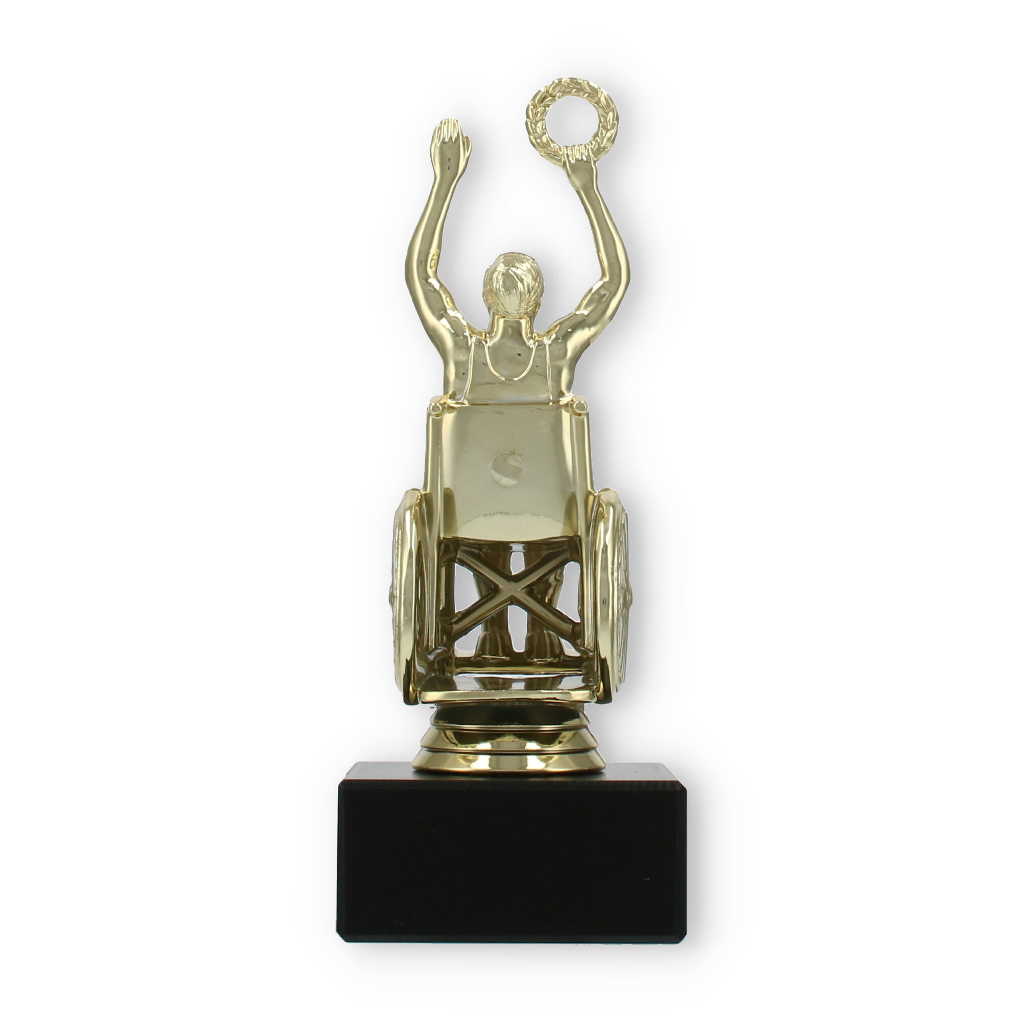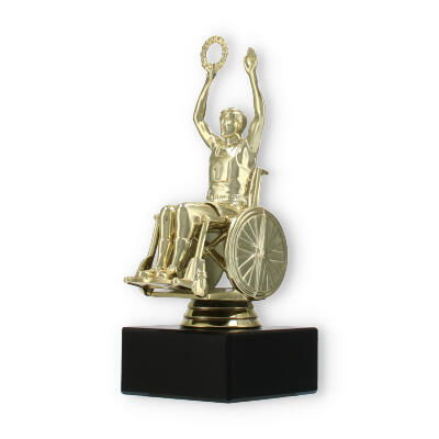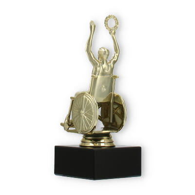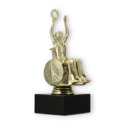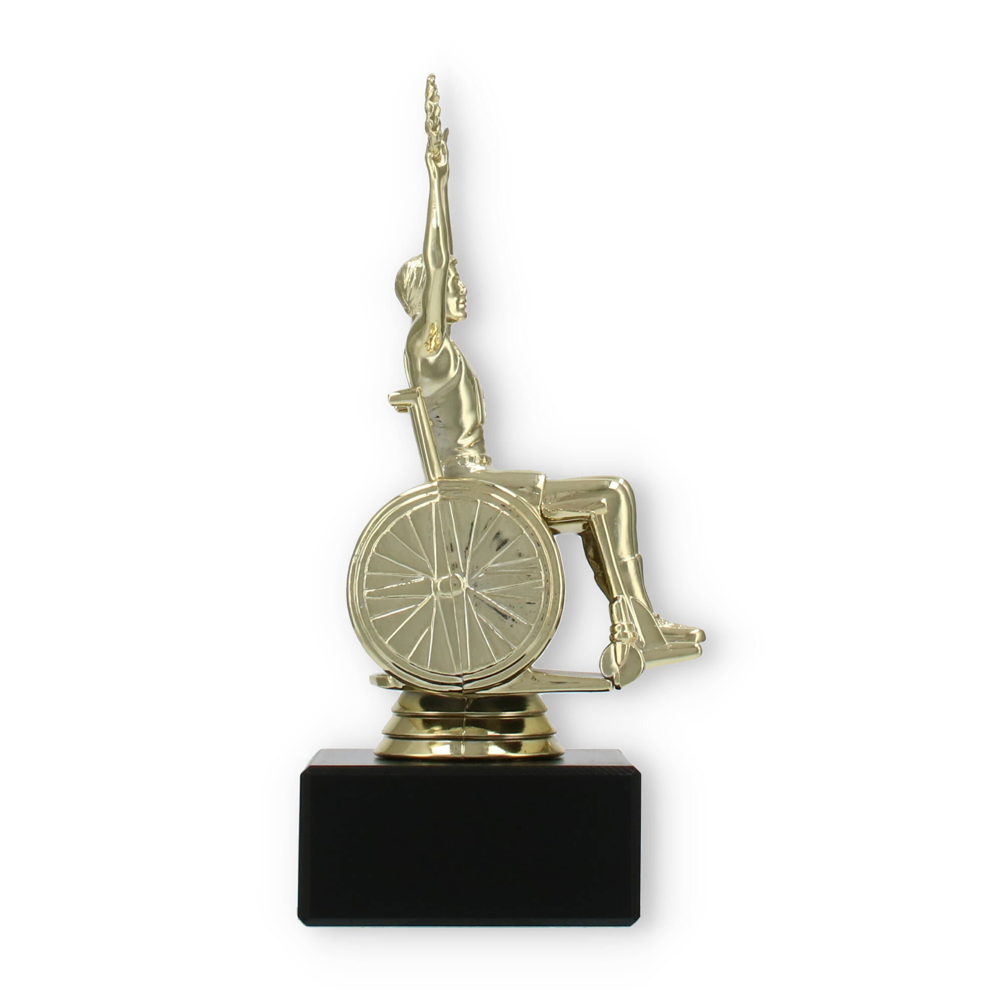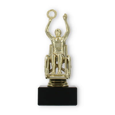 La coupe Fauteuil roulant or attire l'attention lors de chaque cérémonie de remise de prix. Avec son design unique, elle est spécialement conçue pour honorer les athlètes en fauteuil roulant. La figure en plastique doré, représentant une personne en fauteuil roulant brandissant un laurier, capte immédiatement le regard et témoigne d'une reconnaissance méritée. Le socle en marbre noir ajoute une touche de prestige, rendant cette coupe particulièrement distinguée.