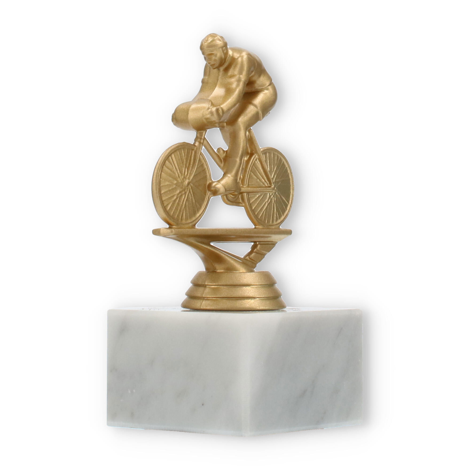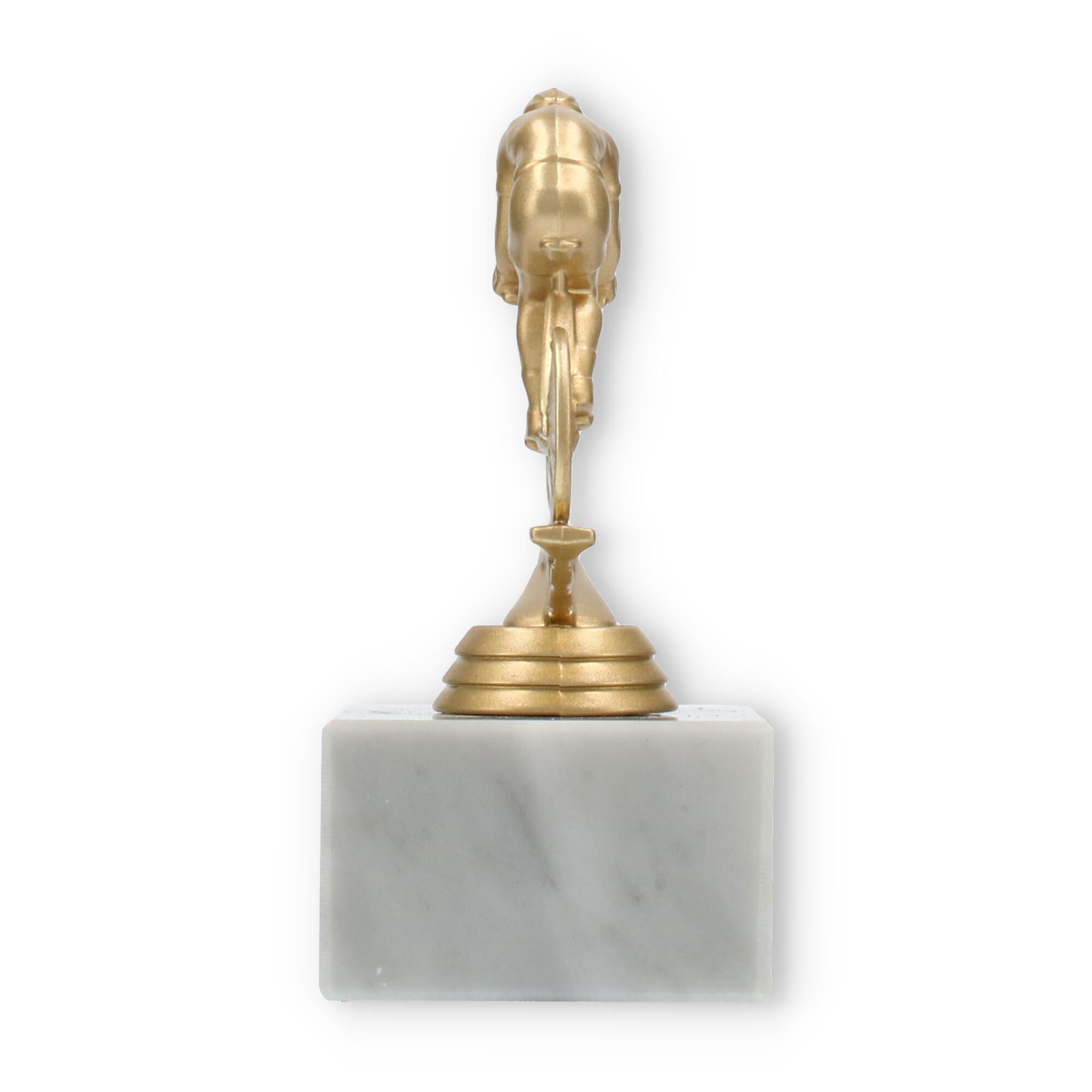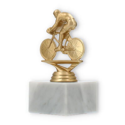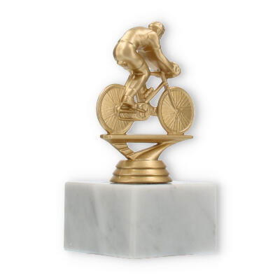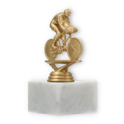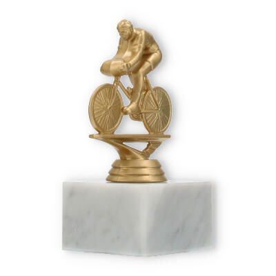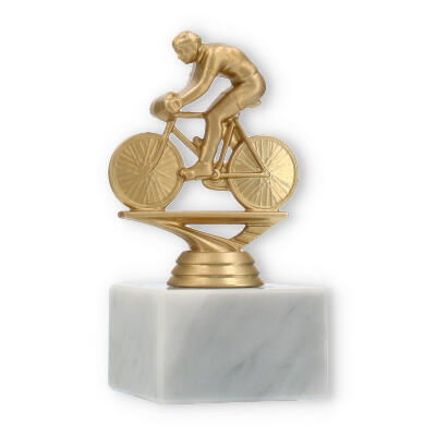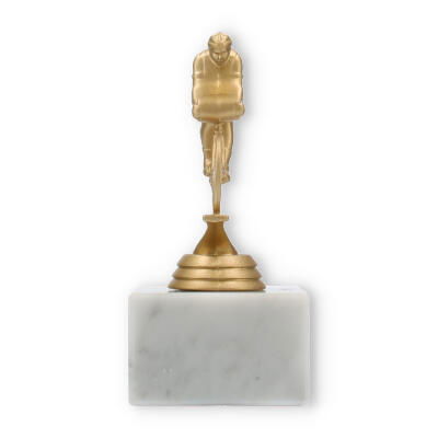 Fabriquée en plastique léger avec une impression dorée raffinée, la figure représente un cycliste en pleine action, capturant l'essence de la vitesse et de la détermination. Le cycliste est monté sur un socle en marbre blanc, ajoutant une touche de classe et de stabilité.