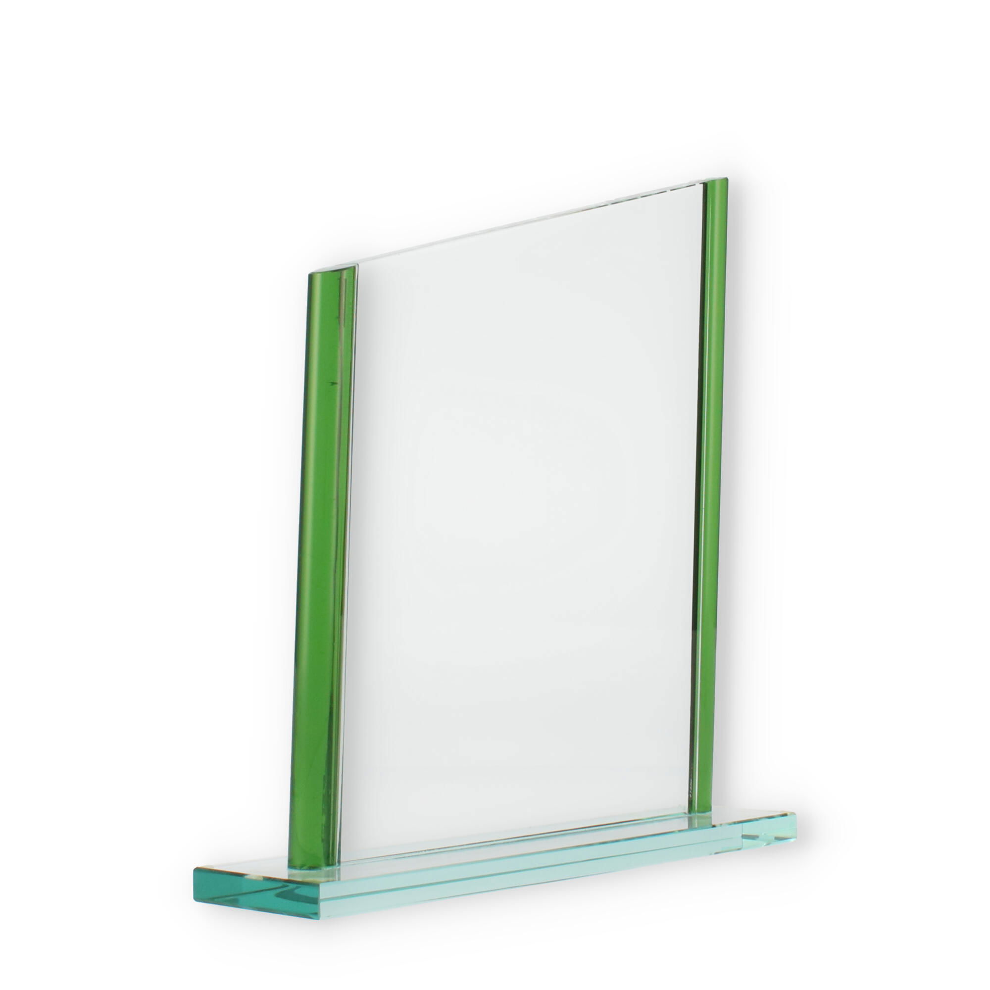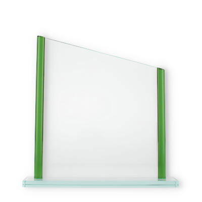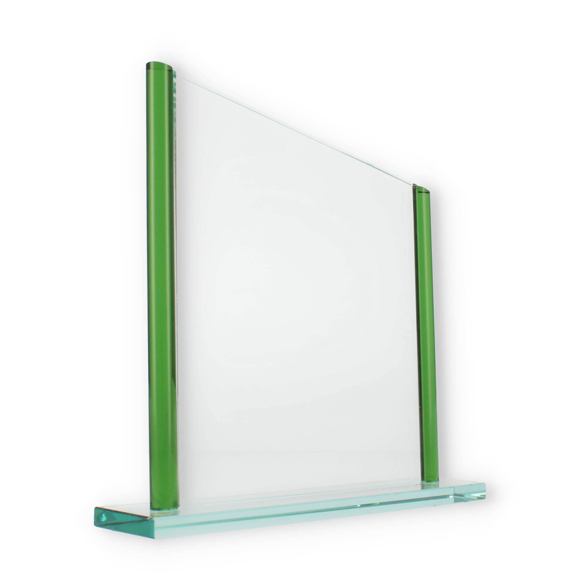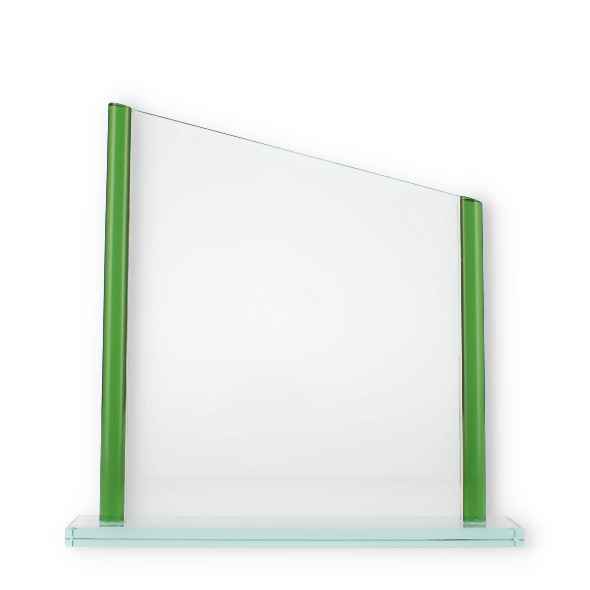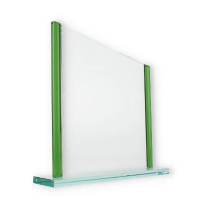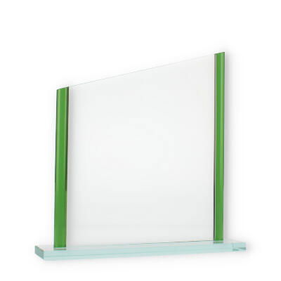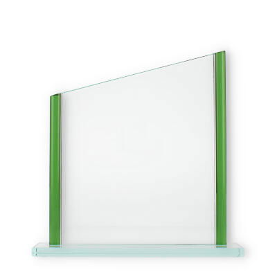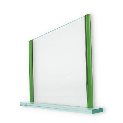Die scharf geschliffenen Kanten und die polierten Glasflächen zeigen die Präzision und Qualität der Verarbeitung. Die seitlich angebrachten grünen Glasleisten setzen zusätzliche optische Akzente, die das moderne und elegante Erscheinungsbild unterstreichen.