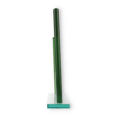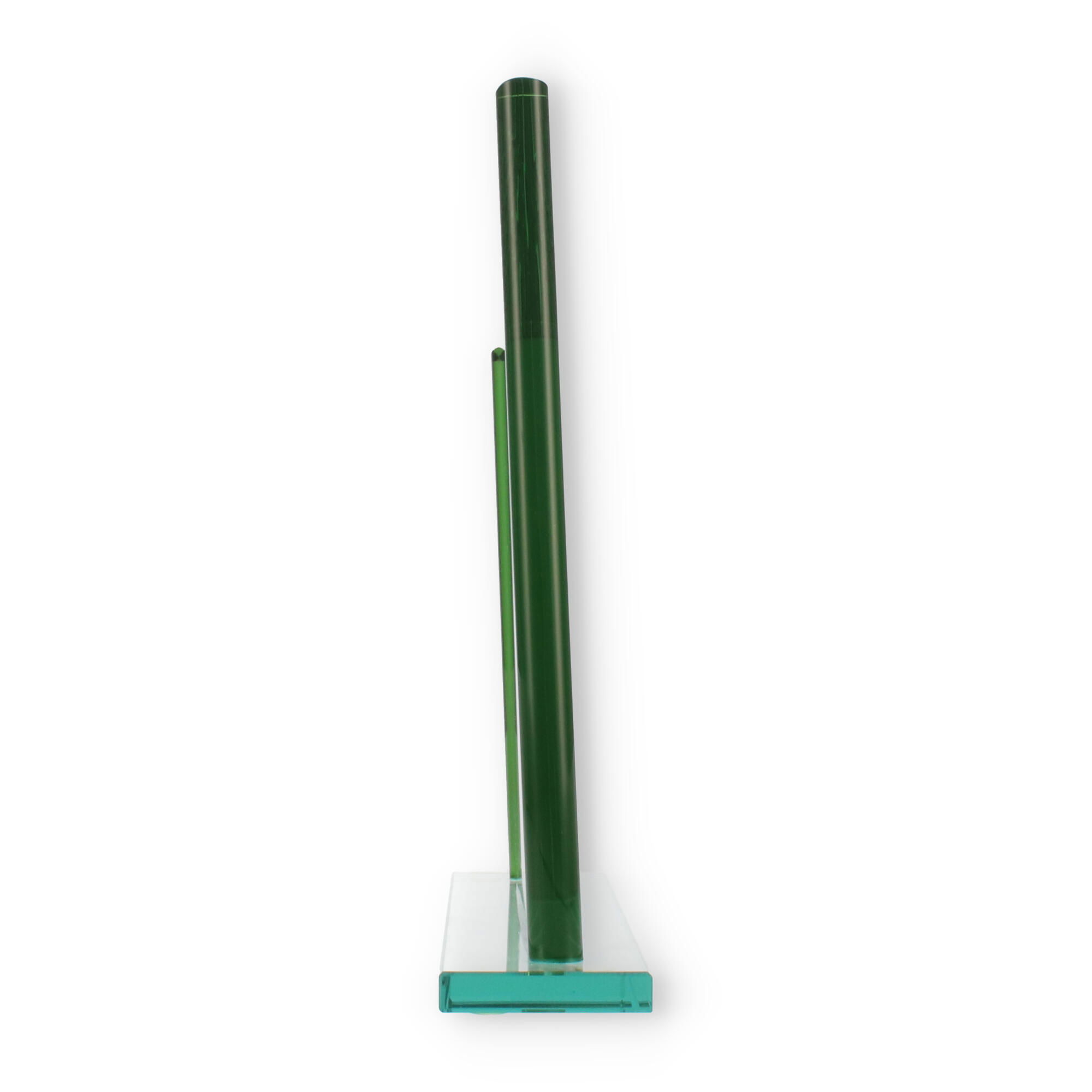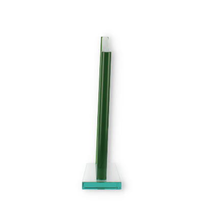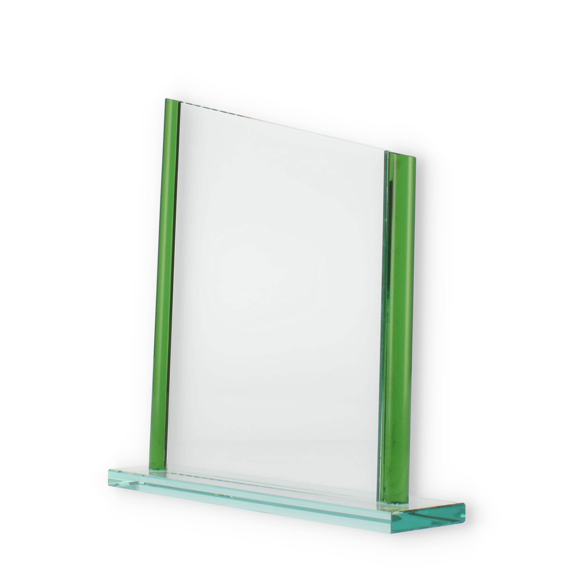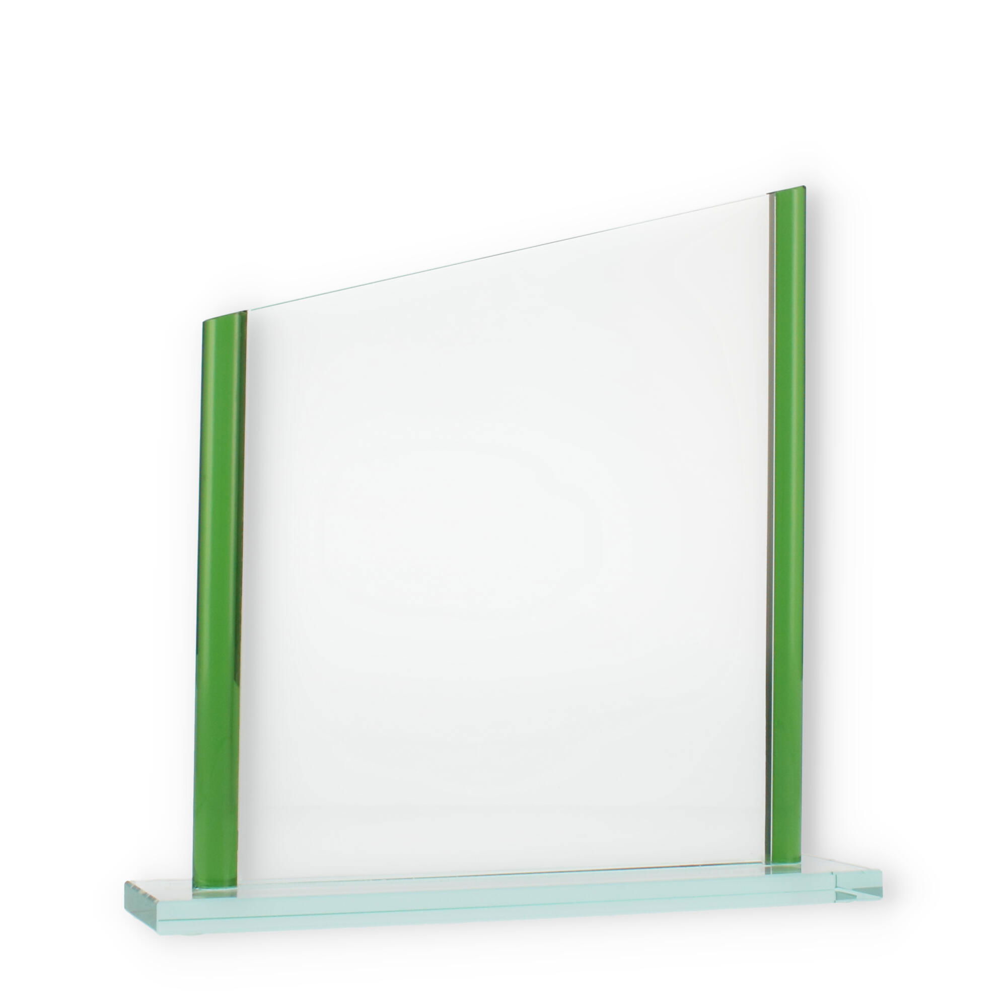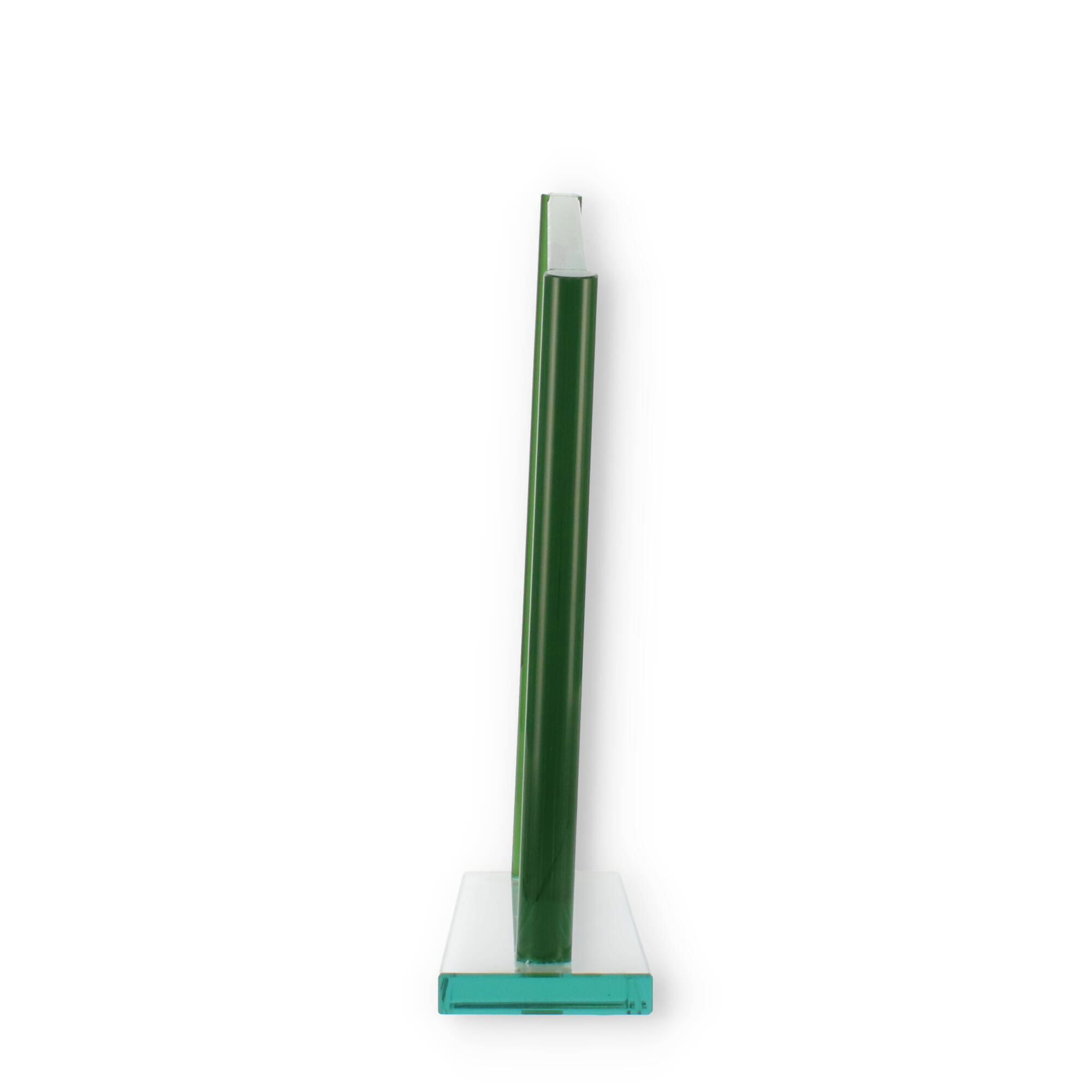 Die scharf geschliffenen Kanten und die polierten Glasflächen zeigen die Präzision und Qualität der Verarbeitung. Die seitlich angebrachten grünen Glasleisten setzen zusätzliche optische Akzente, die das moderne und elegante Erscheinungsbild unterstreichen.