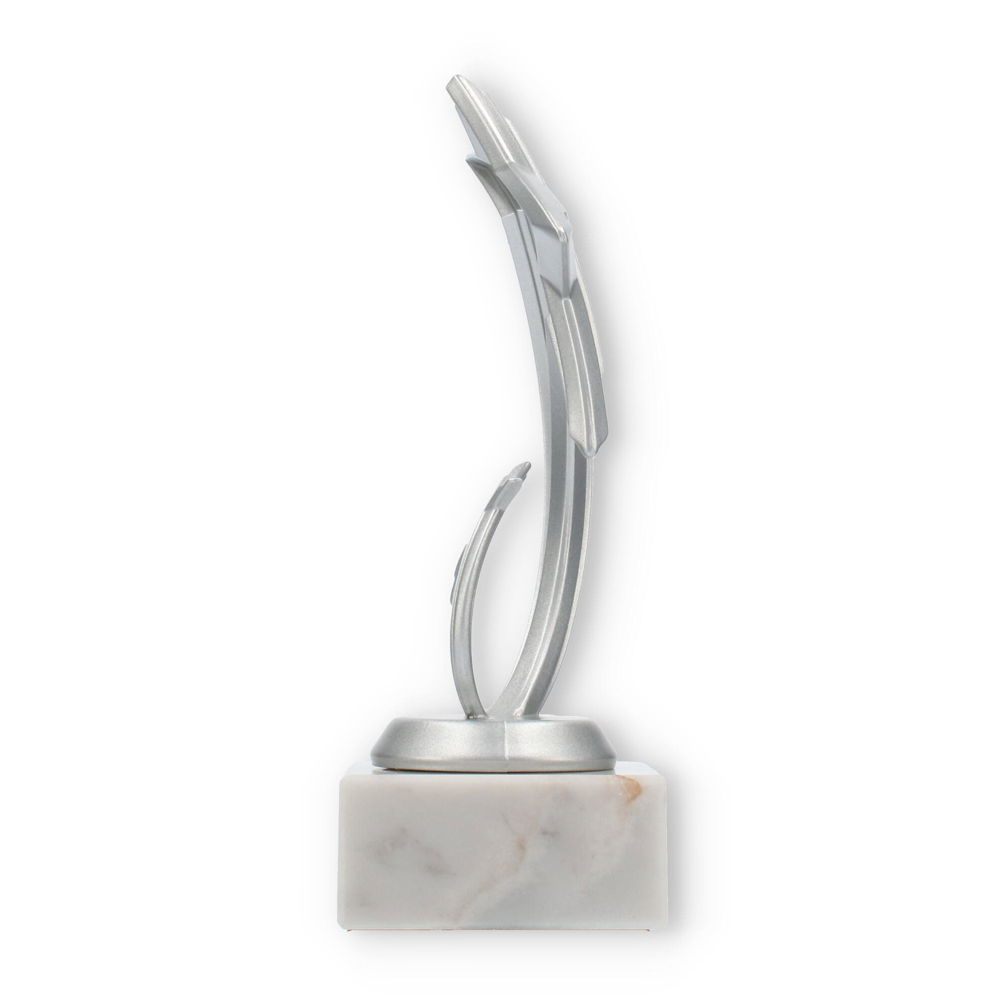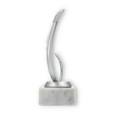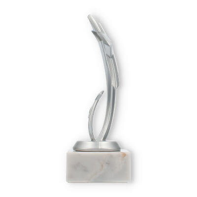 Il supporto in marmo bianco aggiunge una nota di eleganza e stabilità al trofeo, creando un contrasto armonioso con la lucentezza dei due elementi metallici. Le venature grigiastre del marmo conferiscono un aspetto unico e naturale alla base.