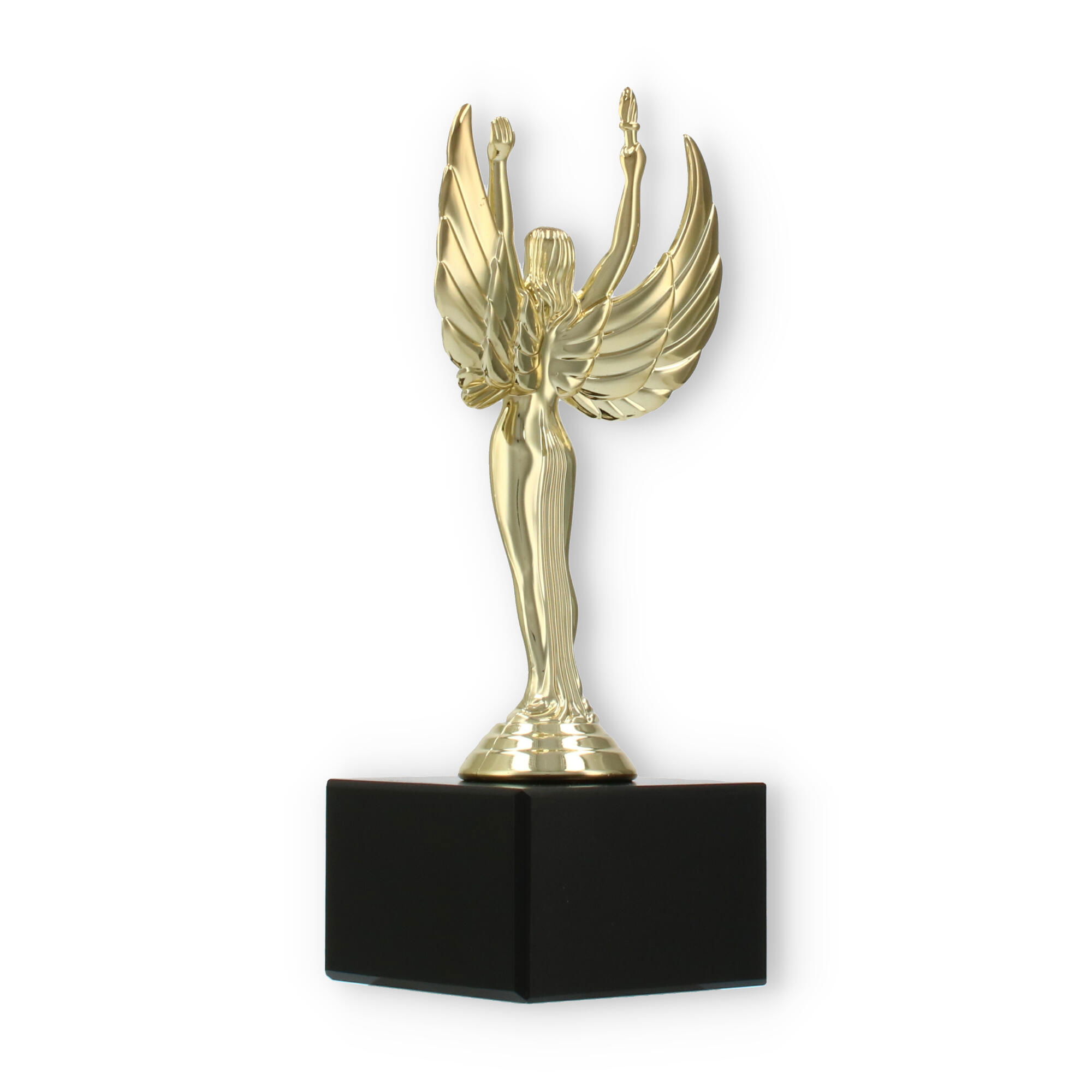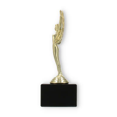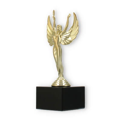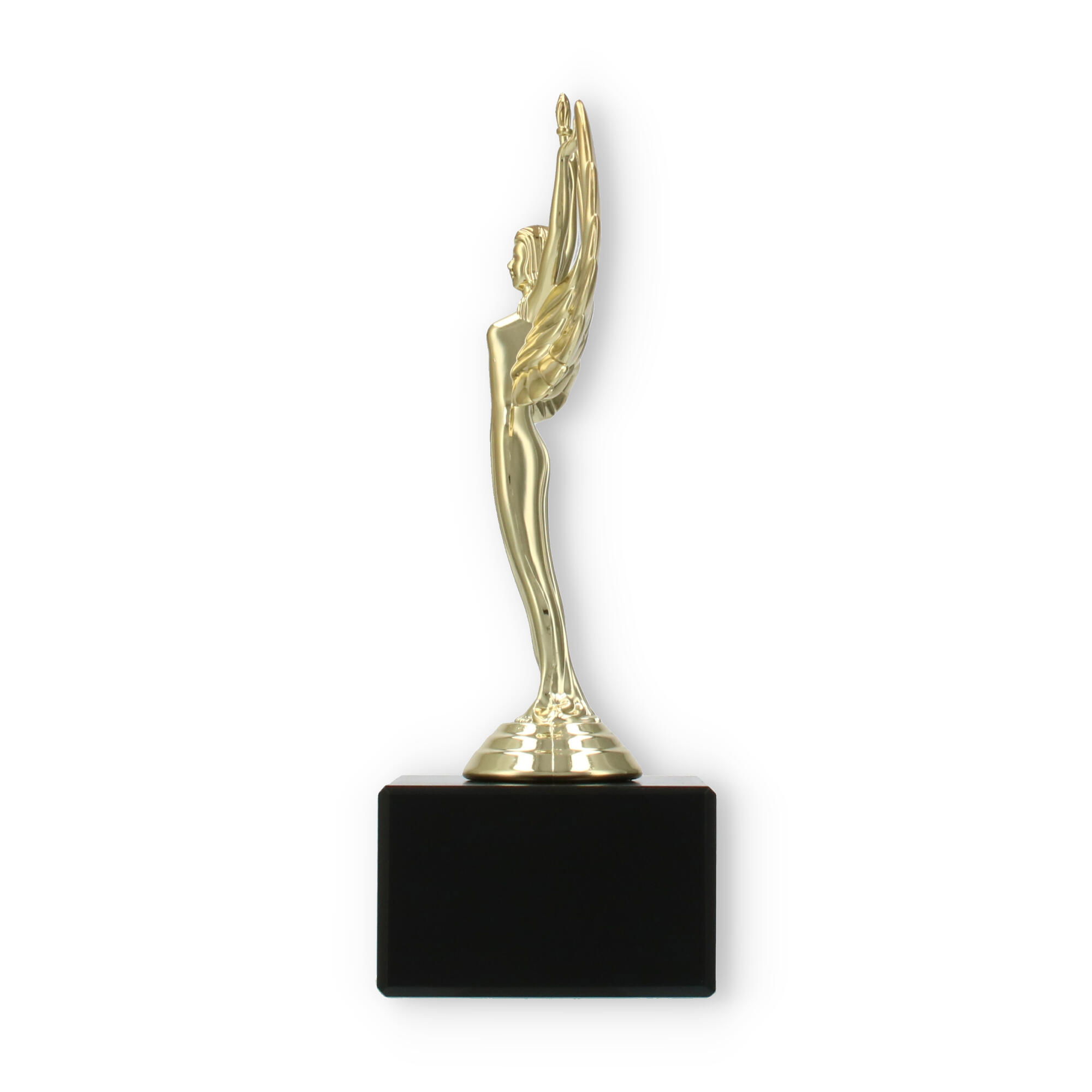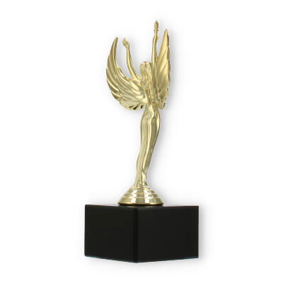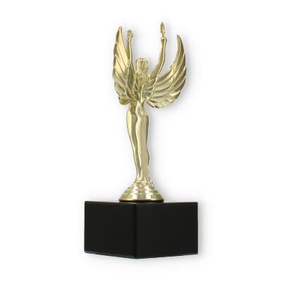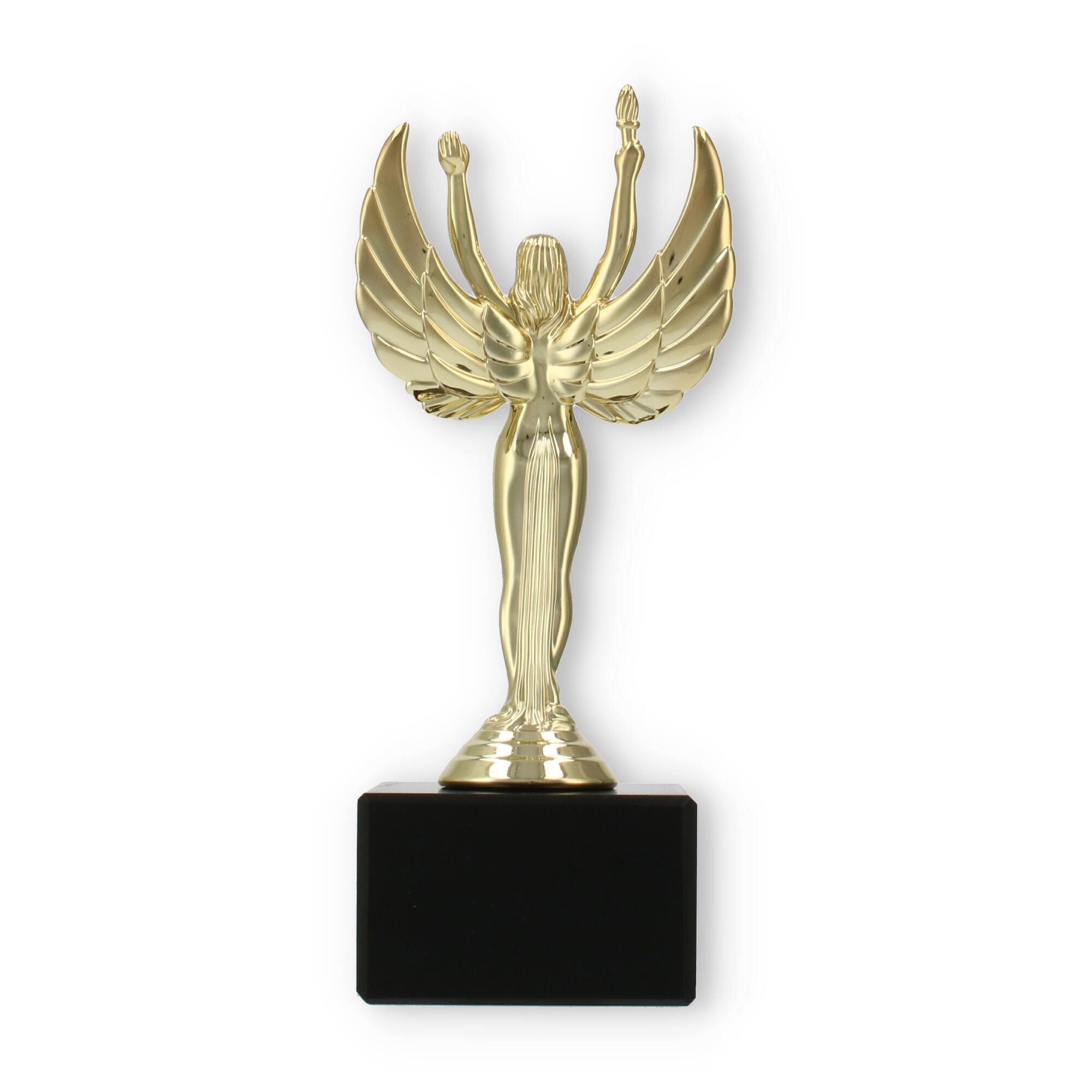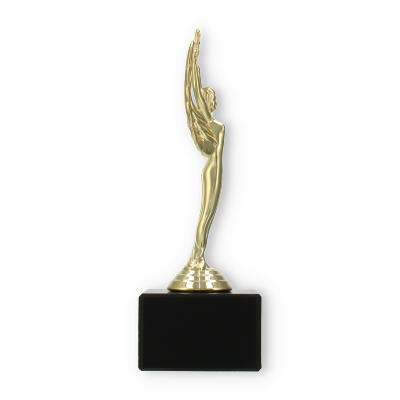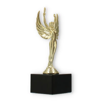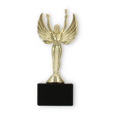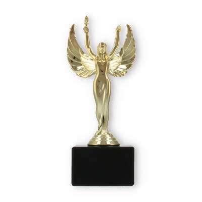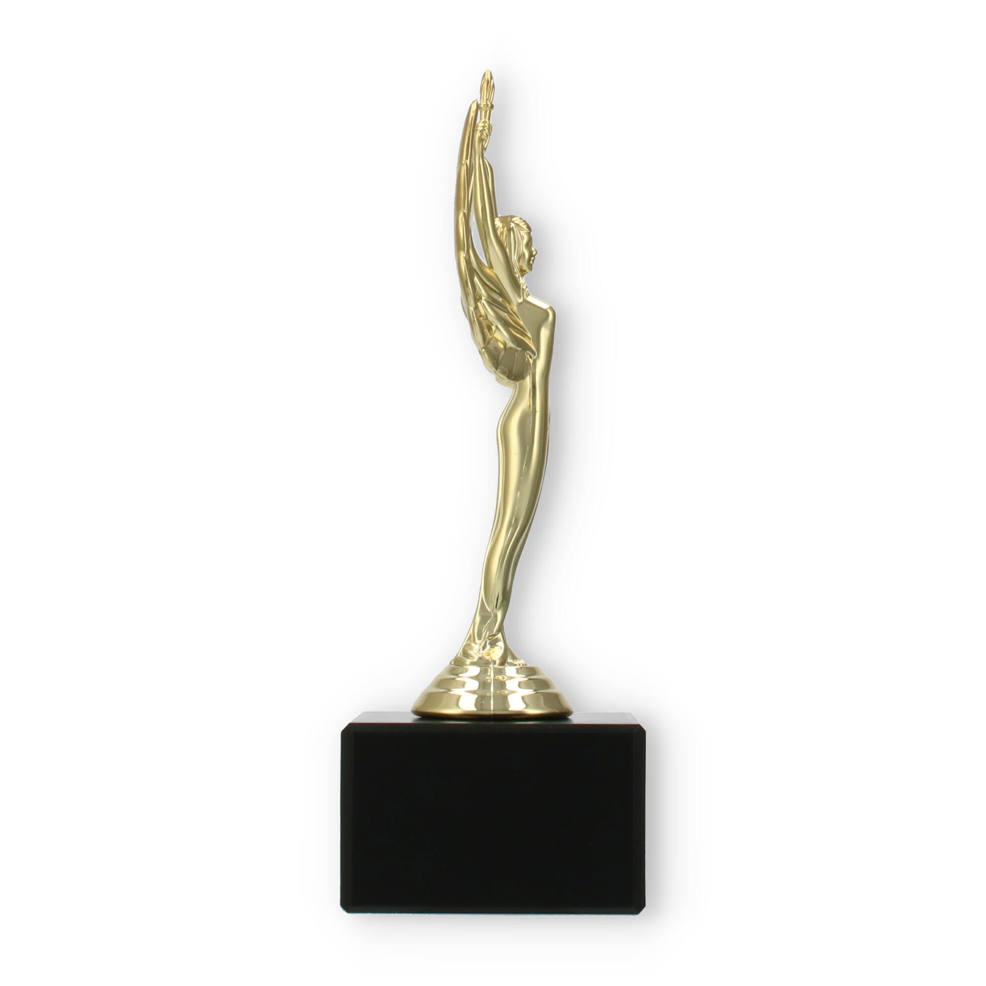 Met een totale hoogte van 18,2 cm en vervaardigd uit goudkleurig kunststof, biedt deze trofee een tijdloze uitstraling. De vrouwelijke figuur, als godin van de overwinning, staat krachtig op een solide zwarte marmeren voet. Dit contrast tussen de goudkleur en de zwarte basis geeft de prijs een dimensie van verfijning.