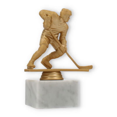 De Beker Hockey Speler vangt de opwinding van de sport perfect in beeld. Op een witte marmeren sokkel staat een indrukwekkende ijshockeyspeler van goudkleurig kunststof. Dit beeld toont niet alleen de atleet in actie met alle details van uitrusting en beweging, maar creëert ook een blijvende herinnering aan het succes.