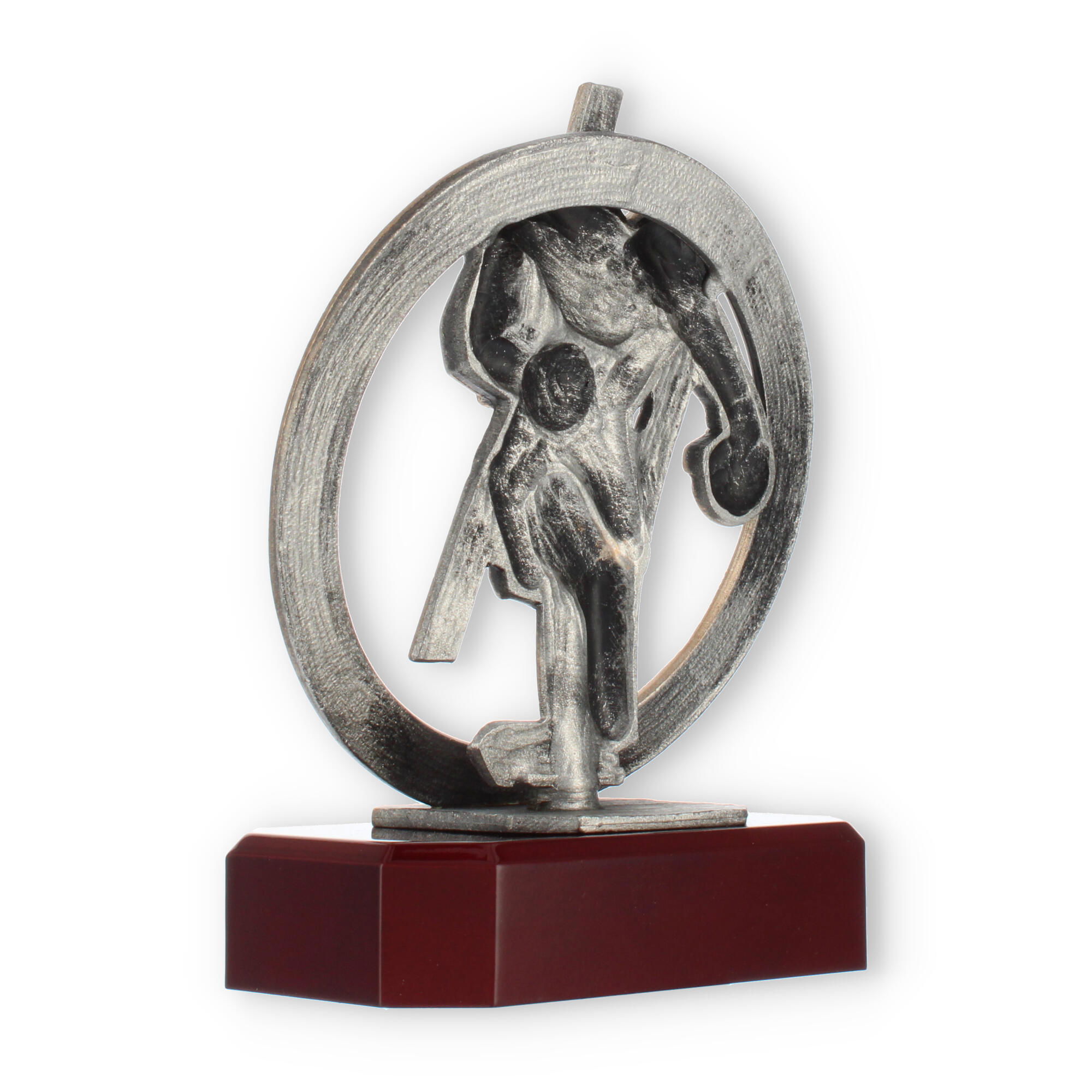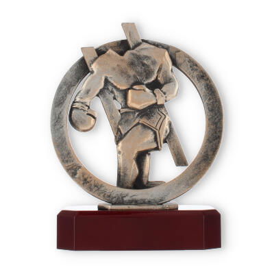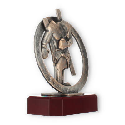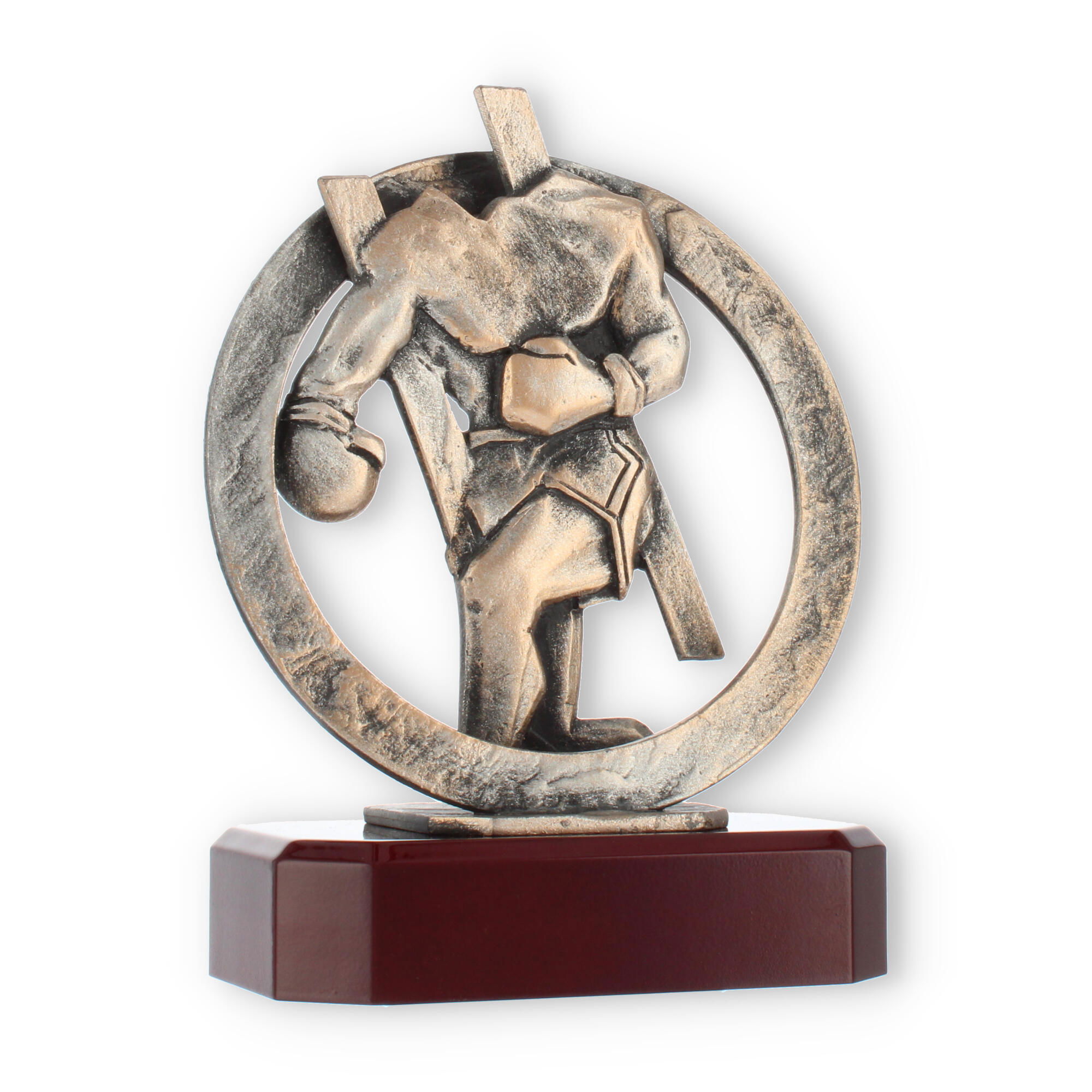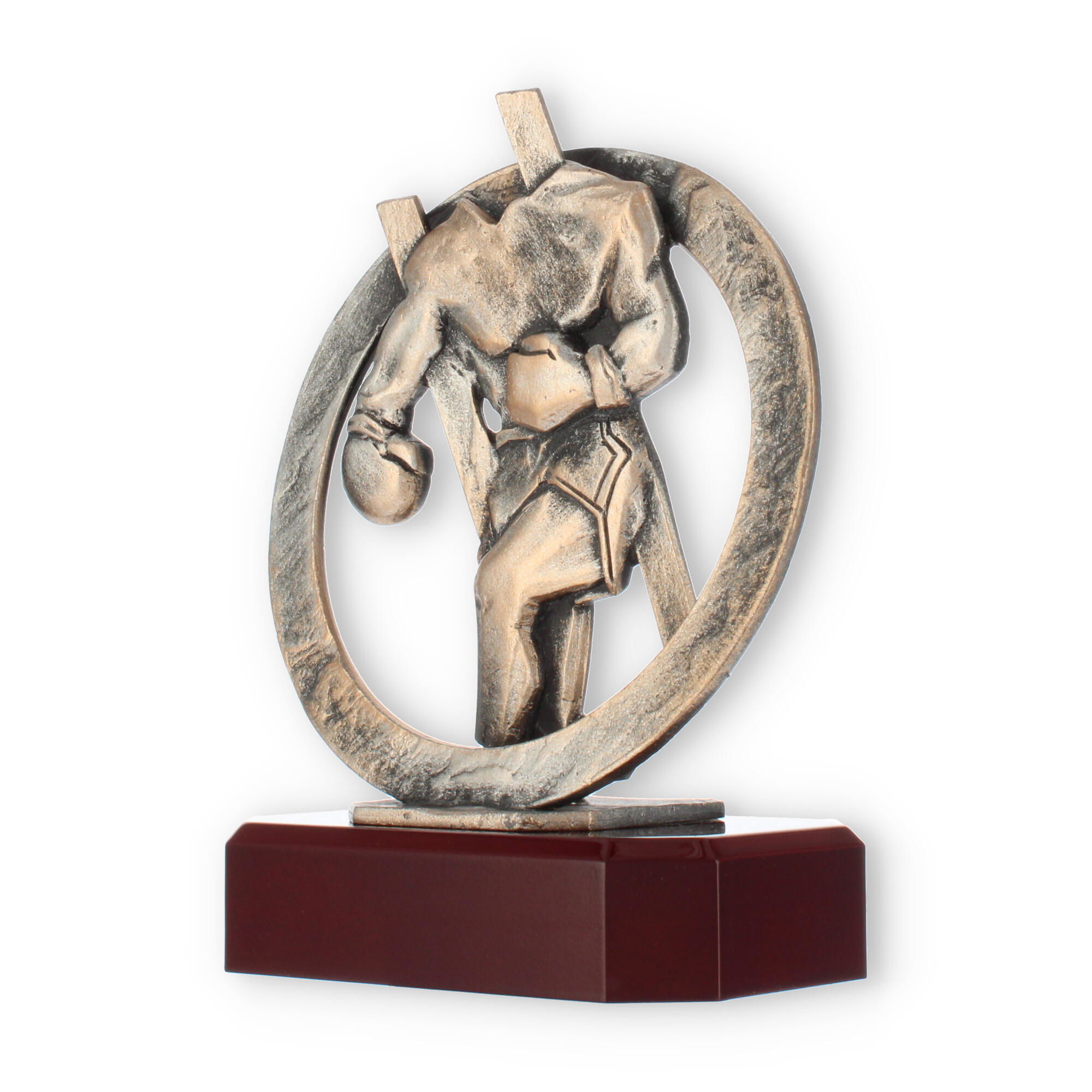 Centraal in het ontwerp staat de bronzen bokserfiguur, omarmd door een stijlvolle krans. Dit element symboliseert de kring van overwinning en verlening van eer, passend bij elke prestigieuze gelegenheid. Op deze voet rust de mahonie-look sokkel die de schoonheid van deze trofee versterkt.