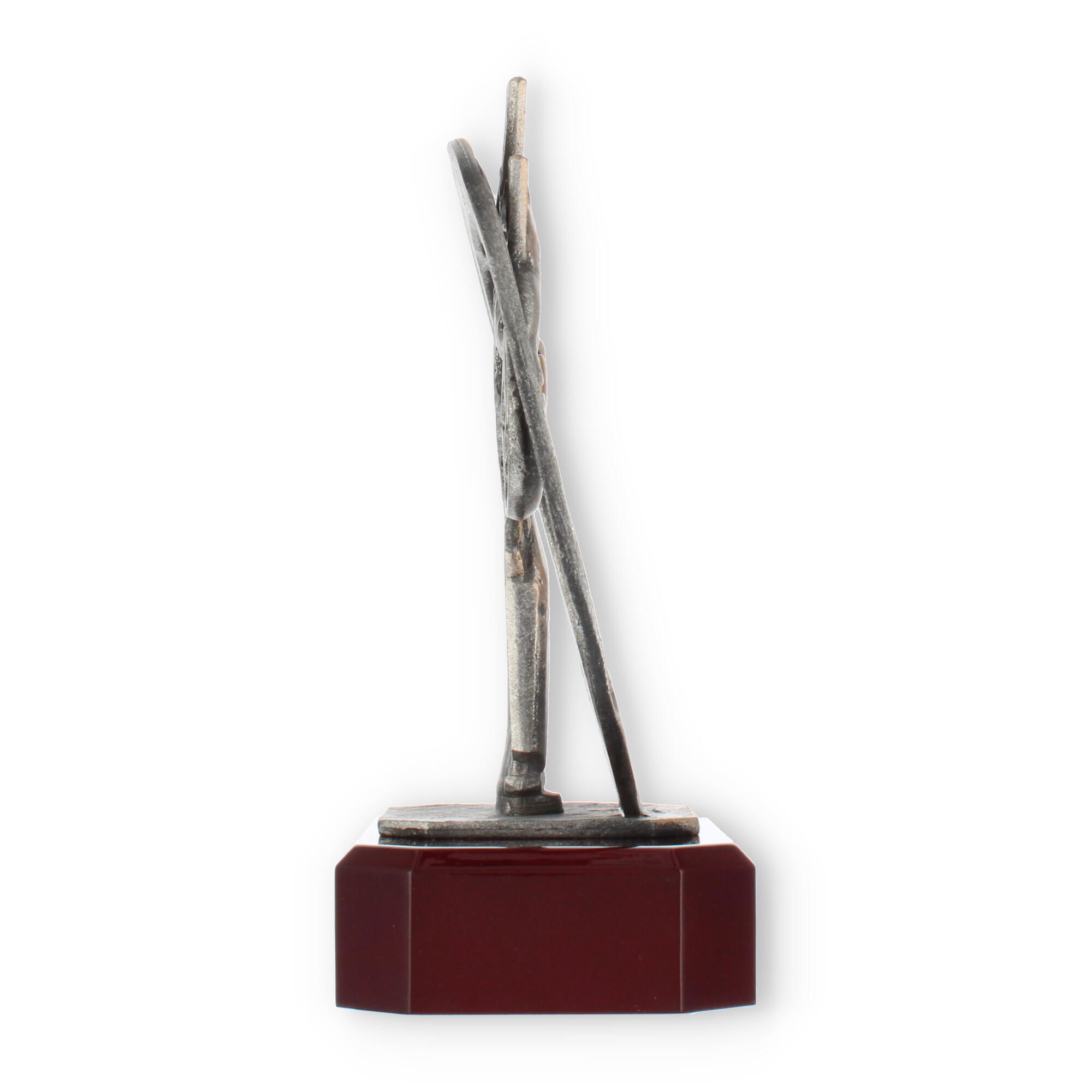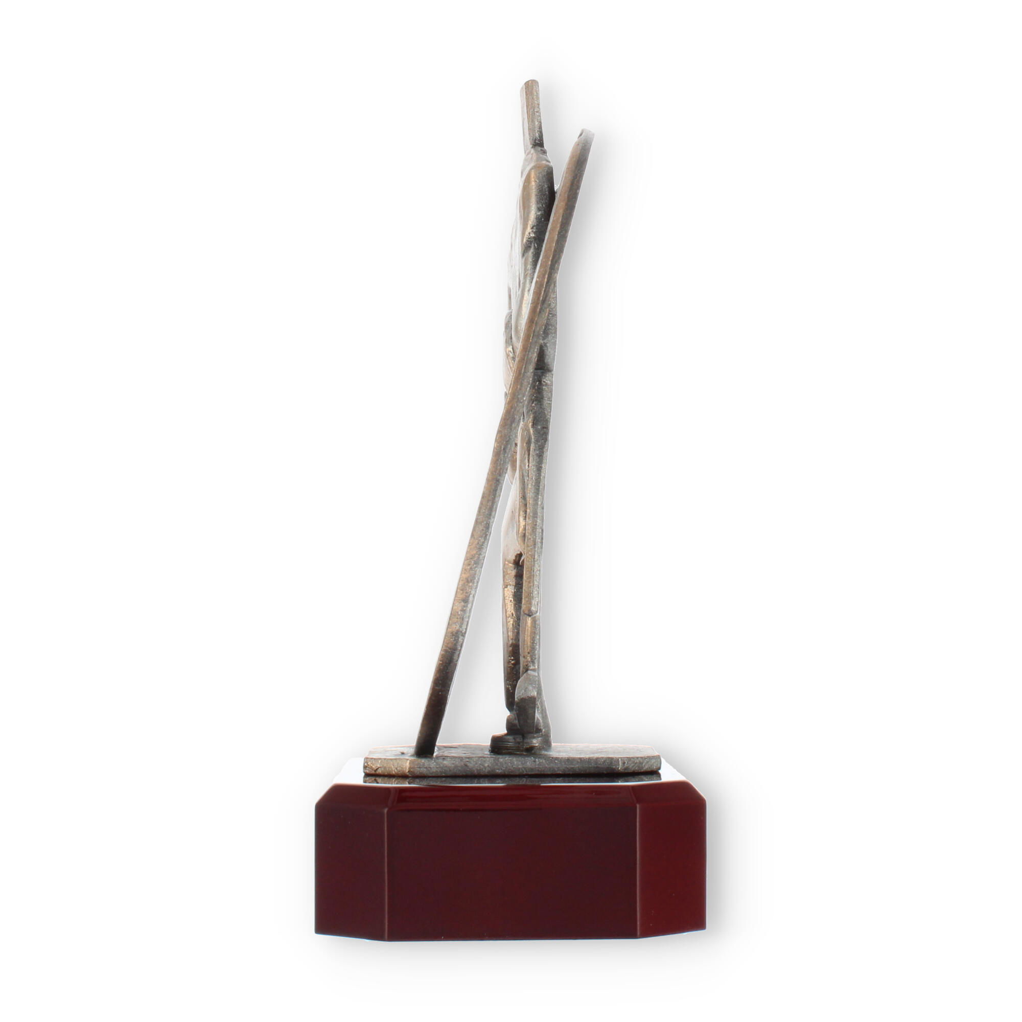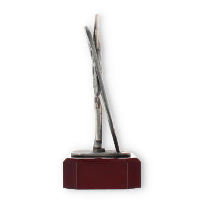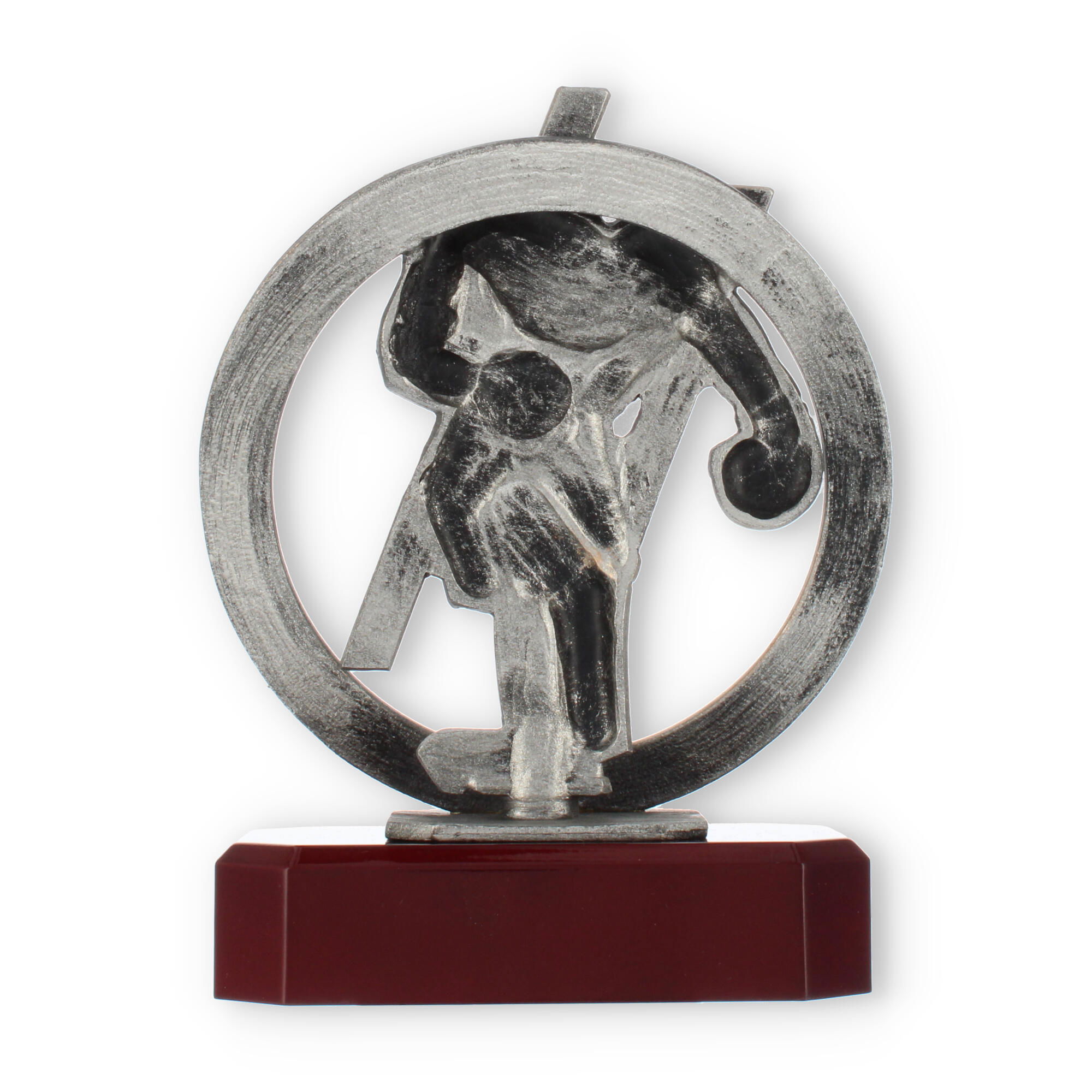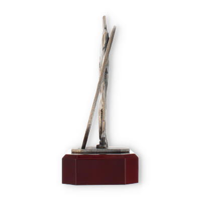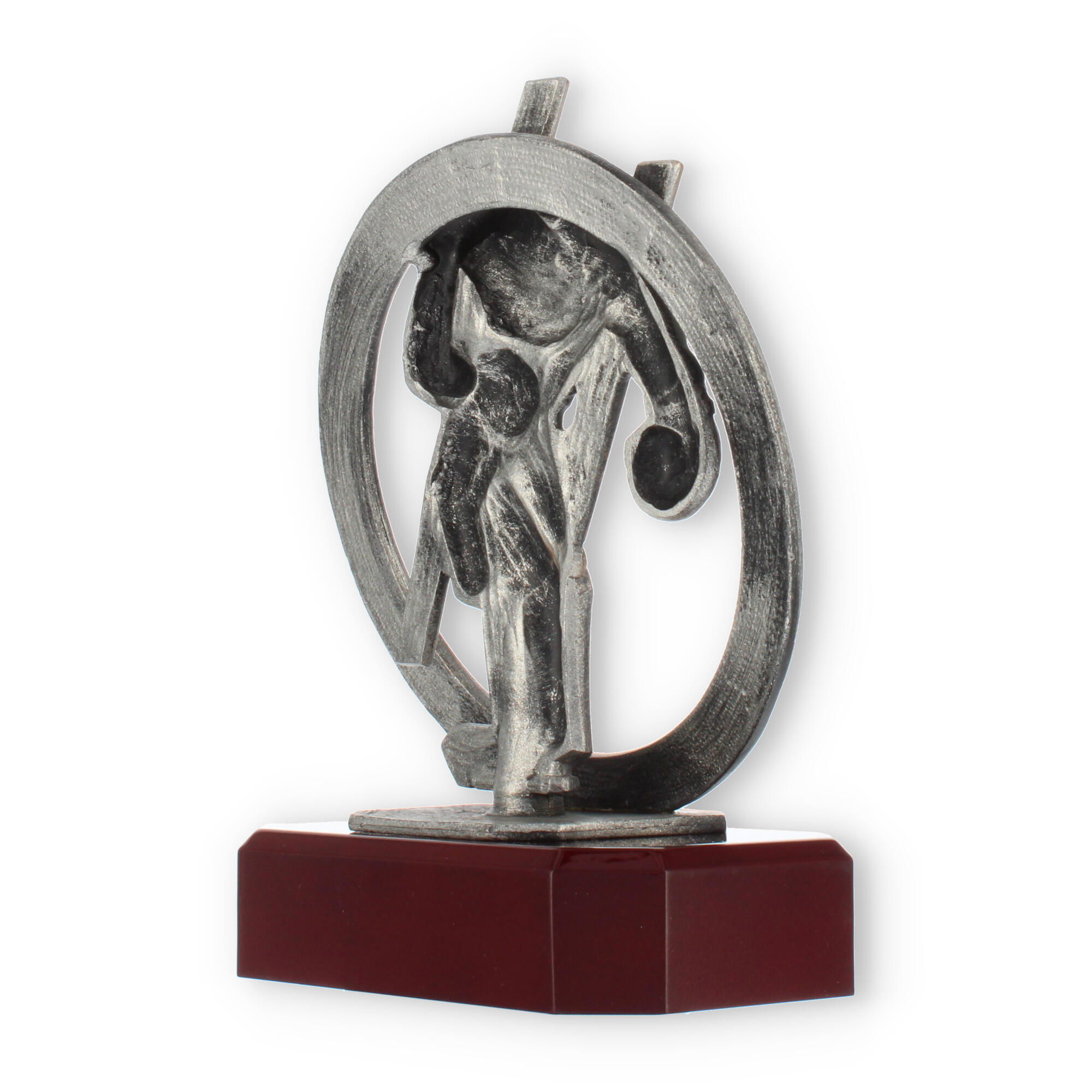 Centraal in het ontwerp staat de bronzen bokserfiguur, omarmd door een stijlvolle krans. Dit element symboliseert de kring van overwinning en verlening van eer, passend bij elke prestigieuze gelegenheid. Op deze voet rust de mahonie-look sokkel die de schoonheid van deze trofee versterkt.