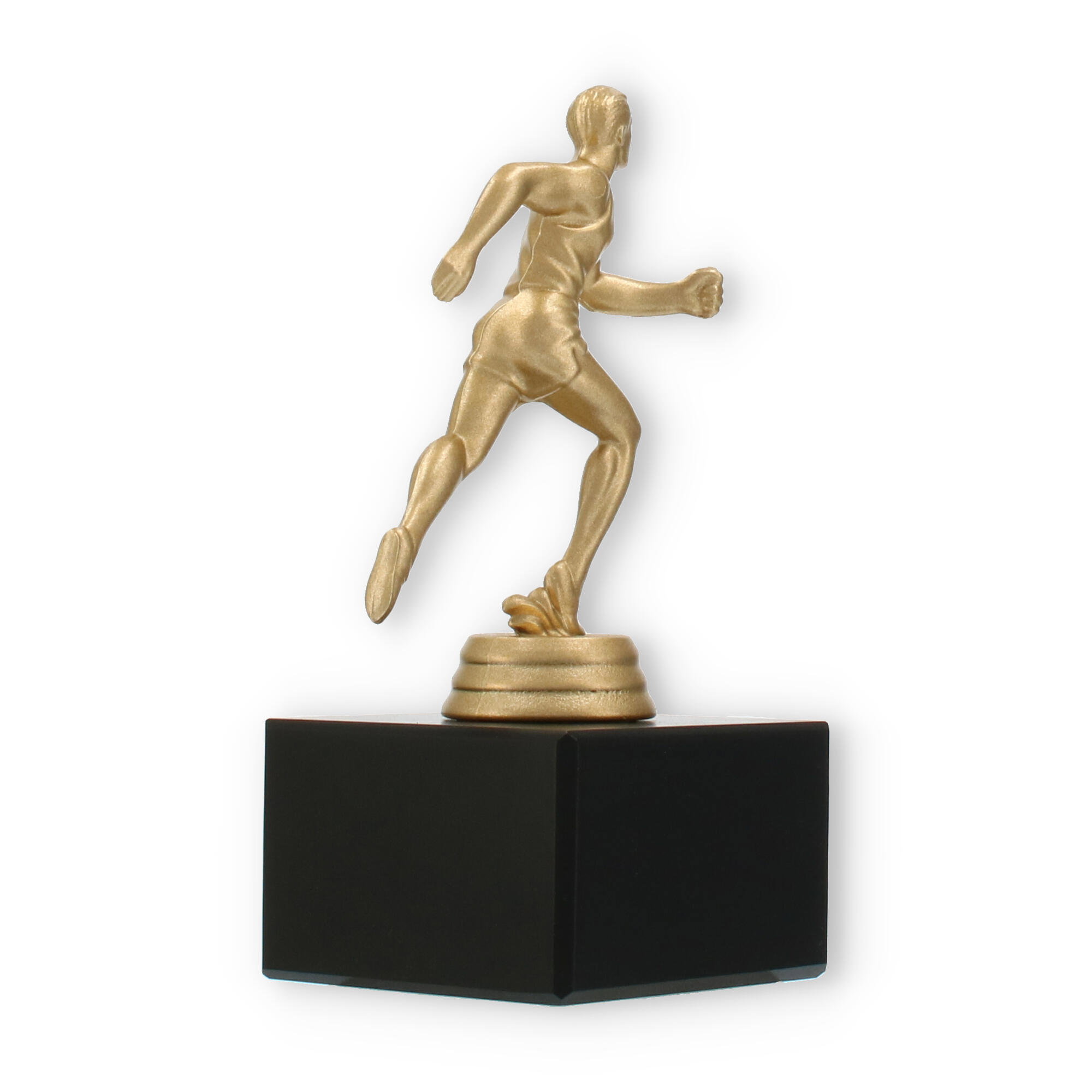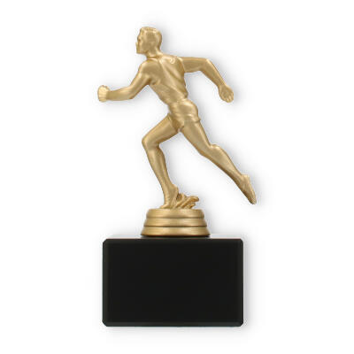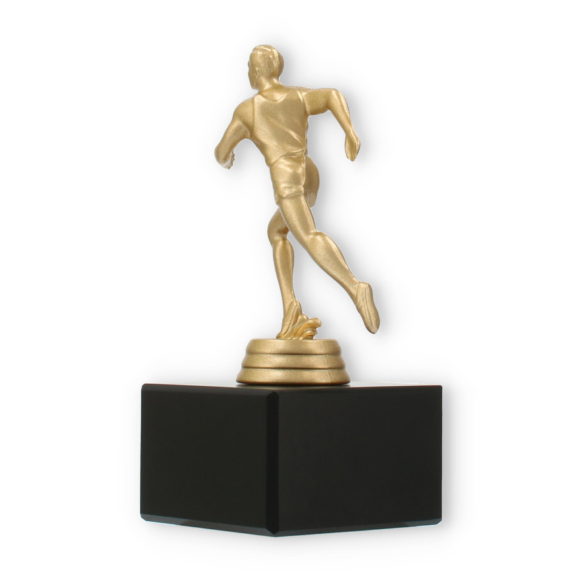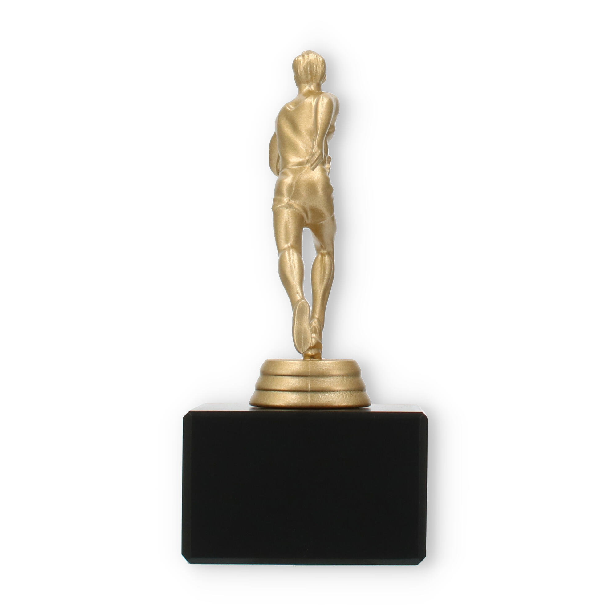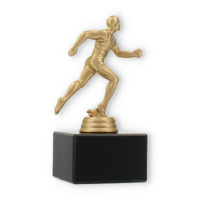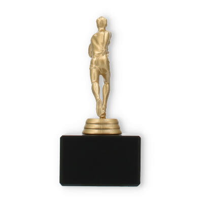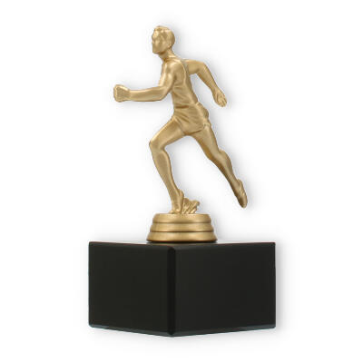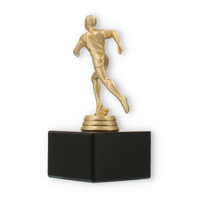 Podstawa wykonana jest z marmuru w klasycznym czarnym kolorze i stanowi elegancki kontrapunkt dla złocistej figury. Prostokątny kształt i gładkie linie tworzą wizualne wyważenie, które doskonale komponuje się z dynamiczną figurą sportowca.