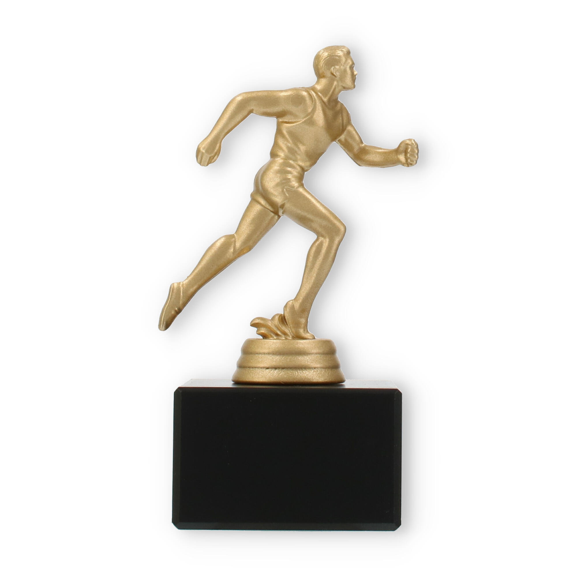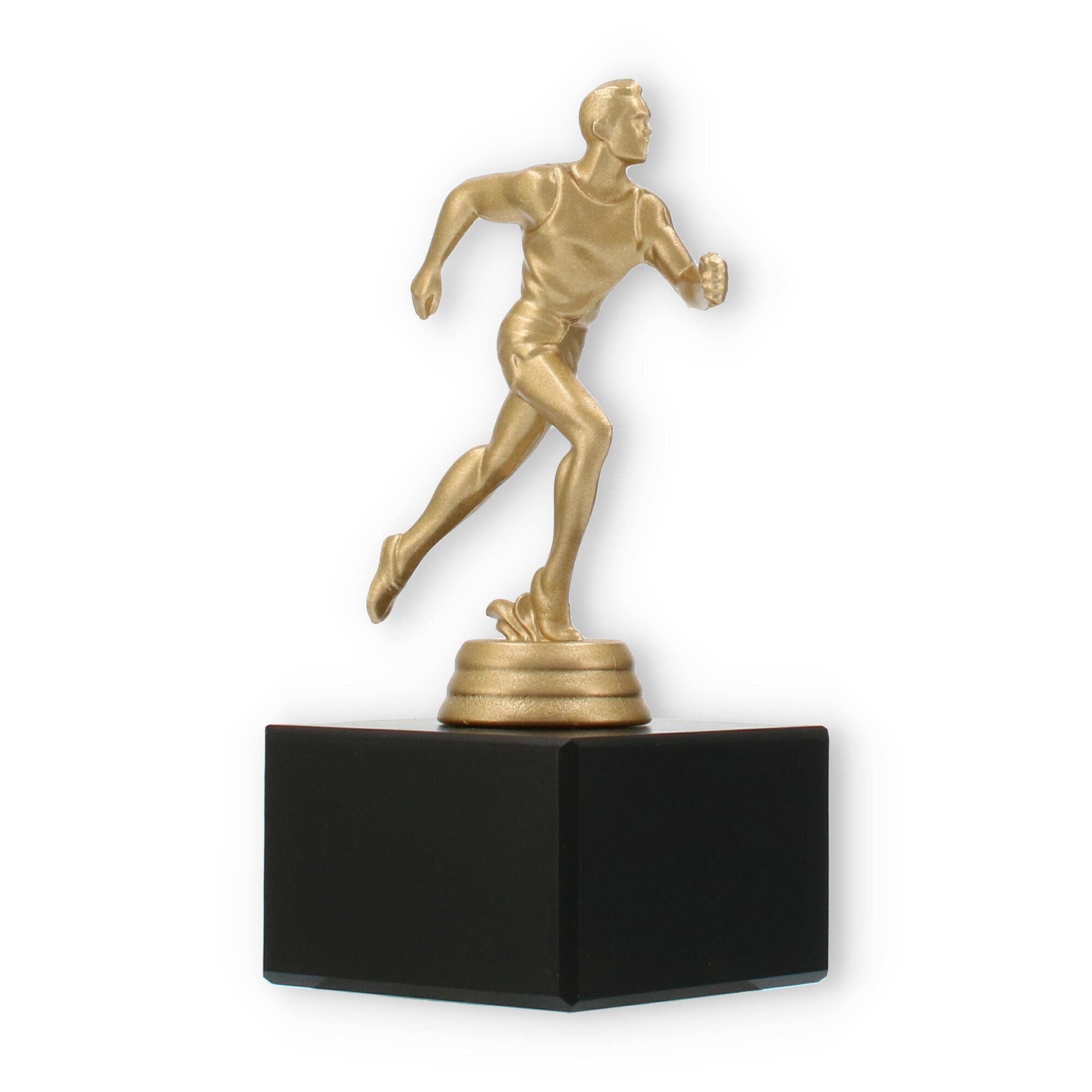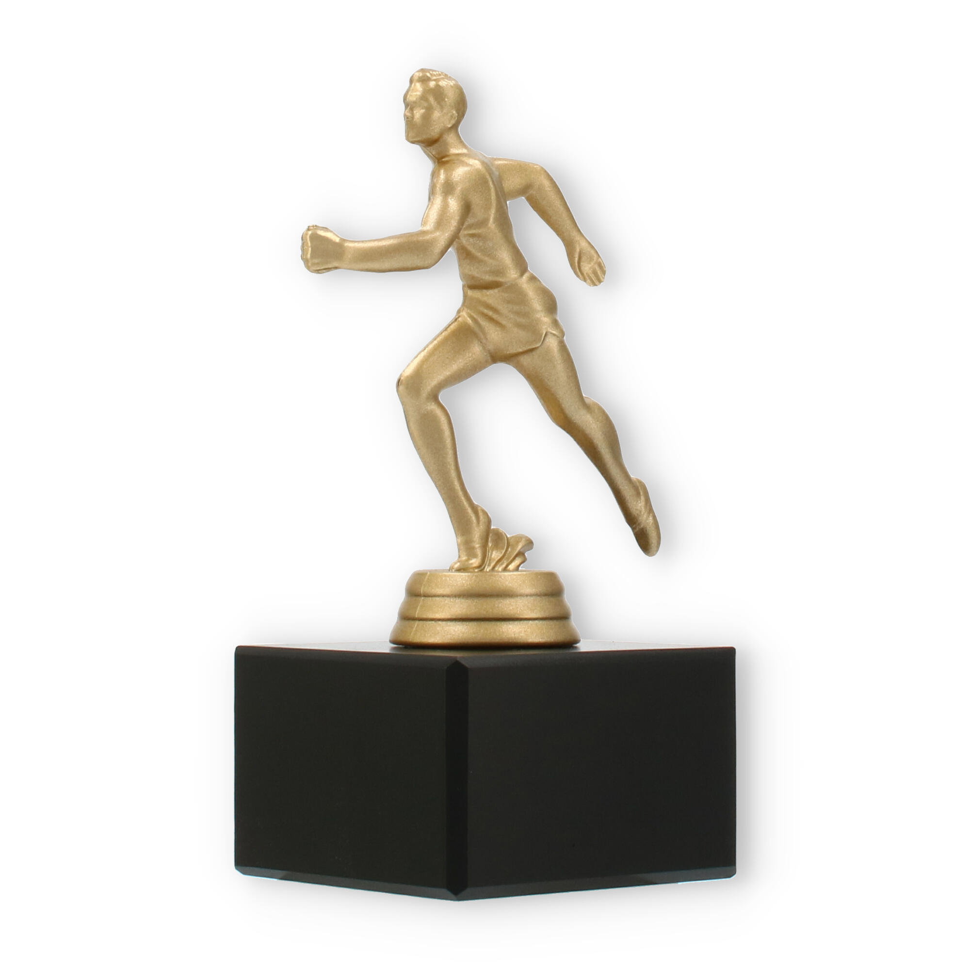 Podstawa wykonana jest z marmuru w klasycznym czarnym kolorze i stanowi elegancki kontrapunkt dla złocistej figury. Prostokątny kształt i gładkie linie tworzą wizualne wyważenie, które doskonale komponuje się z dynamiczną figurą sportowca.