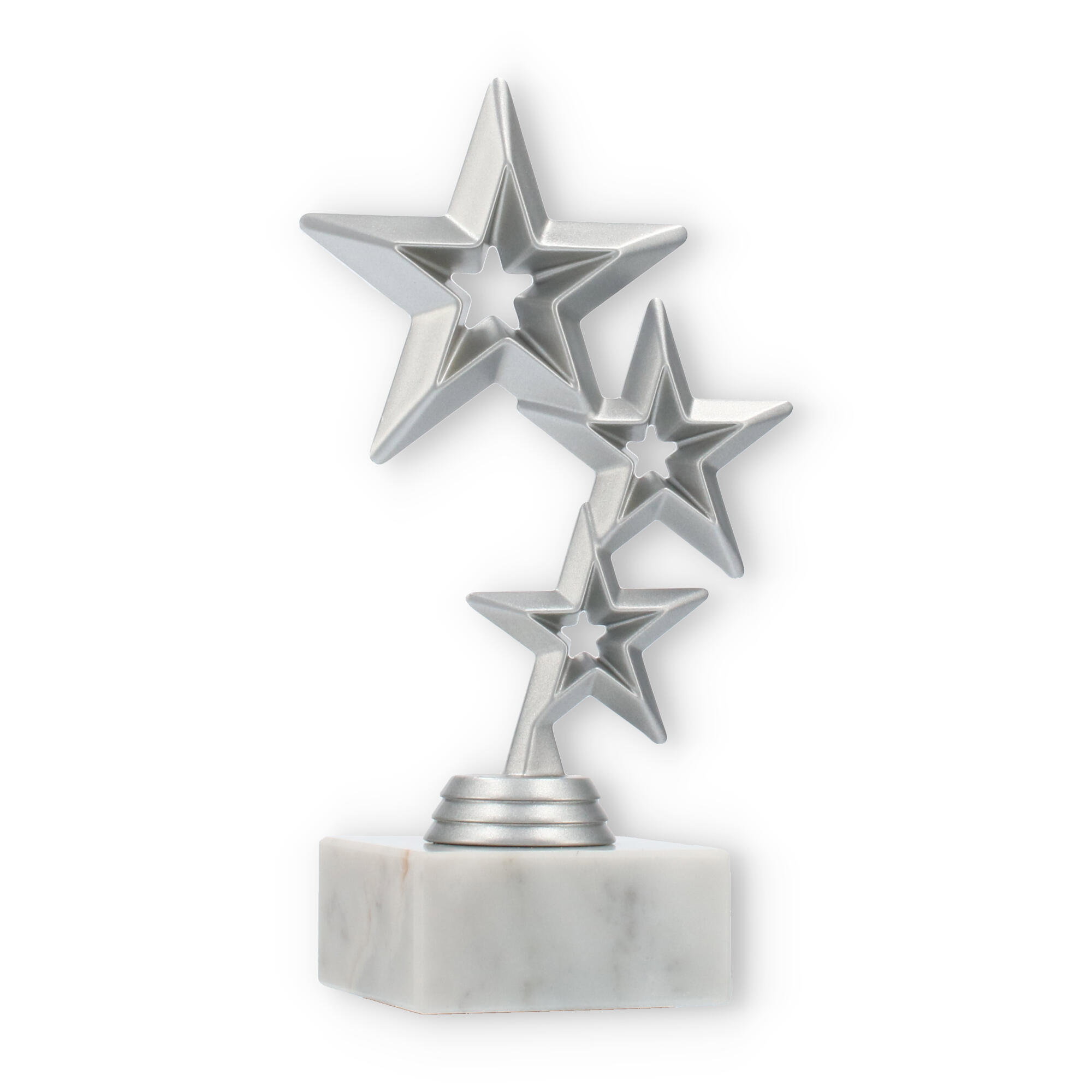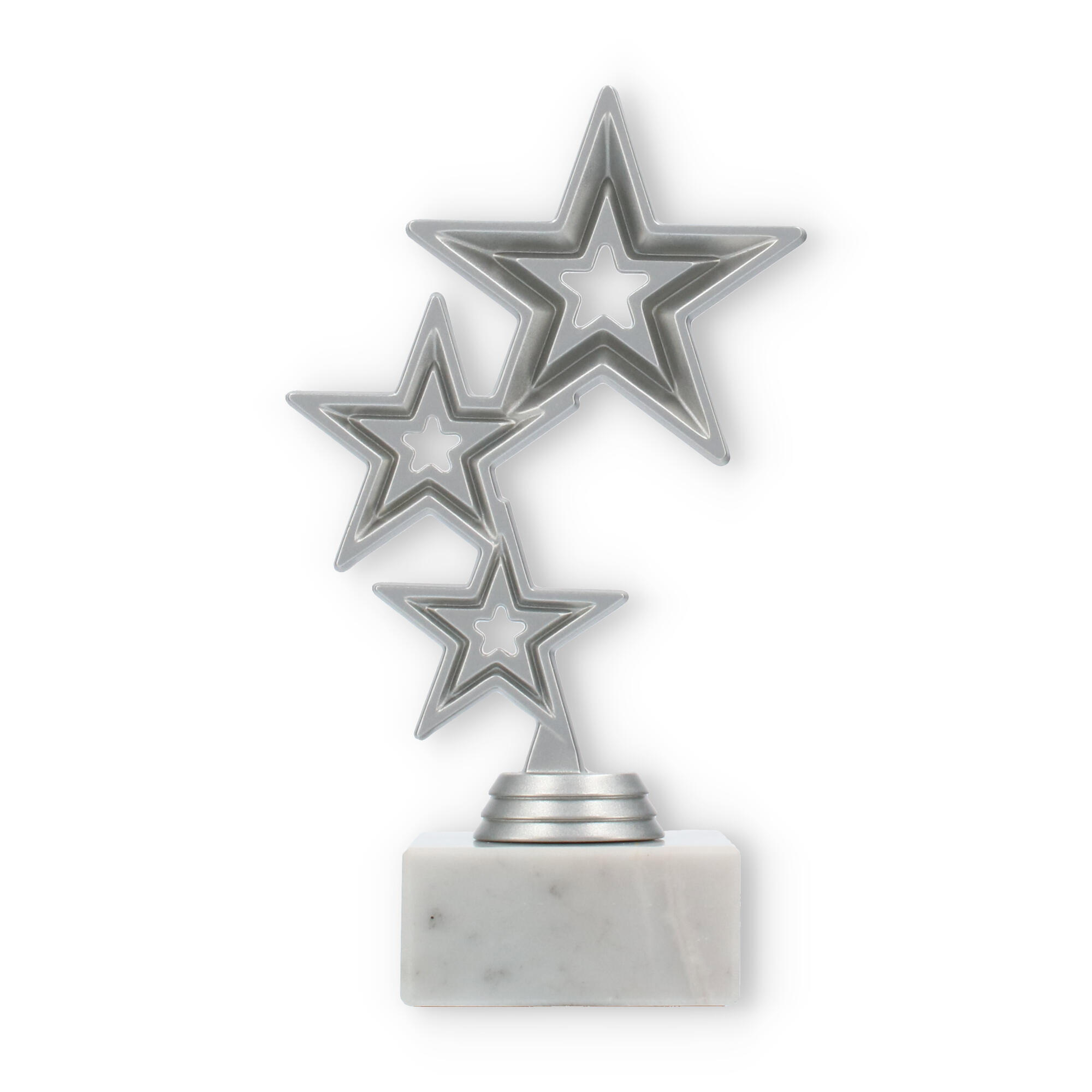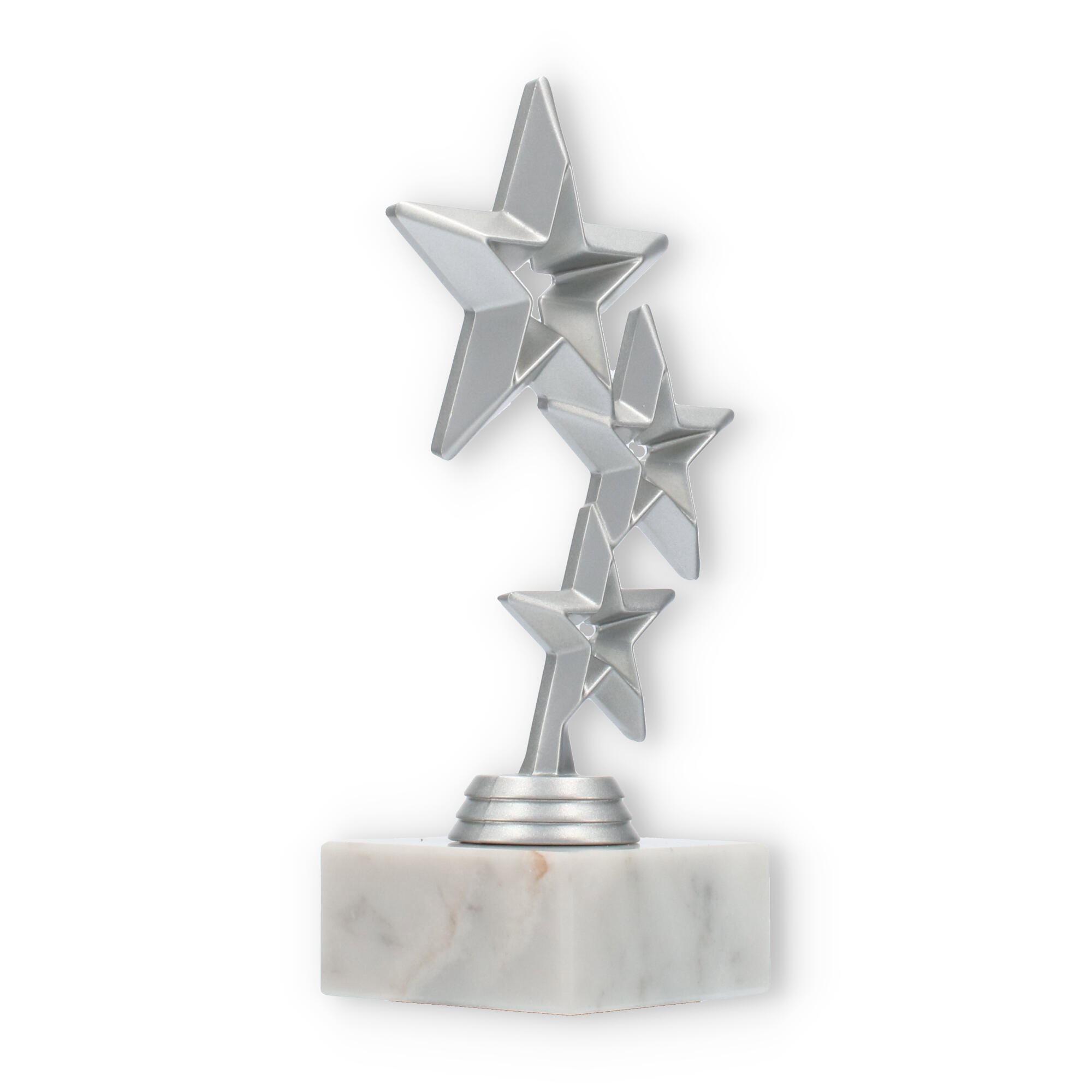 Trofeum Jupiter emanuje nowoczesnym designem, łącząc solidność marmurowej podstawy z elegancją srebrnego metalu. Główna część statuetki składa się z trzech pięknie ułożonych, geometrycznych gwiazd, które przyciągają wzrok swoim rozmieszczeniem. Największy z nich wznosi się dumnie na szczycie, tworząc spójny i harmonijny wygląd.