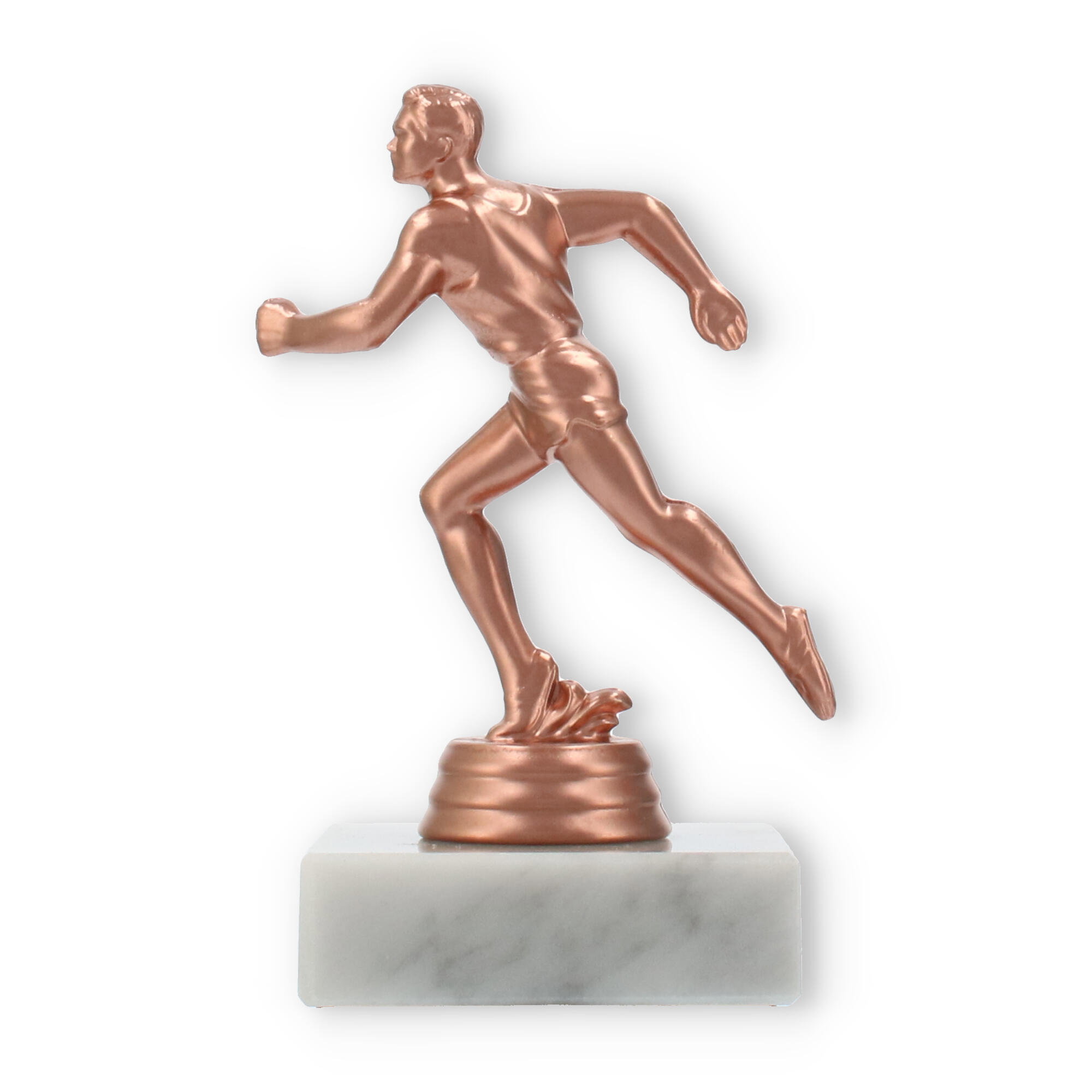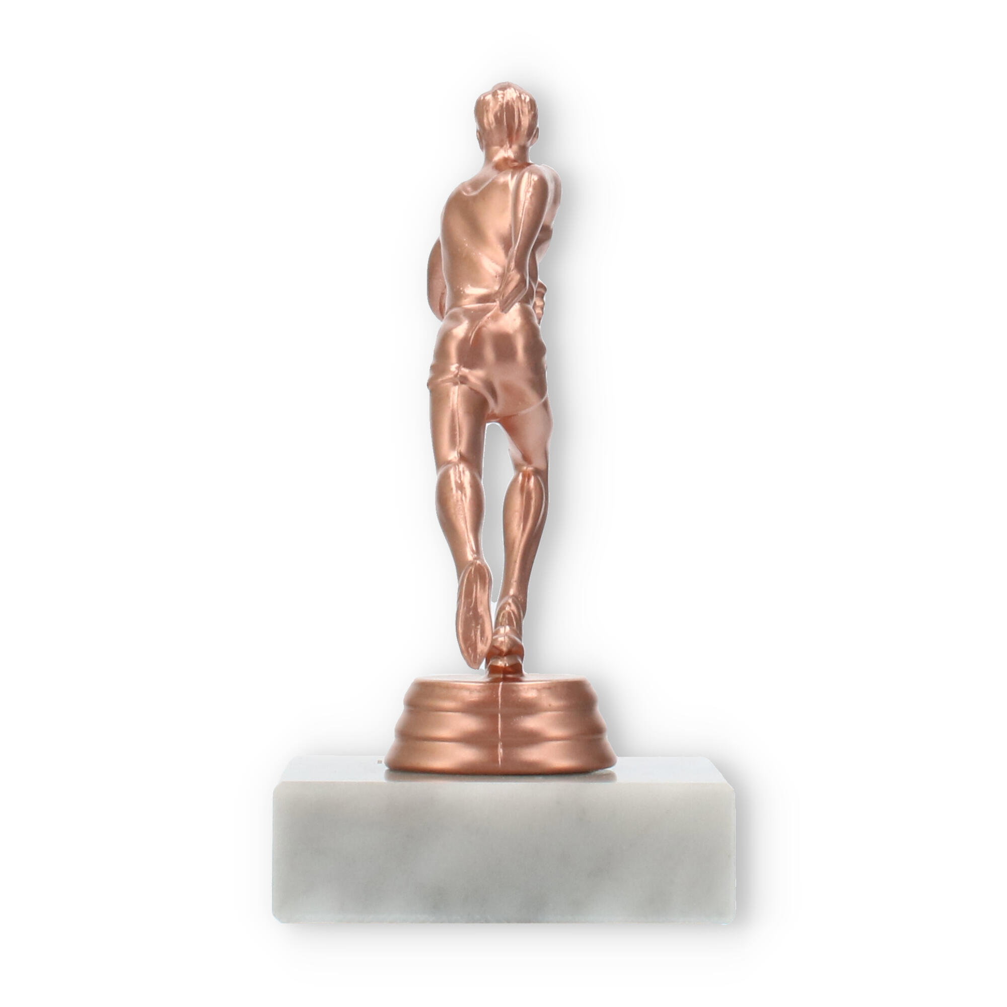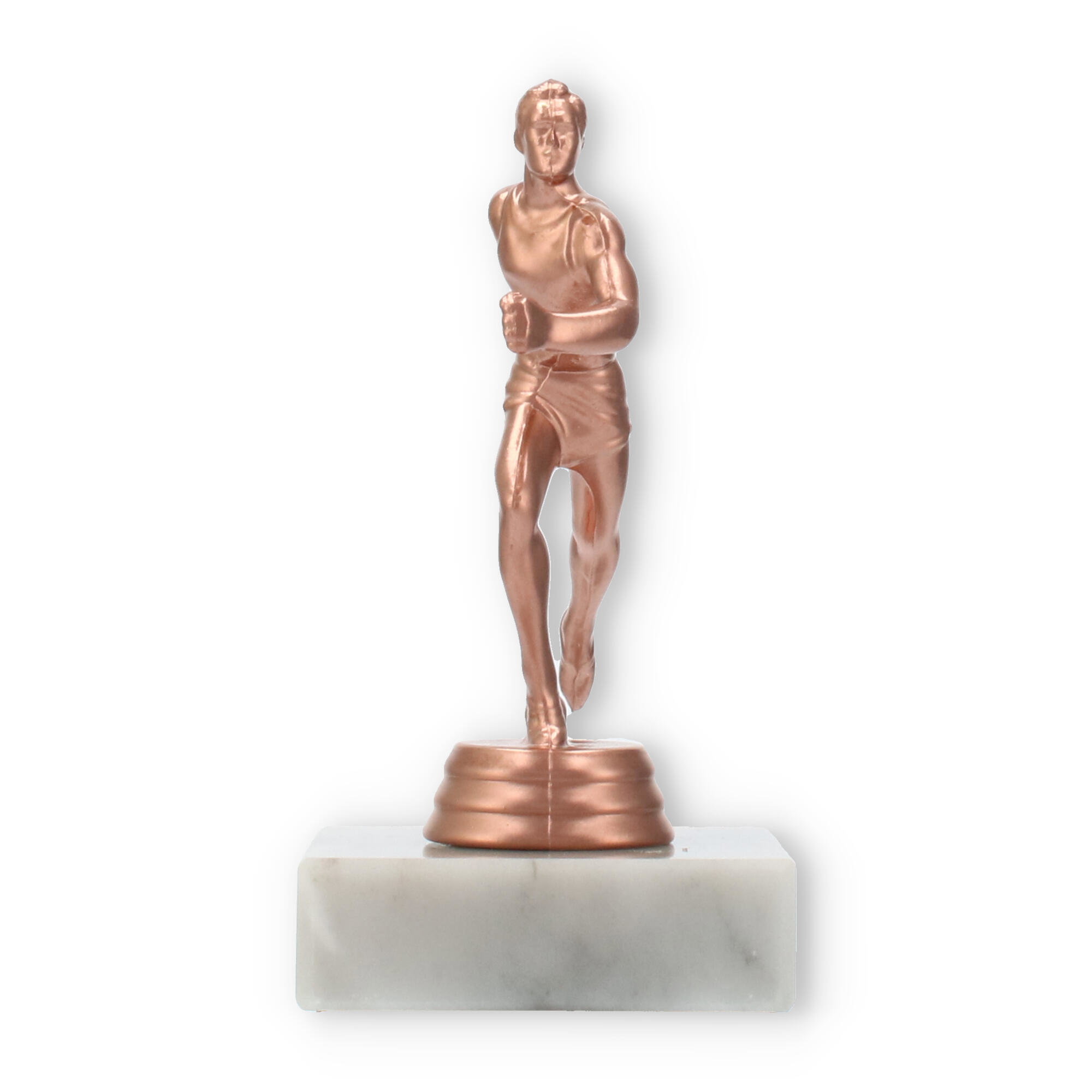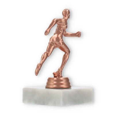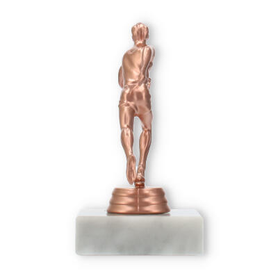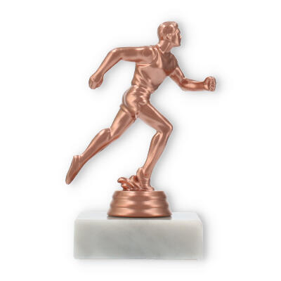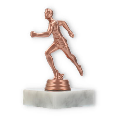 Plastikowa figurka biegacza, umieszczona na białej marmurowej podstawie, przyciąga wzrok swoim wyrafinowaniem. Kolor brązowy nadaje jej klasyczny wygląd, idealnie komponując się z jasnym marmurem, co tworzy harmonijną całość.