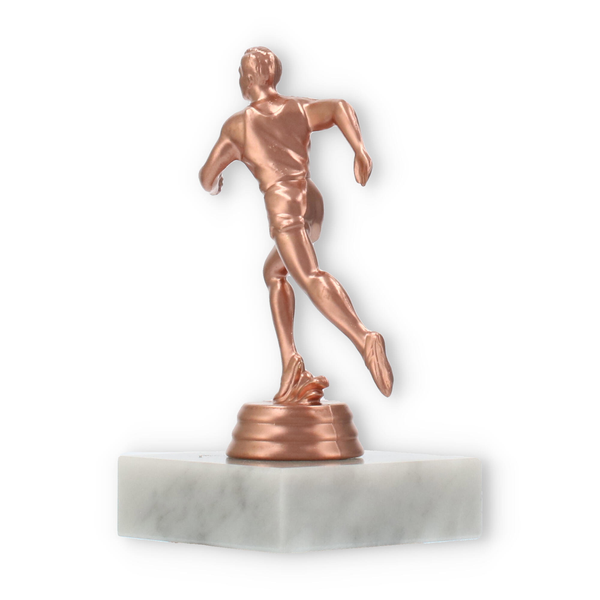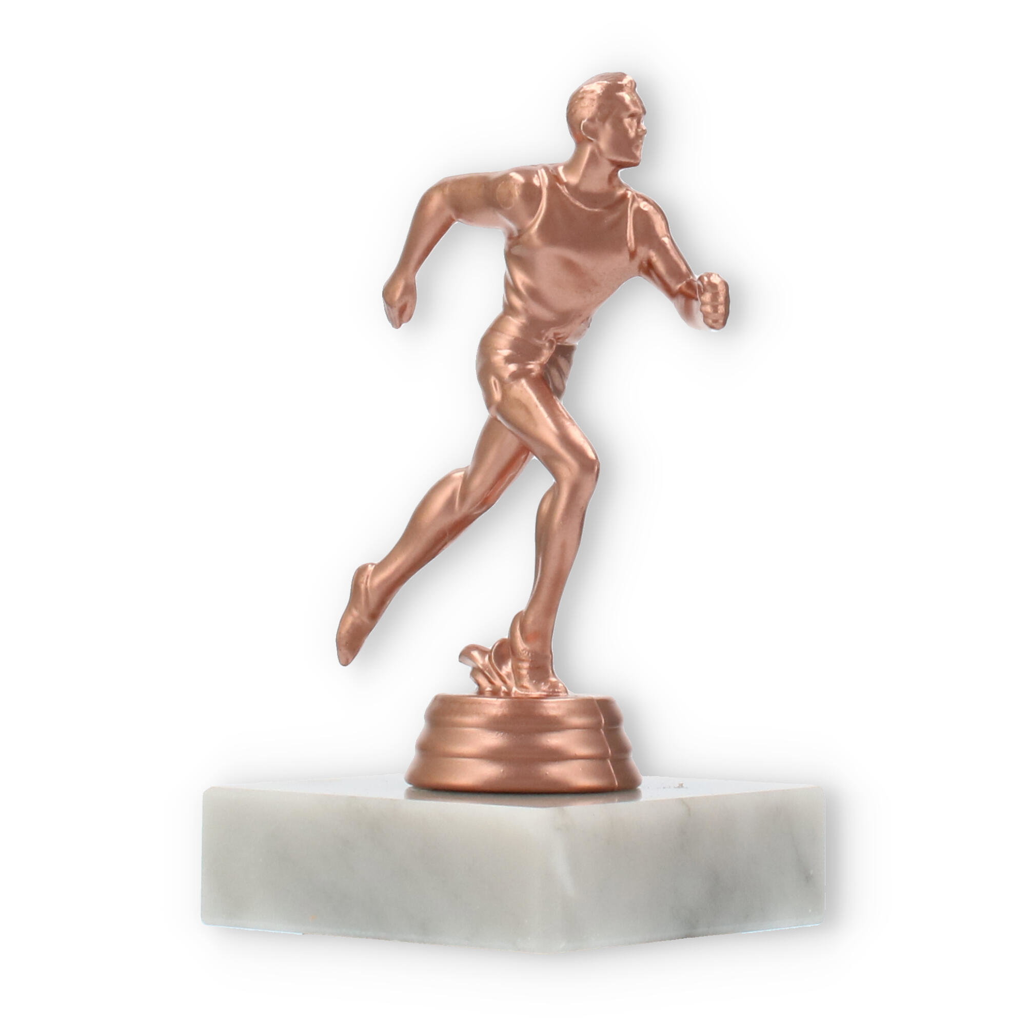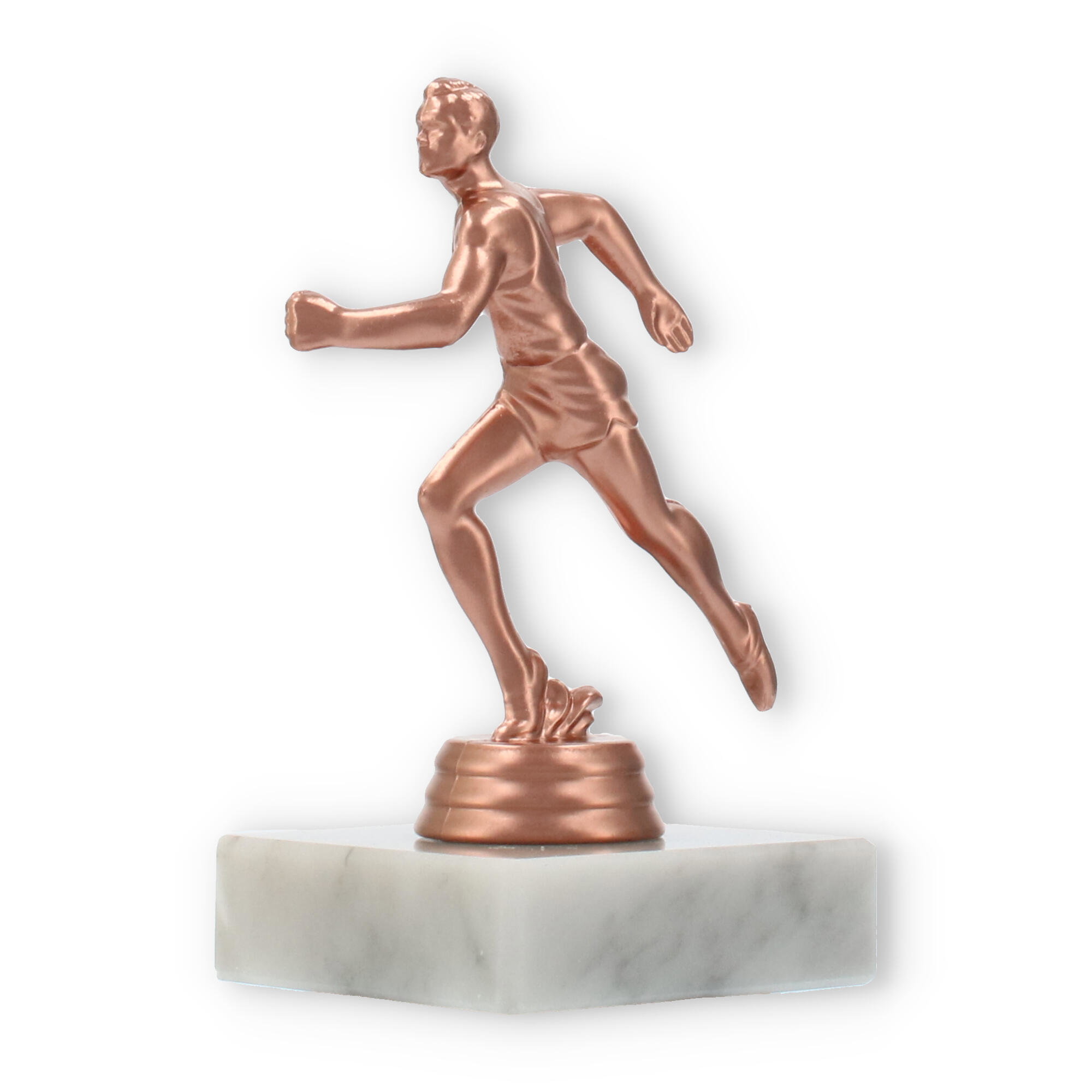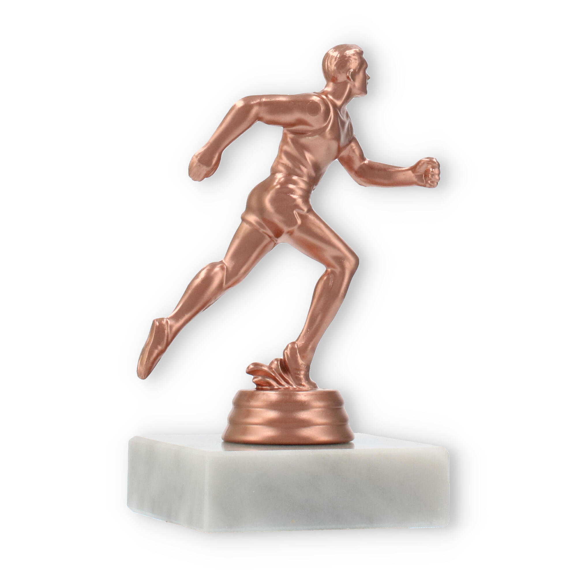 Plastikowa figurka biegacza, umieszczona na białej marmurowej podstawie, przyciąga wzrok swoim wyrafinowaniem. Kolor brązowy nadaje jej klasyczny wygląd, idealnie komponując się z jasnym marmurem, co tworzy harmonijną całość.