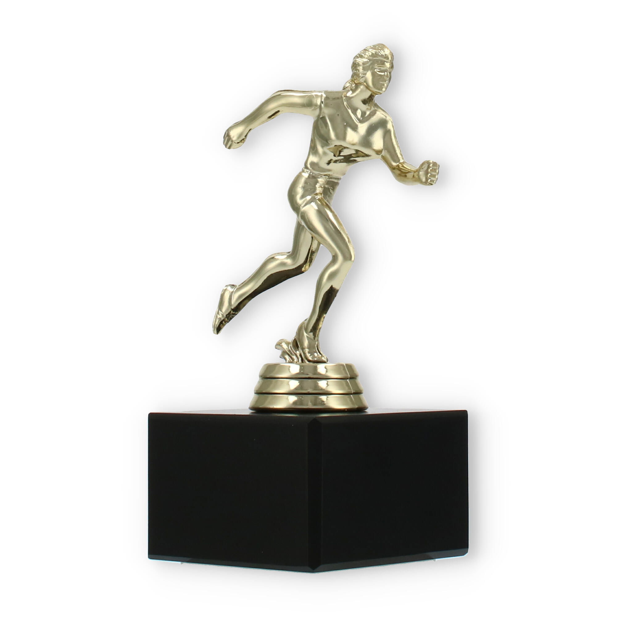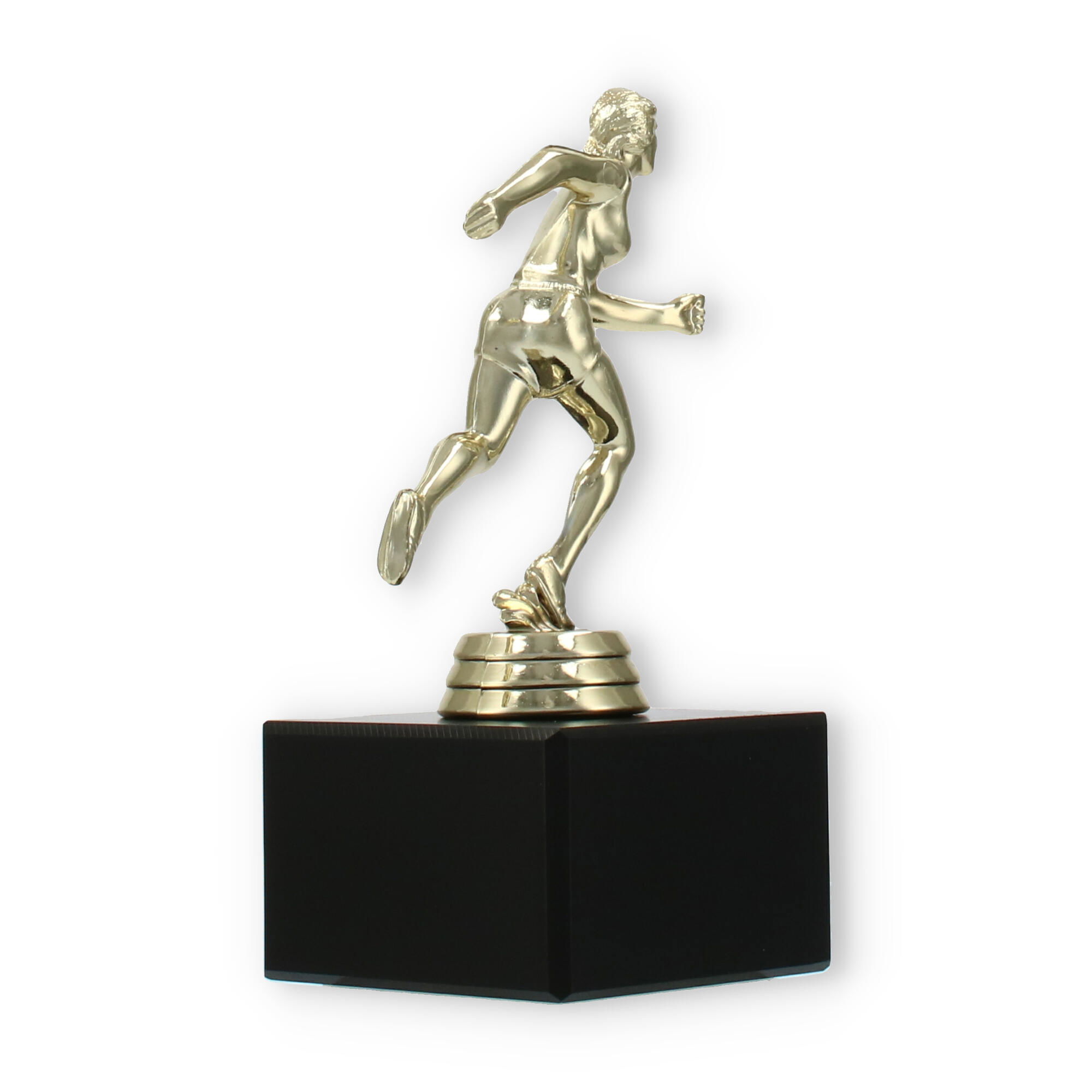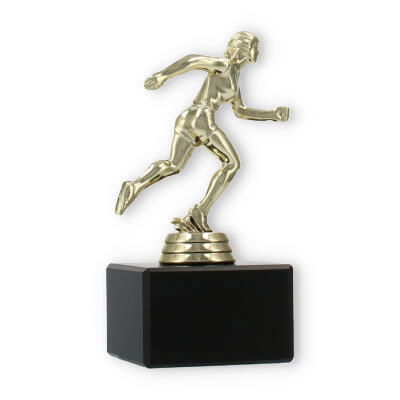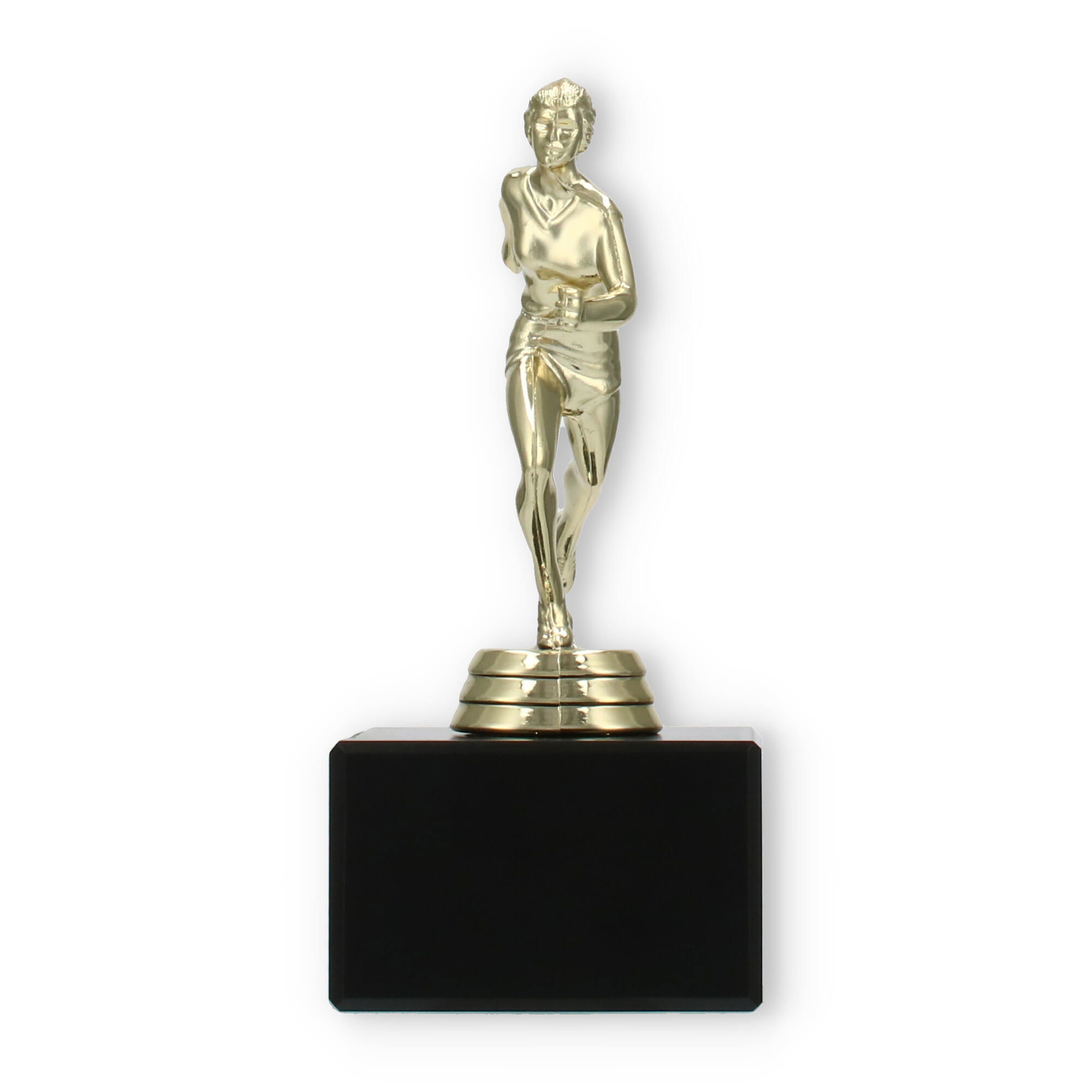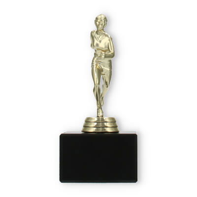 Plastikowa figurka biegaczki, wykończona w złotym kolorze, przyciąga uwagę swoją dynamiczną postawą. Umieszczona jest na solidnej czarnej marmurowej podstawie, która nadaje jej elegancki wygląd. Wykorzystaj możliwość grawerowania, aby dodać osobisty akcent i uczcić wyjątkowe chwile podczas ceremonii wręczenia nagród.