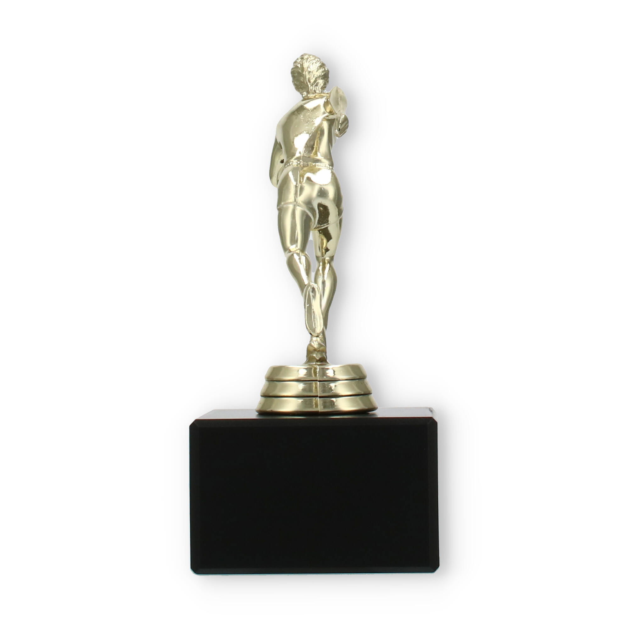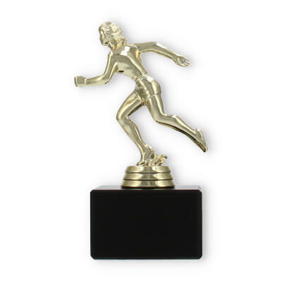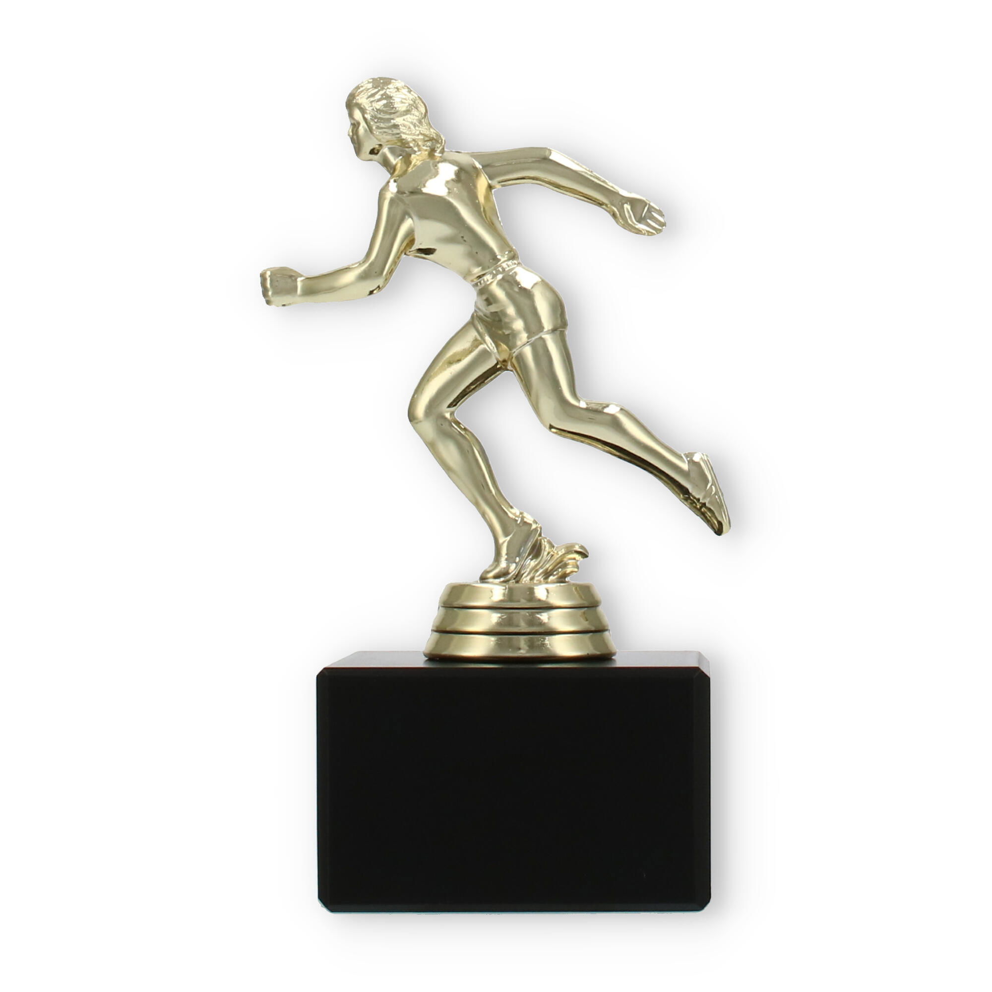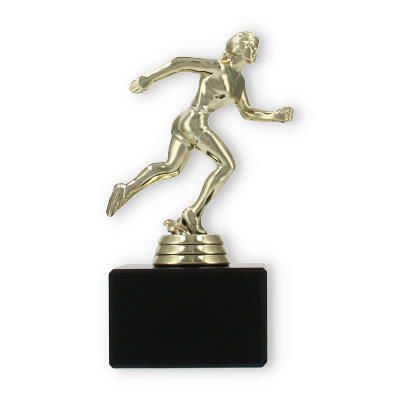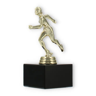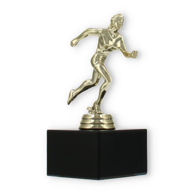 Plastikowa figurka biegaczki, wykończona w złotym kolorze, przyciąga uwagę swoją dynamiczną postawą. Umieszczona jest na solidnej czarnej marmurowej podstawie, która nadaje jej elegancki wygląd. Wykorzystaj możliwość grawerowania, aby dodać osobisty akcent i uczcić wyjątkowe chwile podczas ceremonii wręczenia nagród.