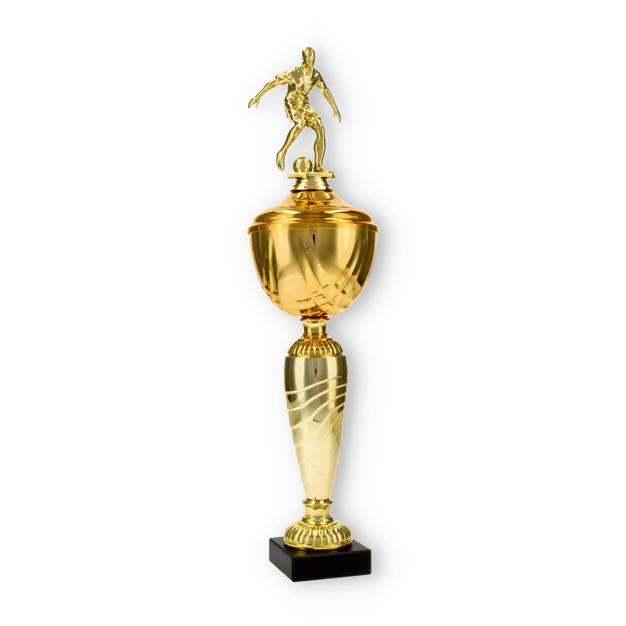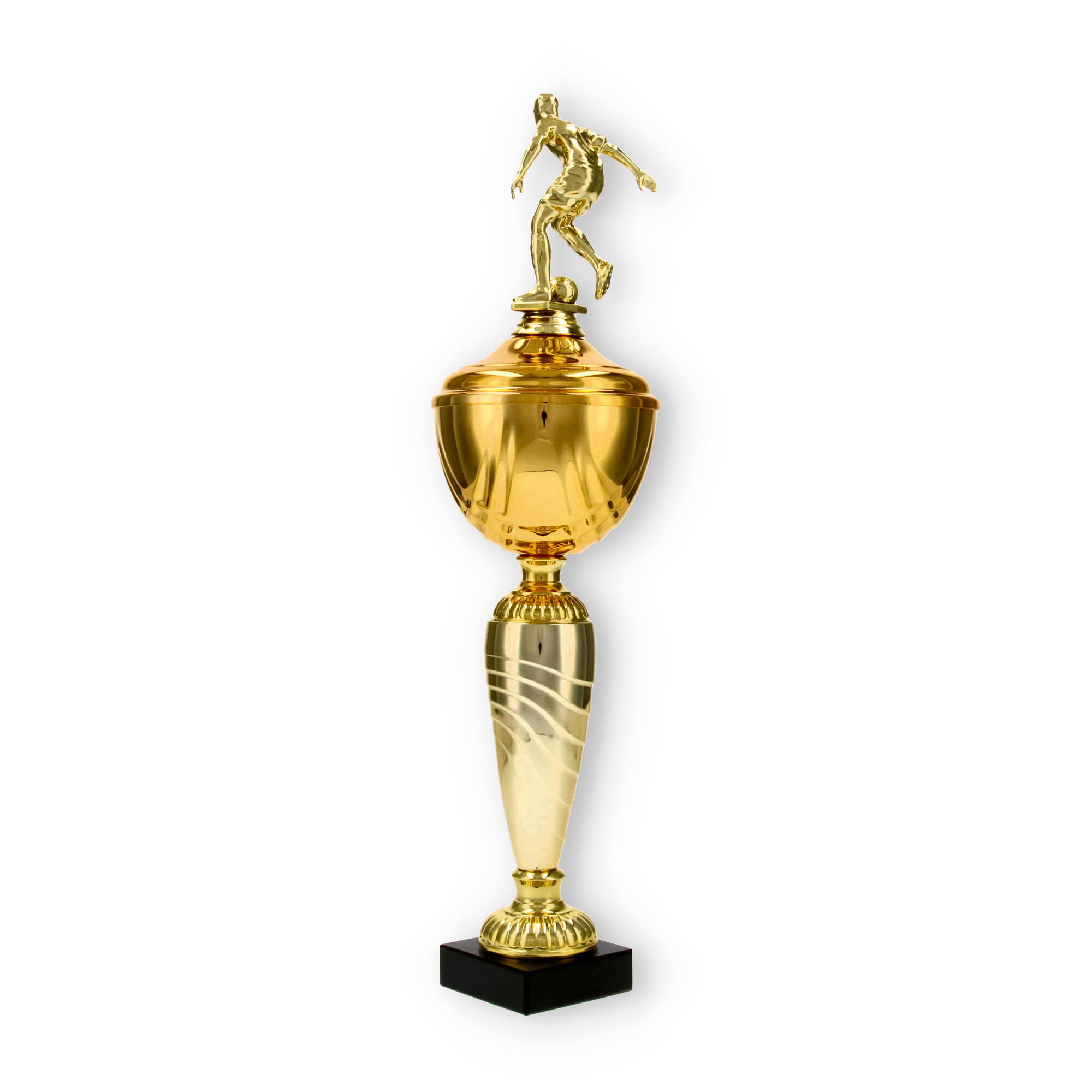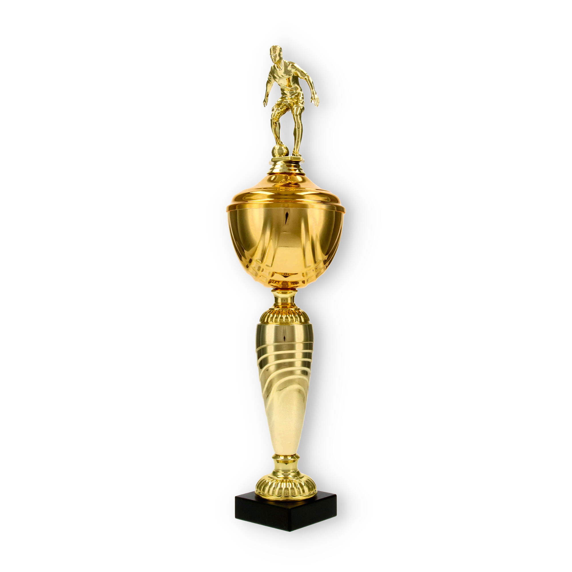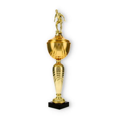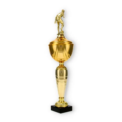 La Coppa Dore è una scelta ideale per chi desidera onorare con stile i campioni di calcio. Con la sua altezza di 40,5 cm, questa trofeo cattura immediatamente l’attenzione, grazie al suo giocatore di calcio scolpito in metallo con colore dorato, che aggiunge un tocco di dinamismo e movimento all'oggetto complessivo.