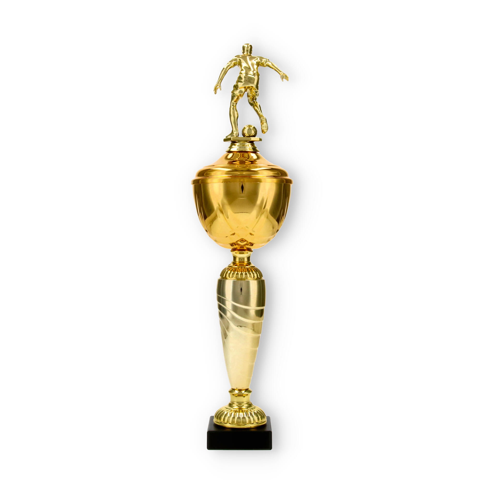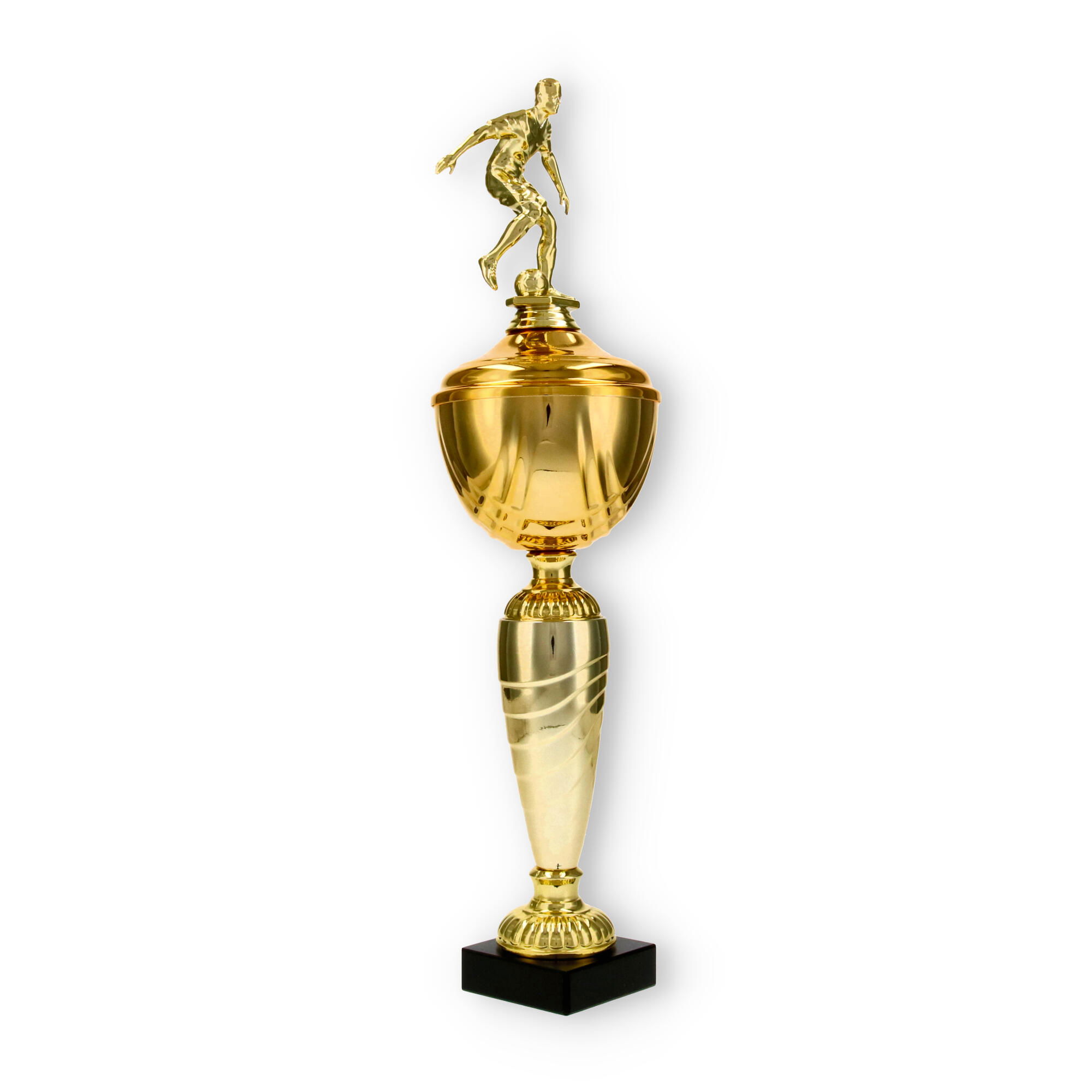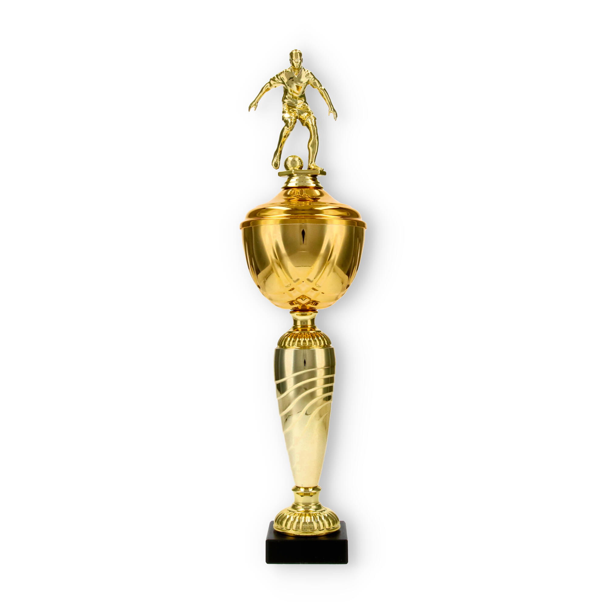 La Coppa Dore è una scelta ideale per chi desidera onorare con stile i campioni di calcio. Con la sua altezza di 40,5 cm, questa trofeo cattura immediatamente l’attenzione, grazie al suo giocatore di calcio scolpito in metallo con colore dorato, che aggiunge un tocco di dinamismo e movimento all'oggetto complessivo.
