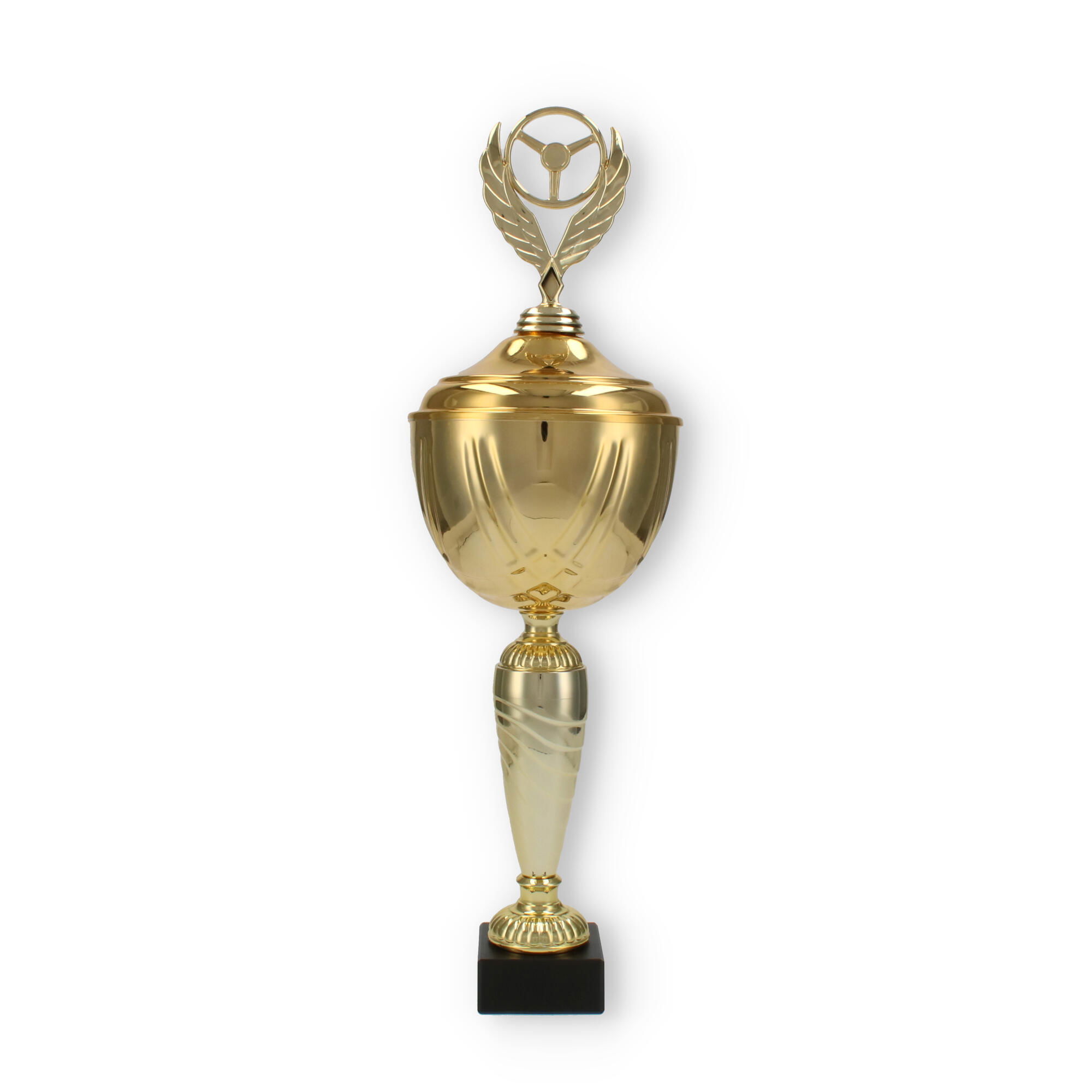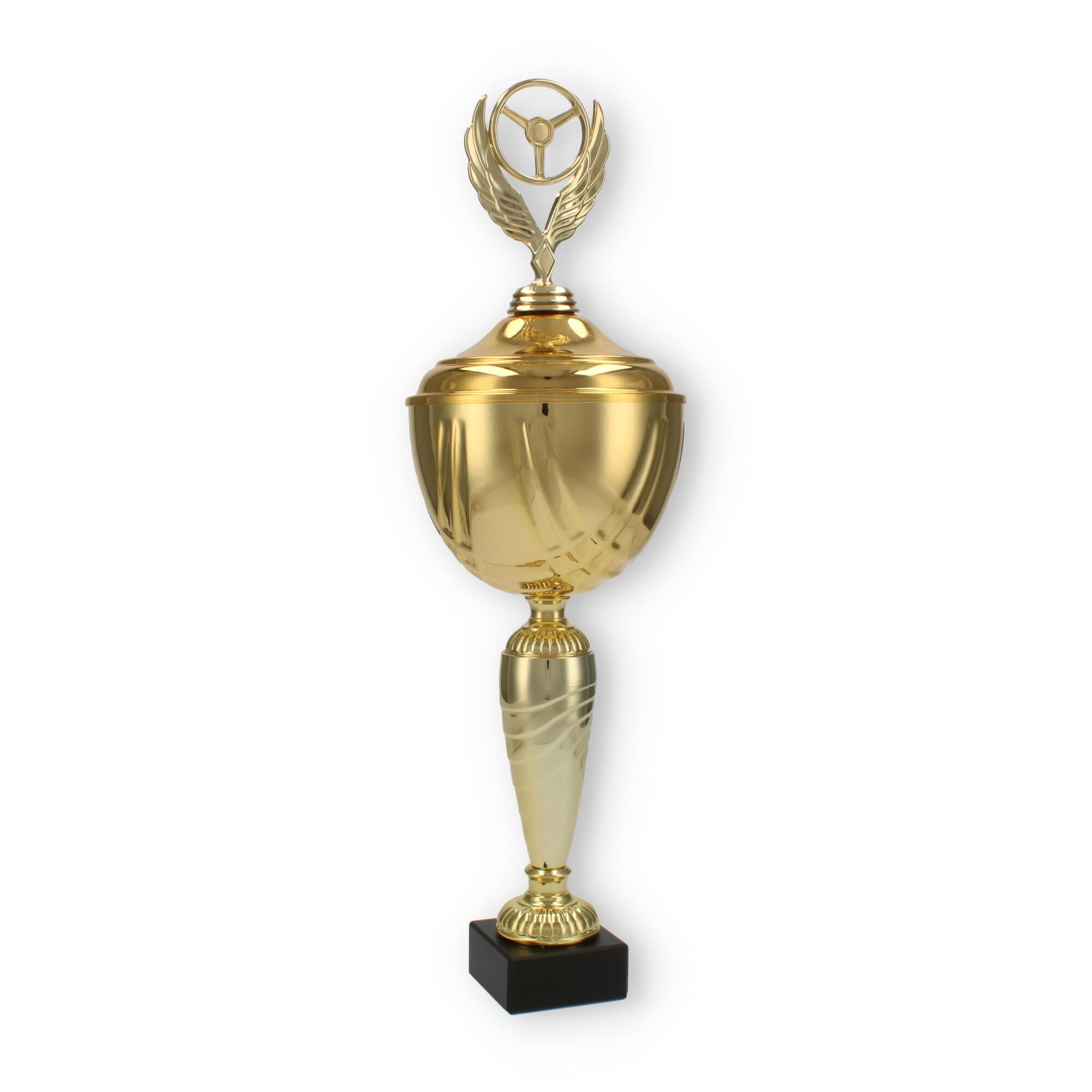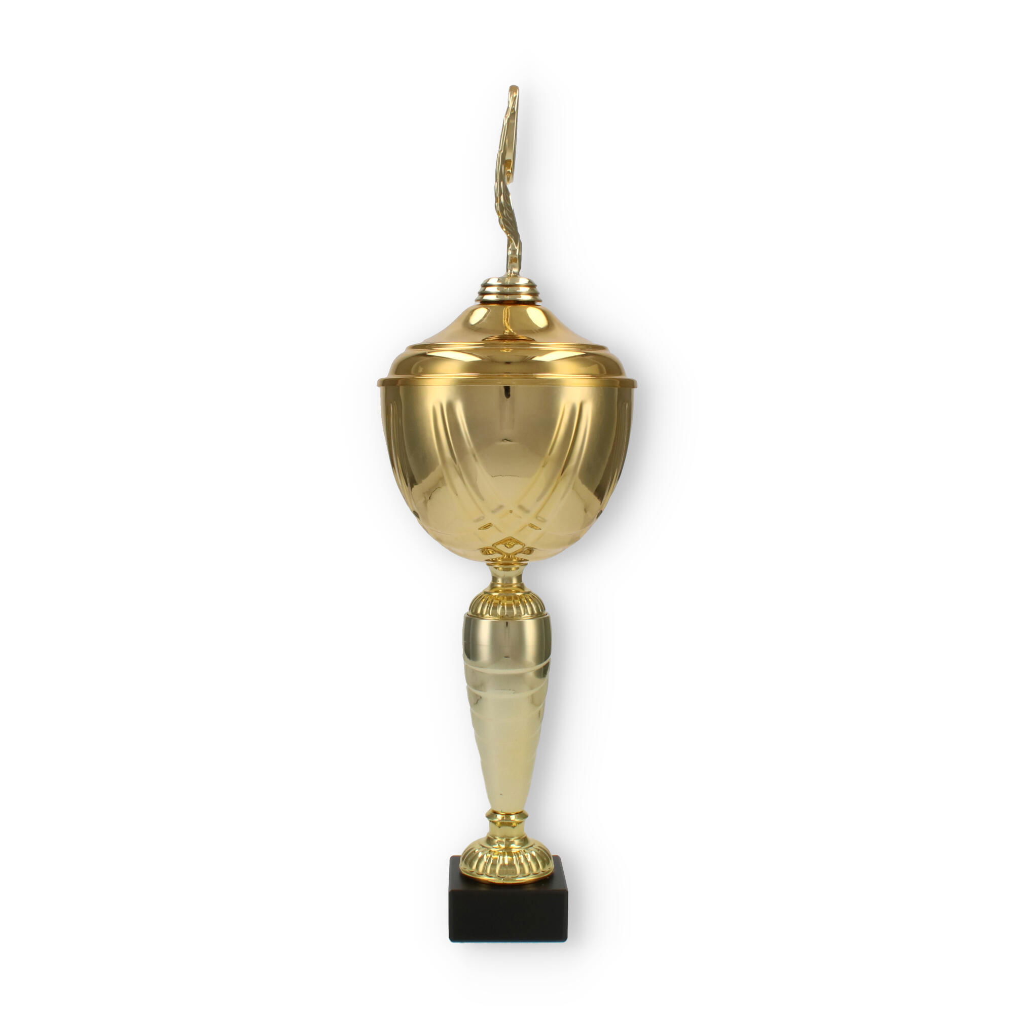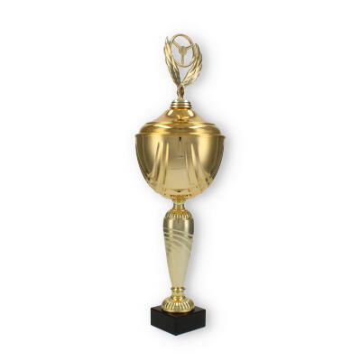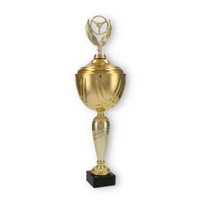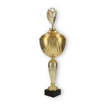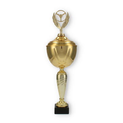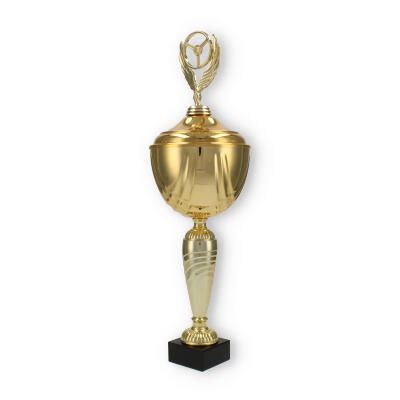 Le trophée présente une figurine ailée en plastique doré, surmontant un couvercle métallique également doré, donnant une impression de brillance et de dynamisme. Le pied et le gobelet partagent également cette teinte dorée, créant un ensemble harmonieux qui respire l'élégance.