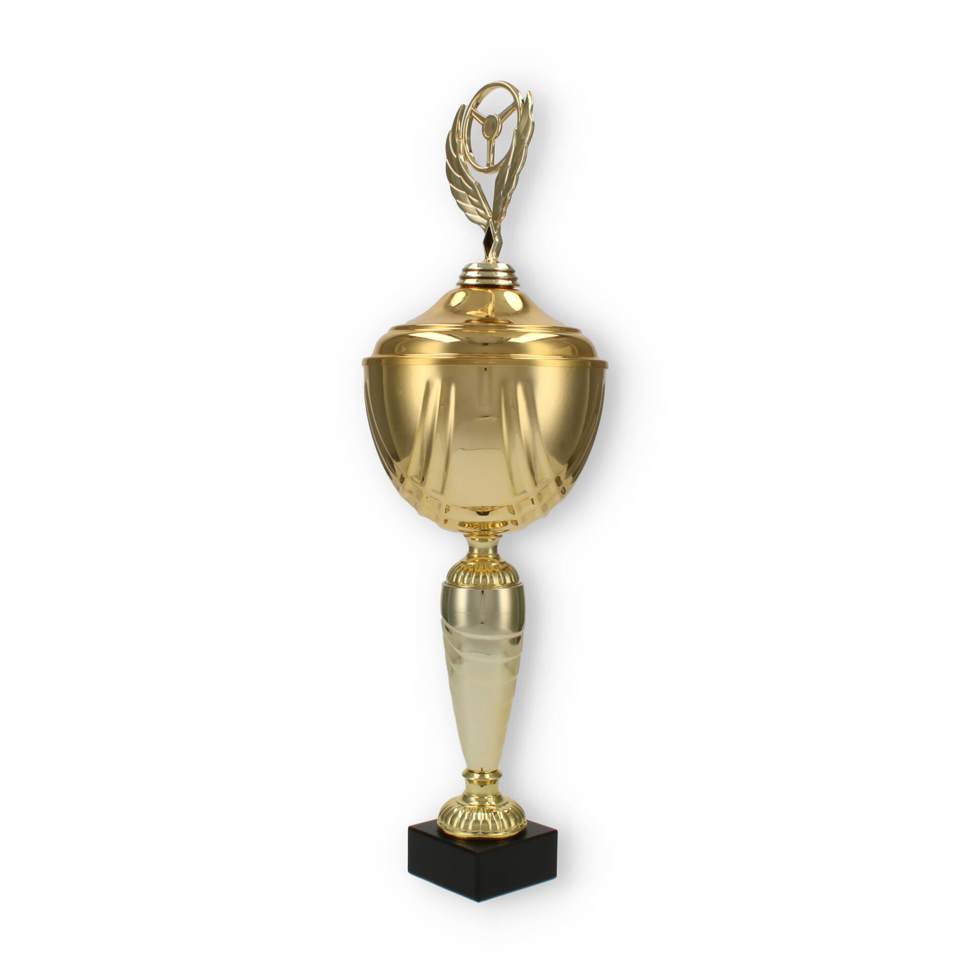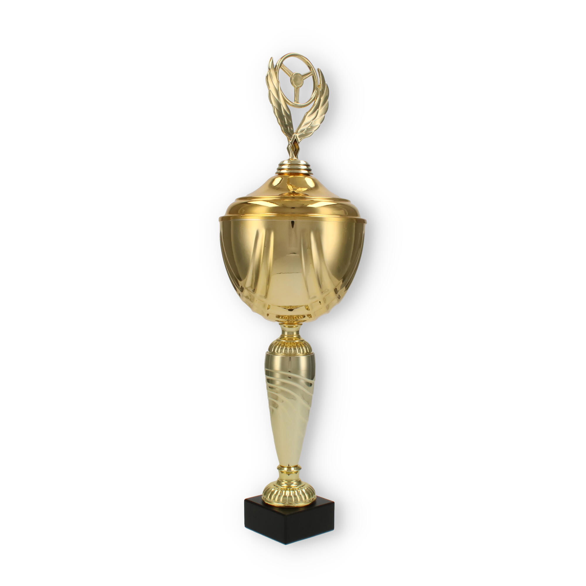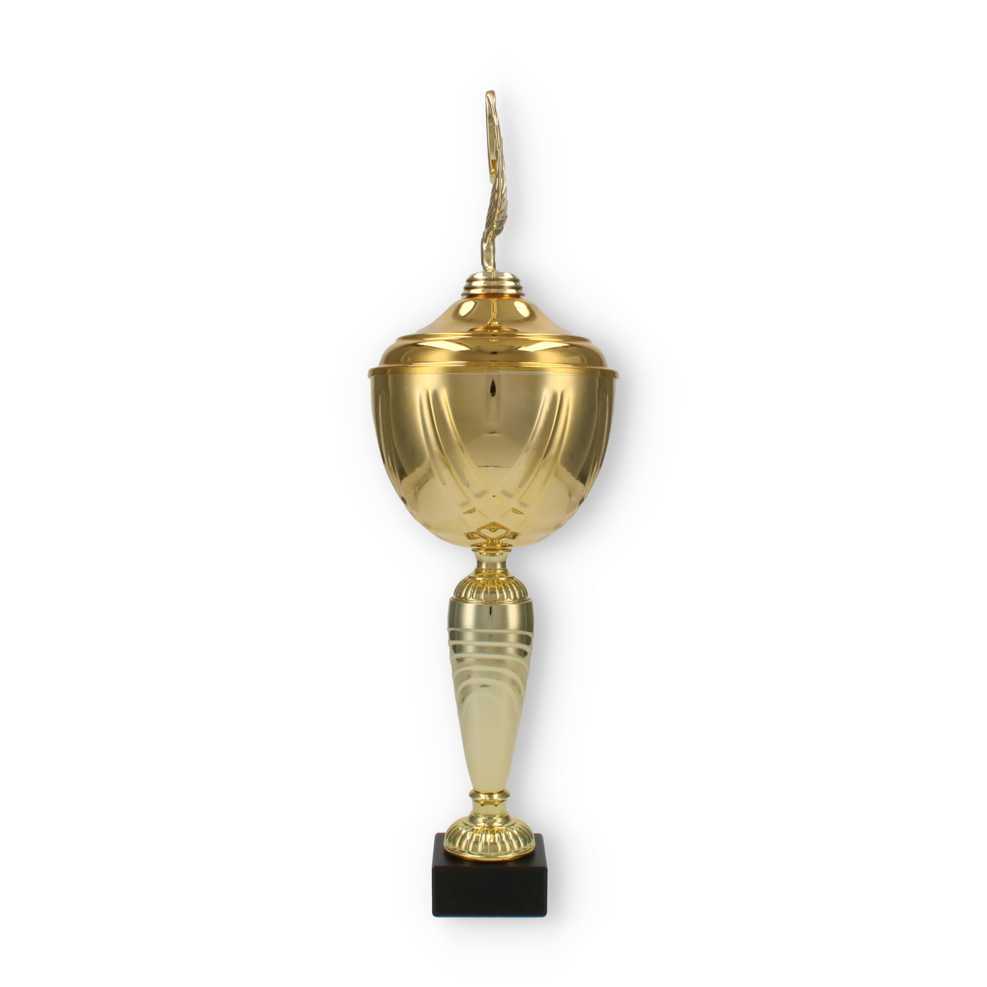 Le trophée présente une figurine ailée en plastique doré, surmontant un couvercle métallique également doré, donnant une impression de brillance et de dynamisme. Le pied et le gobelet partagent également cette teinte dorée, créant un ensemble harmonieux qui respire l'élégance.