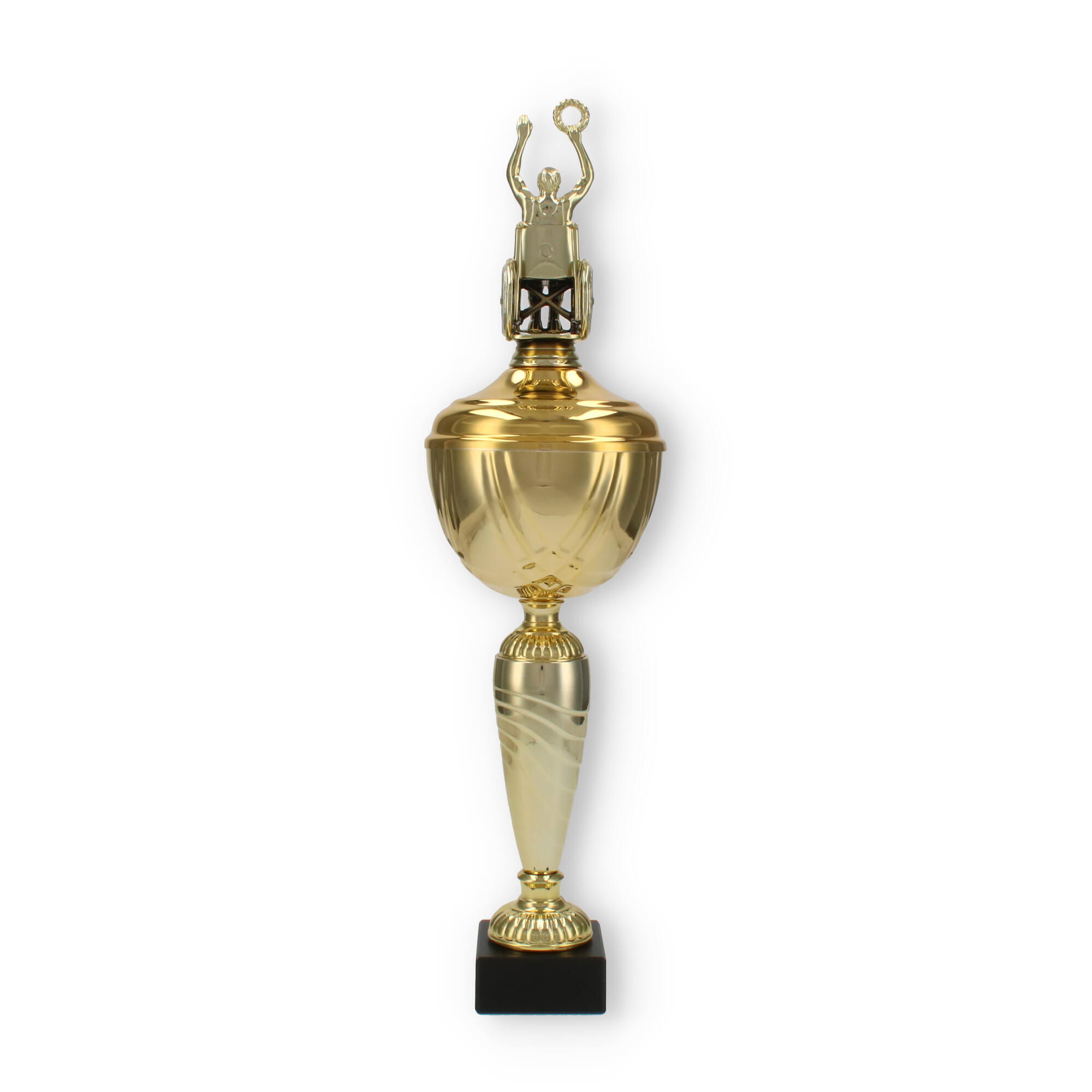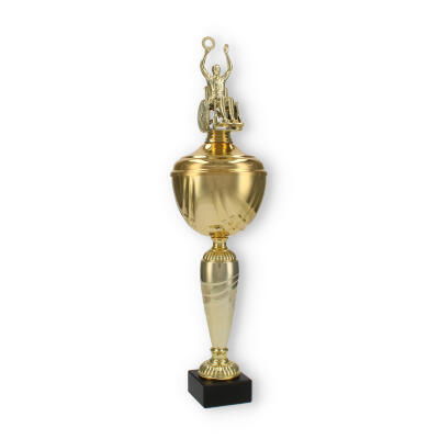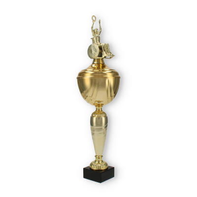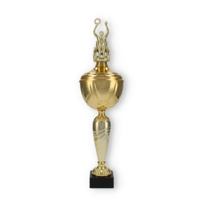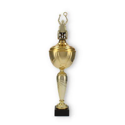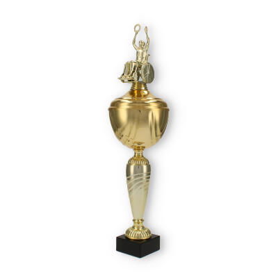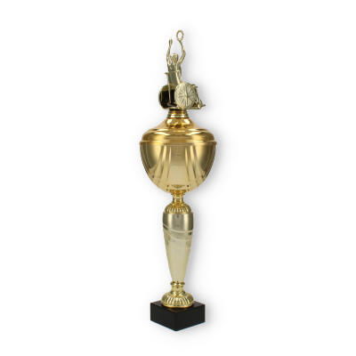 The trophy includes a gold-colored engraving plate at the base, perfectly matching its dimensions and adding the final flourish to this remarkable piece. This detail aligns with the overall elegant design, ensuring a polished look at every angle.