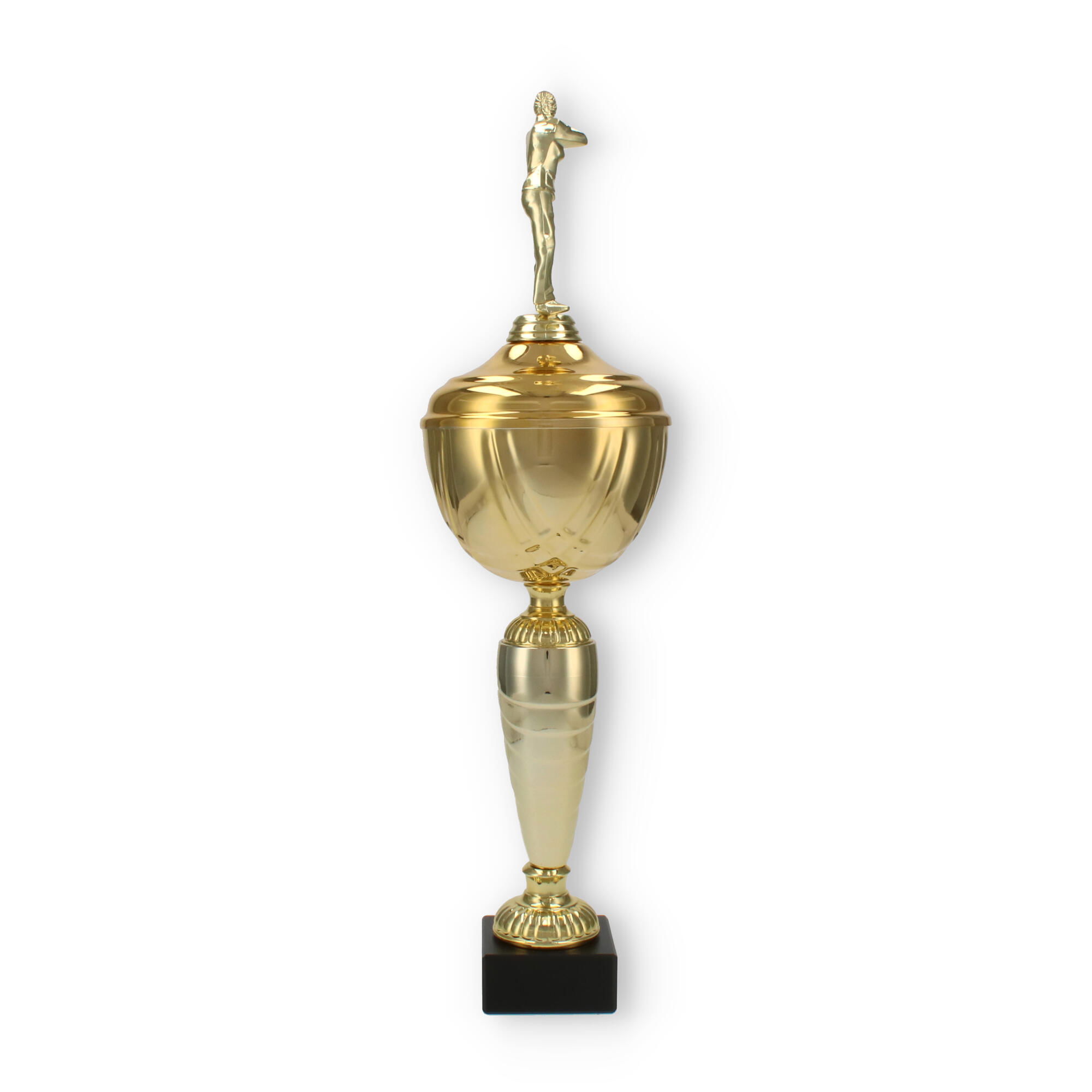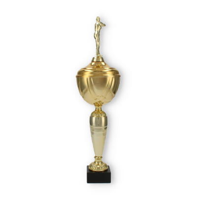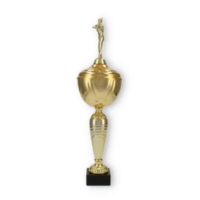 Kupanın dikkat çekici tasarımı, yukarıya doğru incelen sütun yapısıyla başlar. Bu sütun, şık spirallerle tamamlanarak dinamik bir estetik sunar. Altın renkli kaplama, kaliteli plastik malzeme ile birleşerek göz alıcı bir görünüm oluşturur.