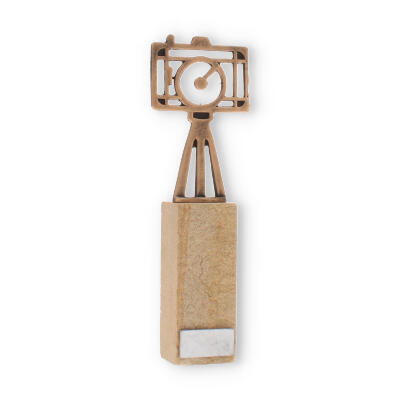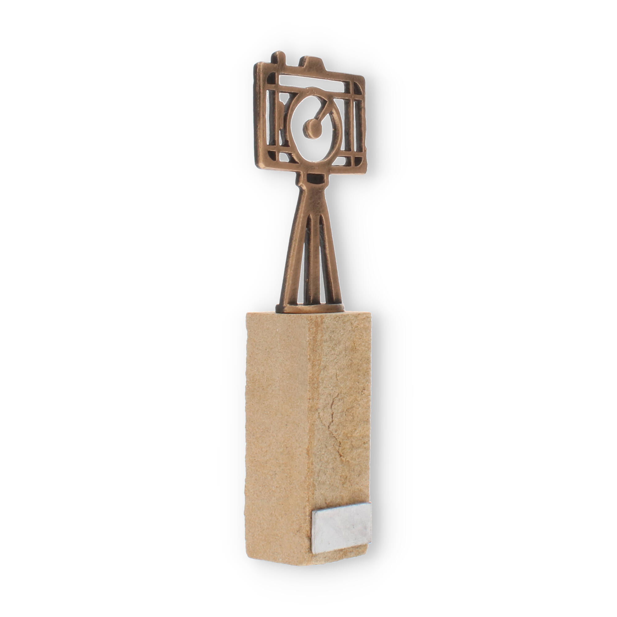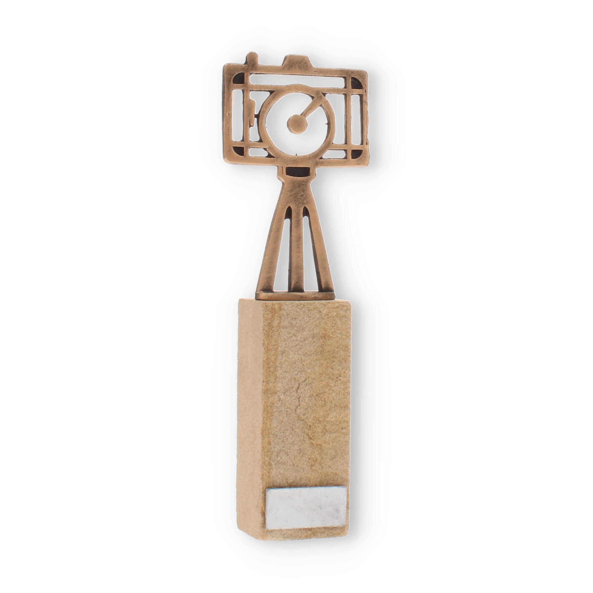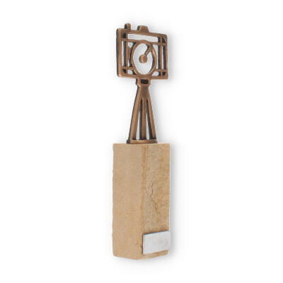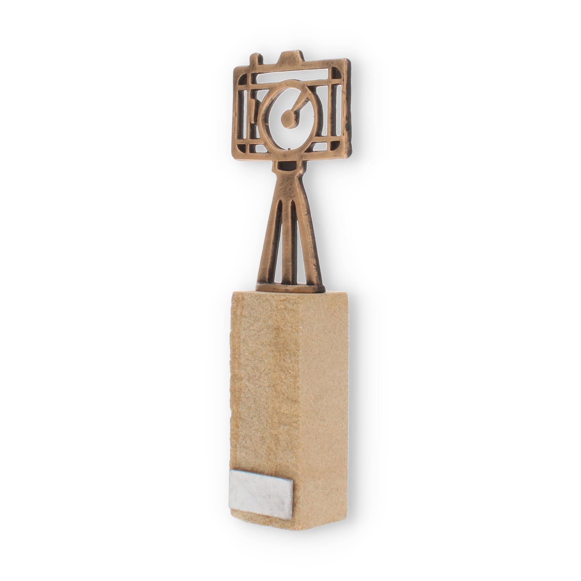 The Trophies with a contour figure of a camera embody a modern and minimalist design, perfect for acknowledging milestones in photography and media. The base, cut from natural sandstone, offers a textured, organic look that contrasts beautifully with the sleek, bronzefarbener metal camera figure mounted on top.