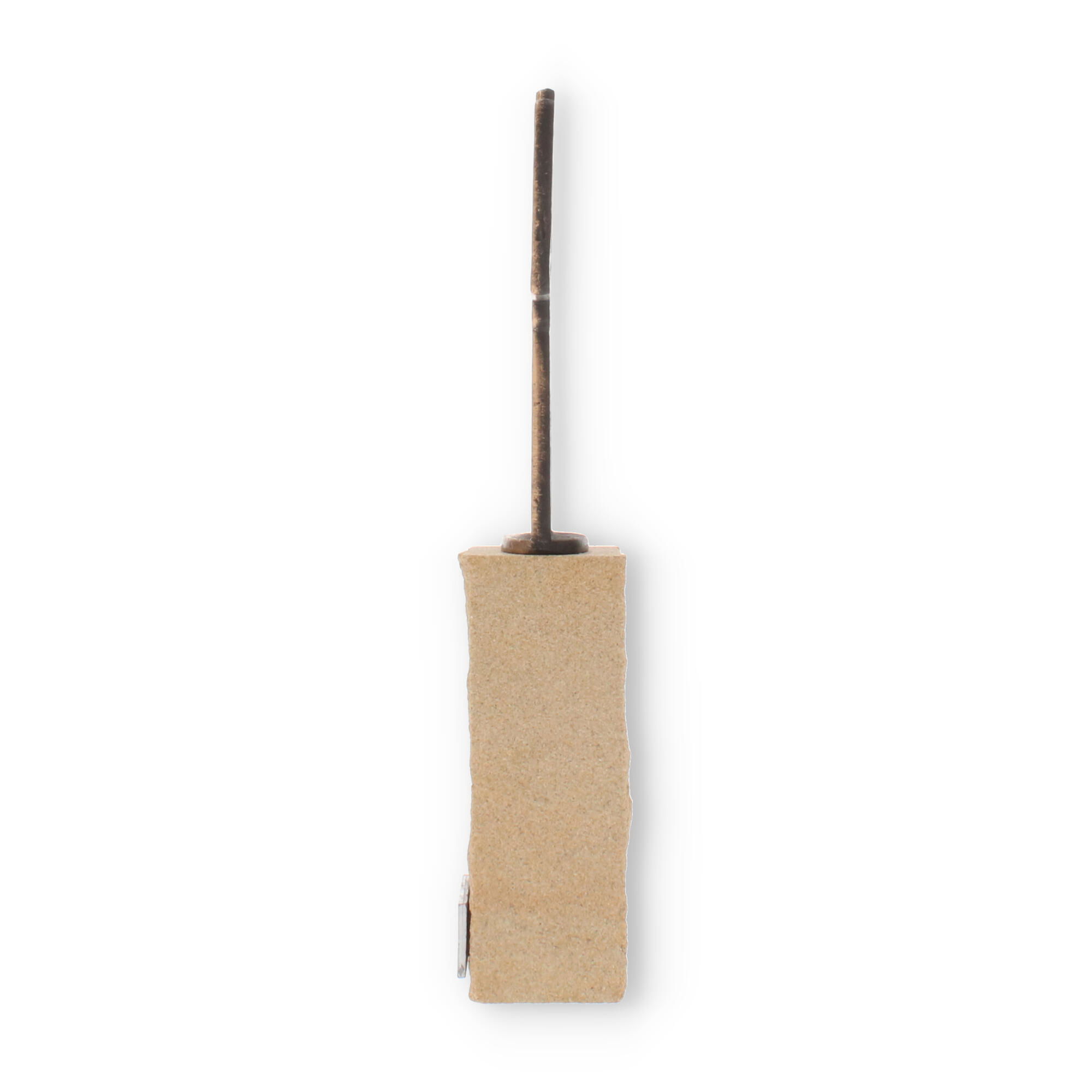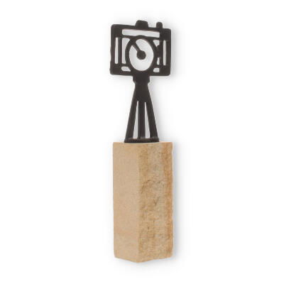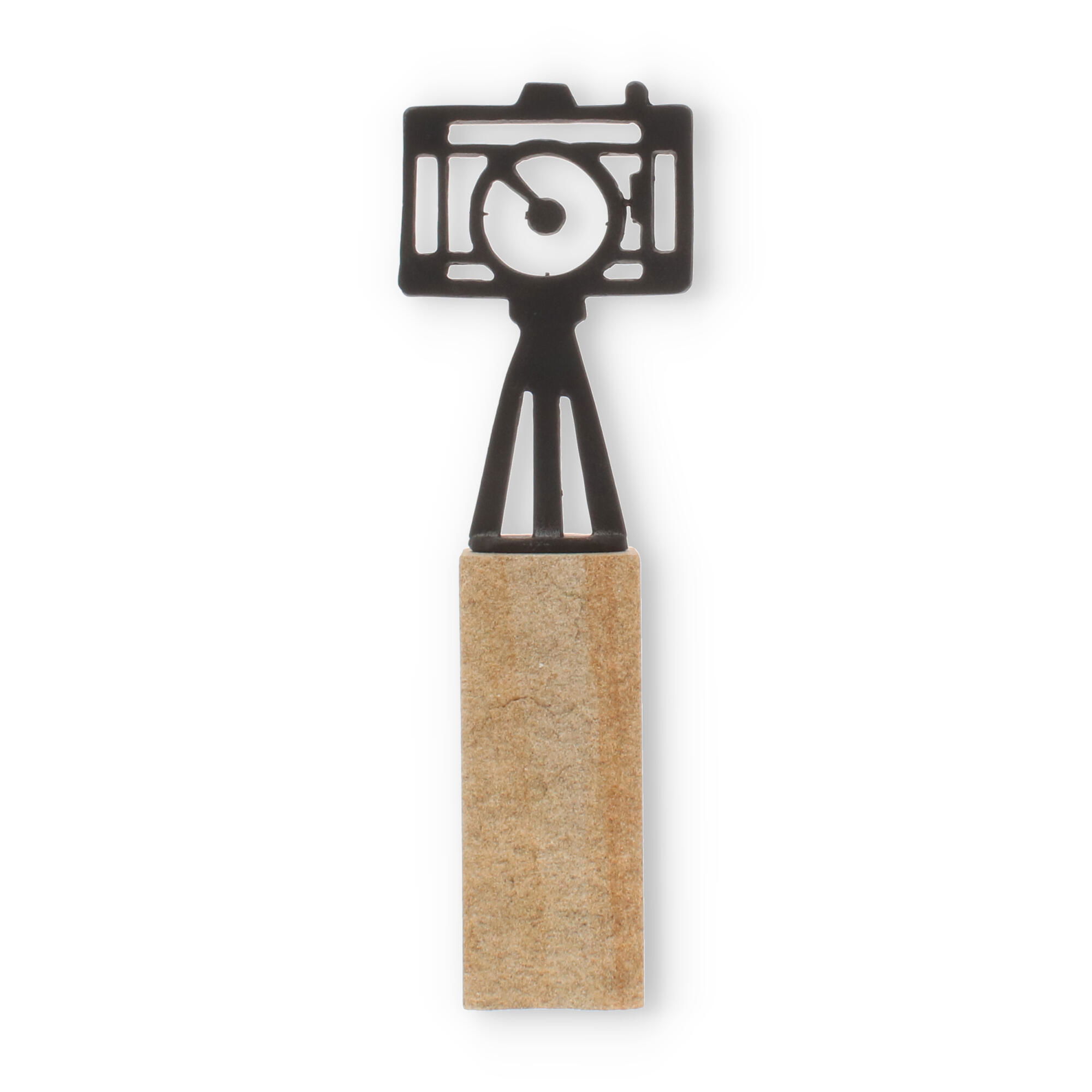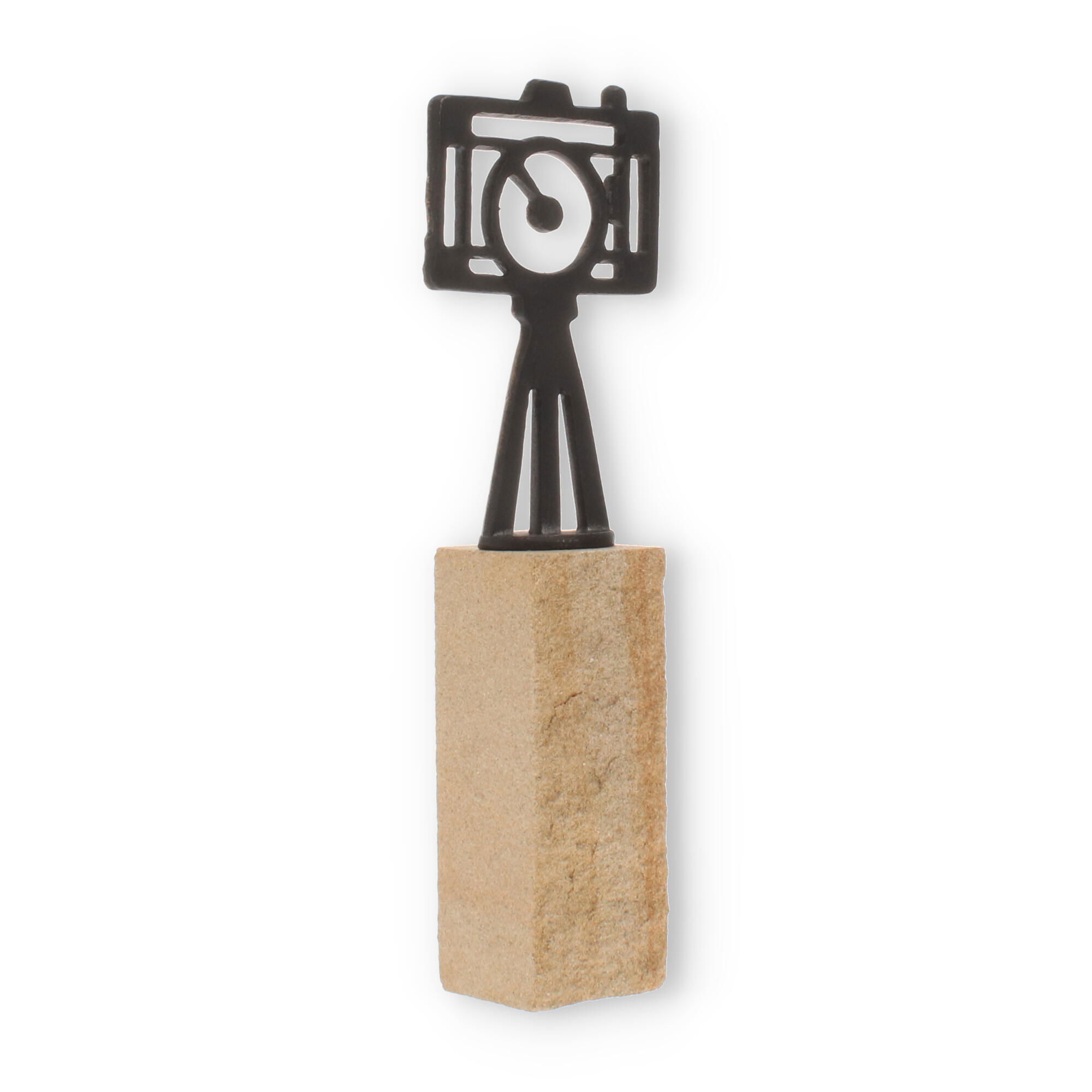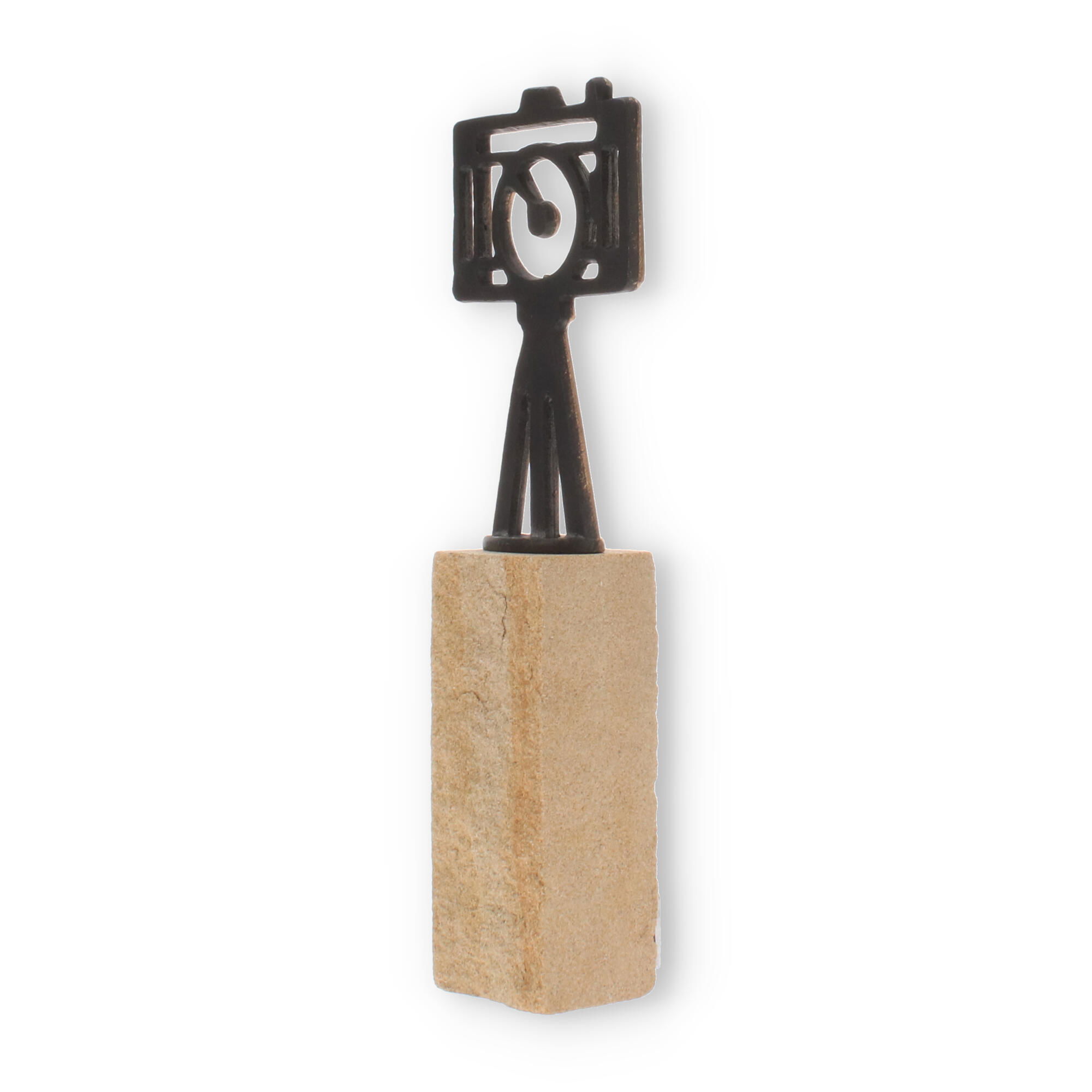 The Trophies with a contour figure of a camera embody a modern and minimalist design, perfect for acknowledging milestones in photography and media. The base, cut from natural sandstone, offers a textured, organic look that contrasts beautifully with the sleek, bronzefarbener metal camera figure mounted on top.