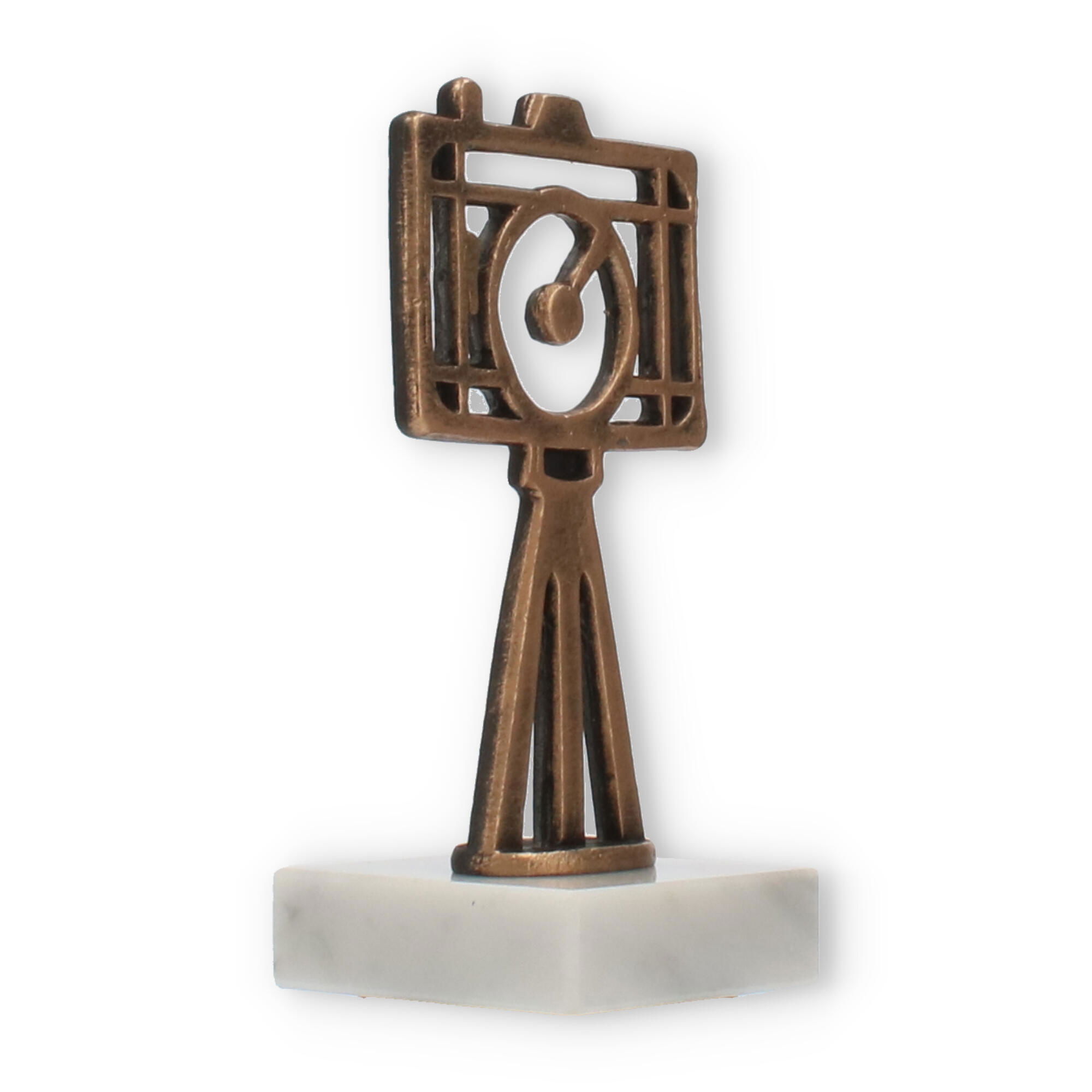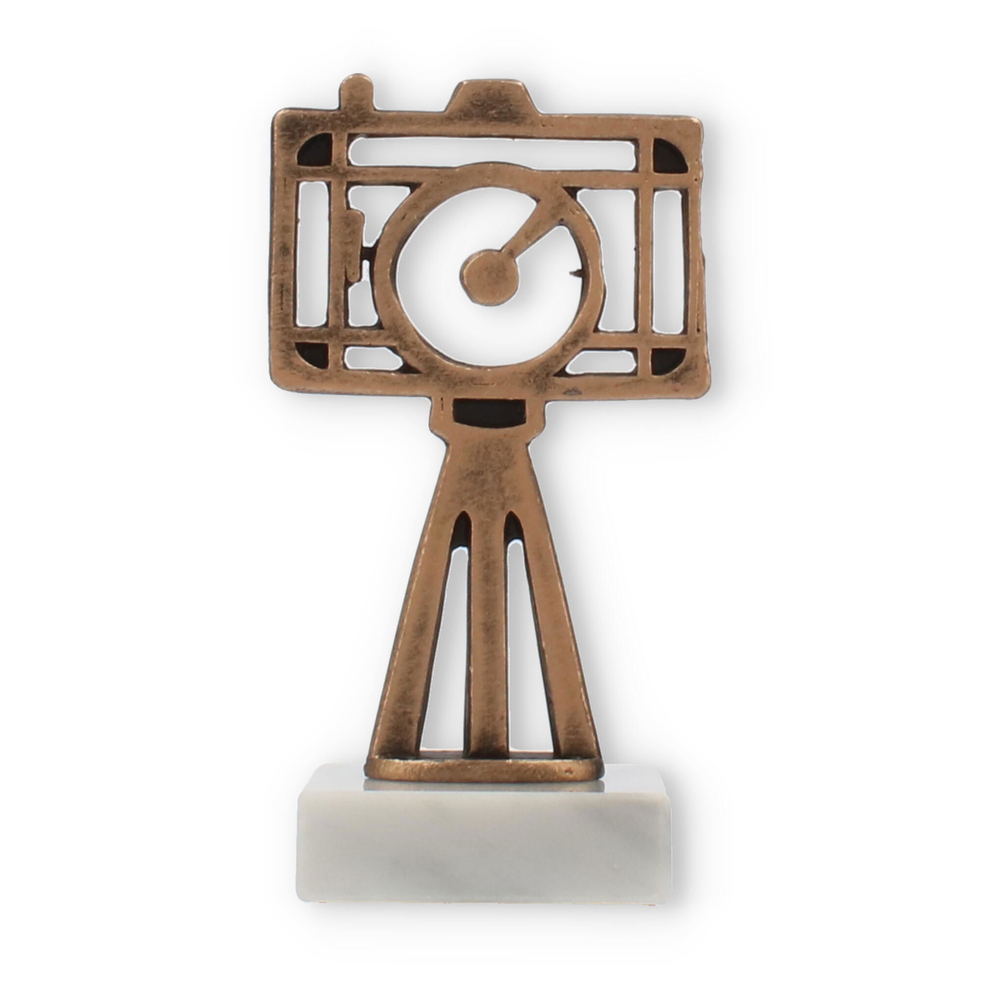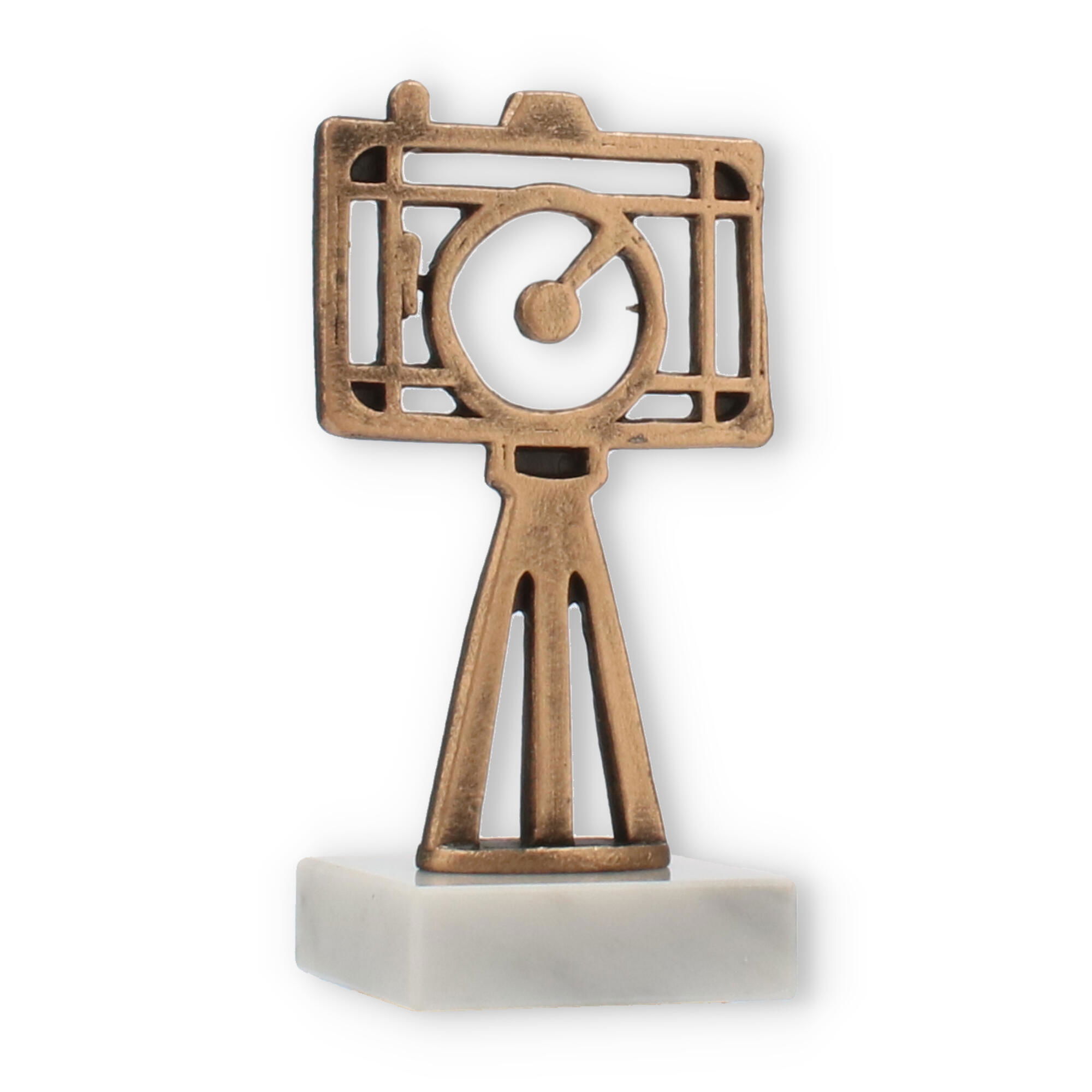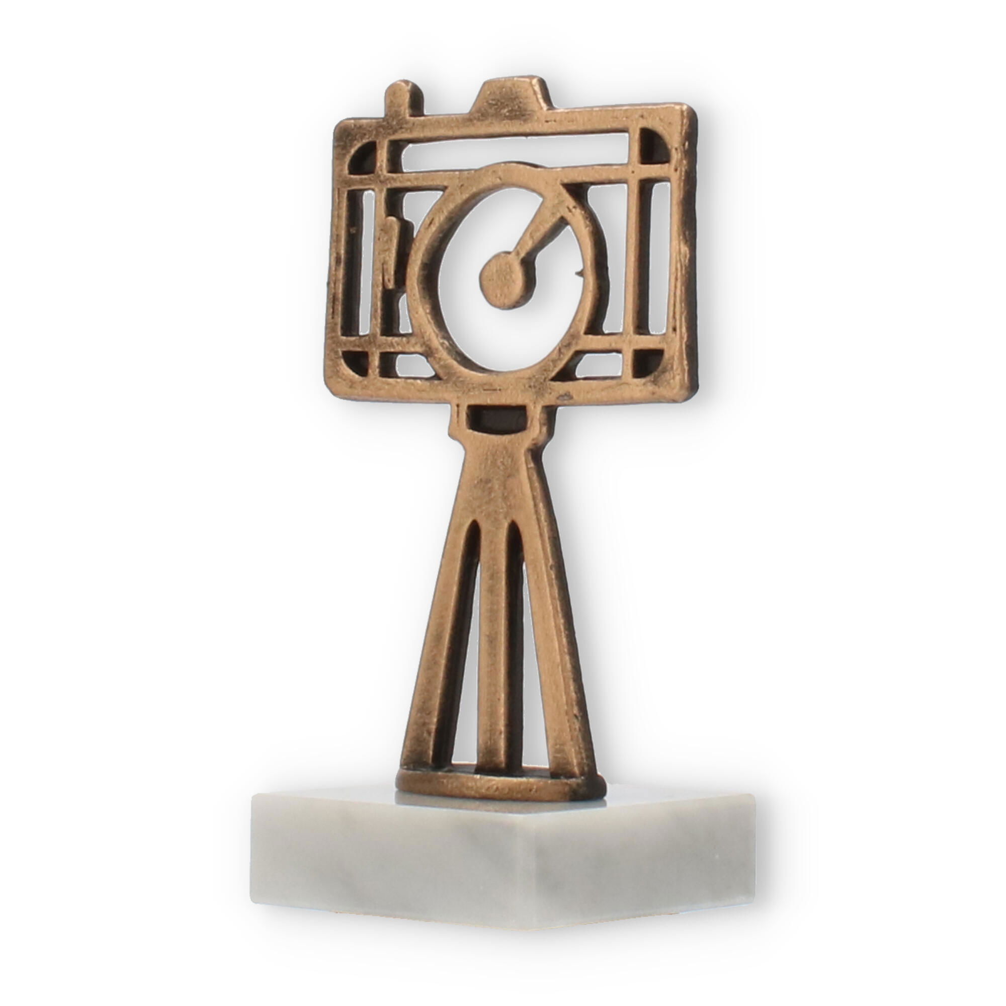 Supporting this eye-catching figure is a smooth white marble base. The natural veining and glossy finish of the marble provide an elegant contrast to the bronzed hue of the camera, creating a balanced and harmonious look. The base is sturdy and offers a stable foundation, enhancing the overall aesthetic appeal of the trophy.
