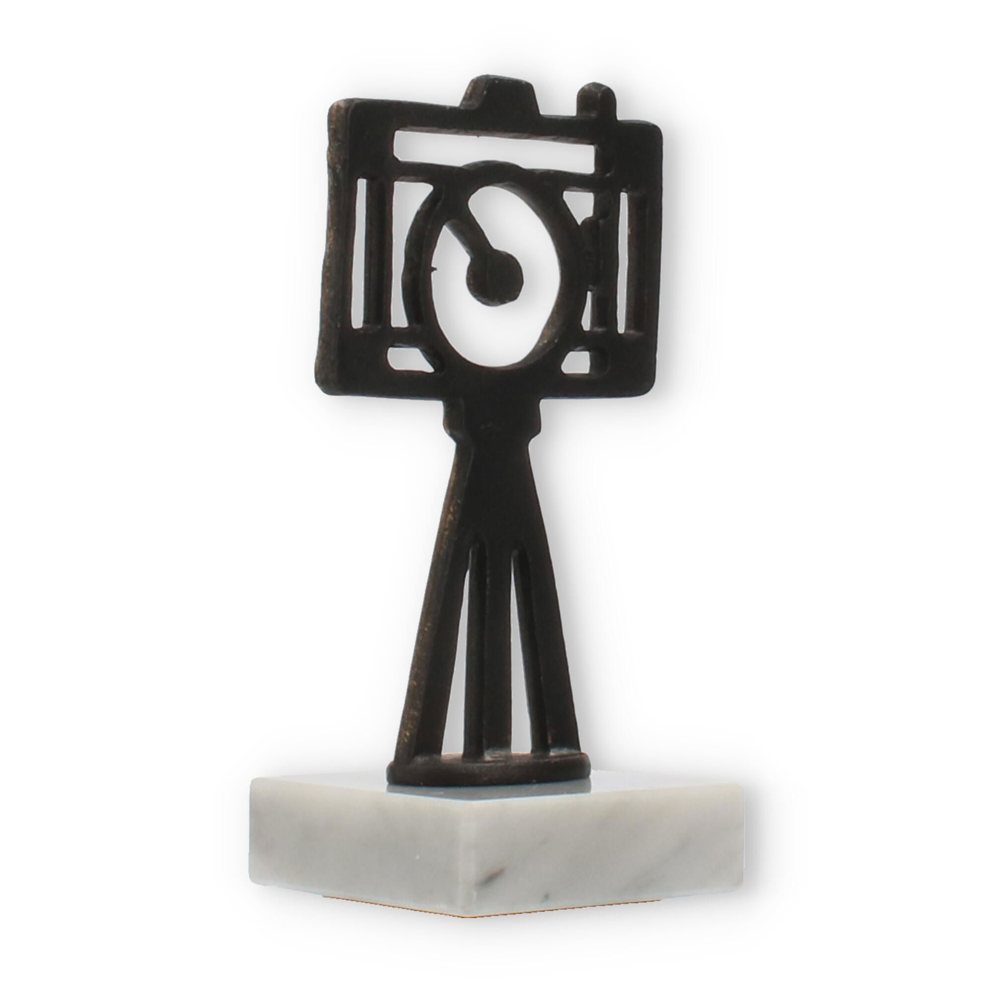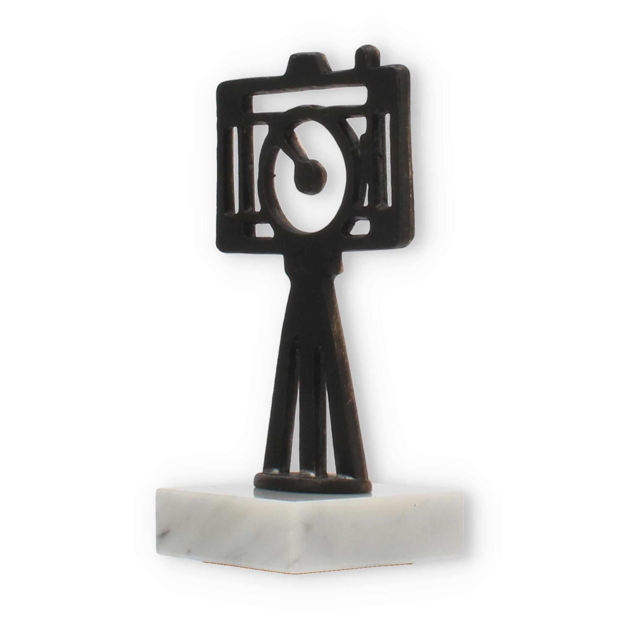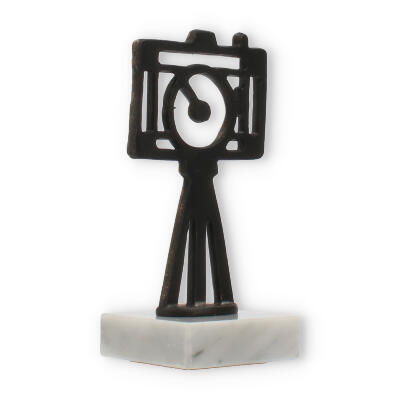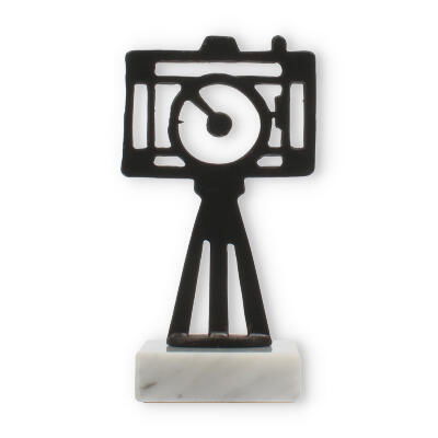 The upper part of the trophy showcases an old gold-colored camera figure mounted on a tripod. This figure is crafted from zamac, a robust metal that ensures longevity and resistance to wear. With its detailed yet minimalistic design, the camera represents both tradition and innovation in photography.