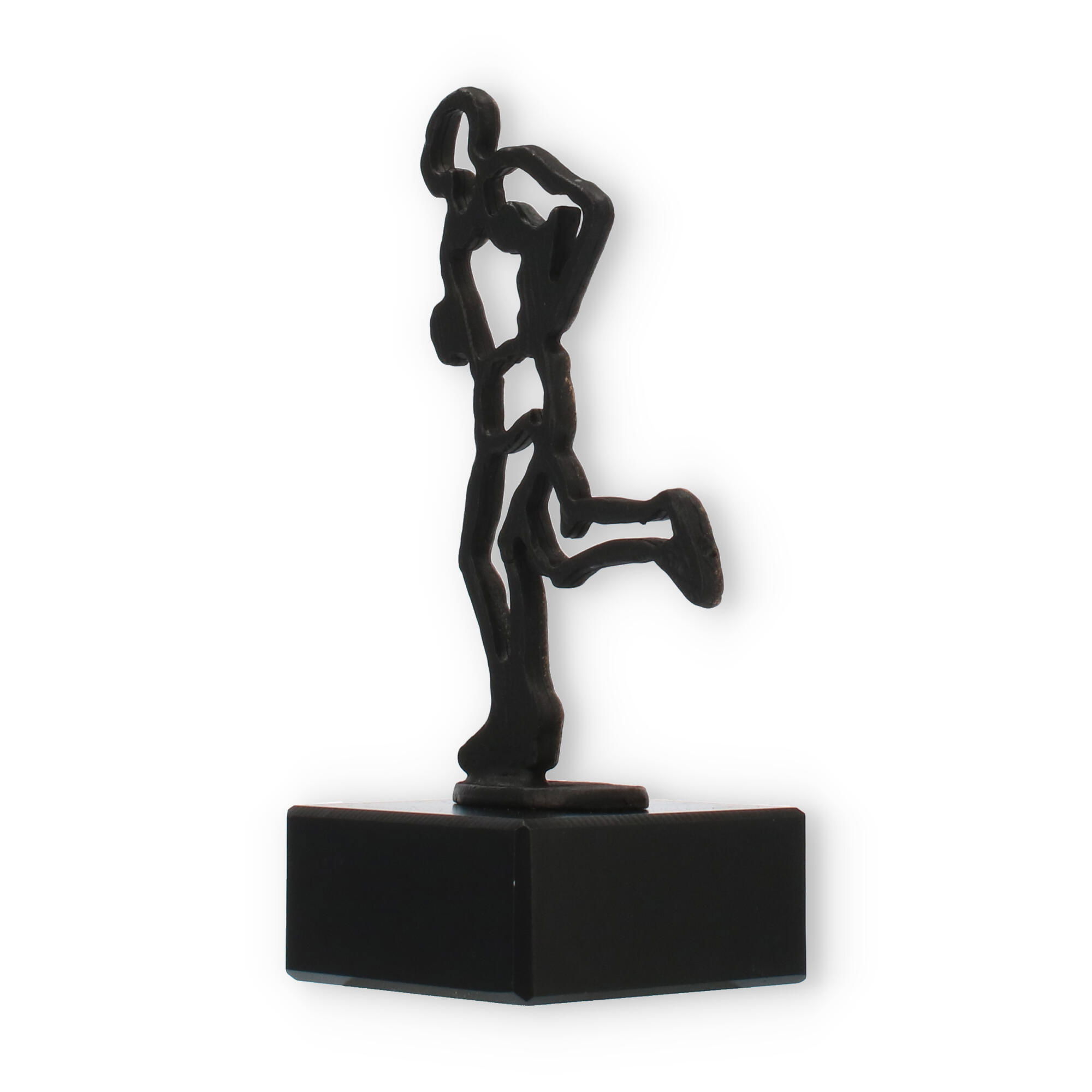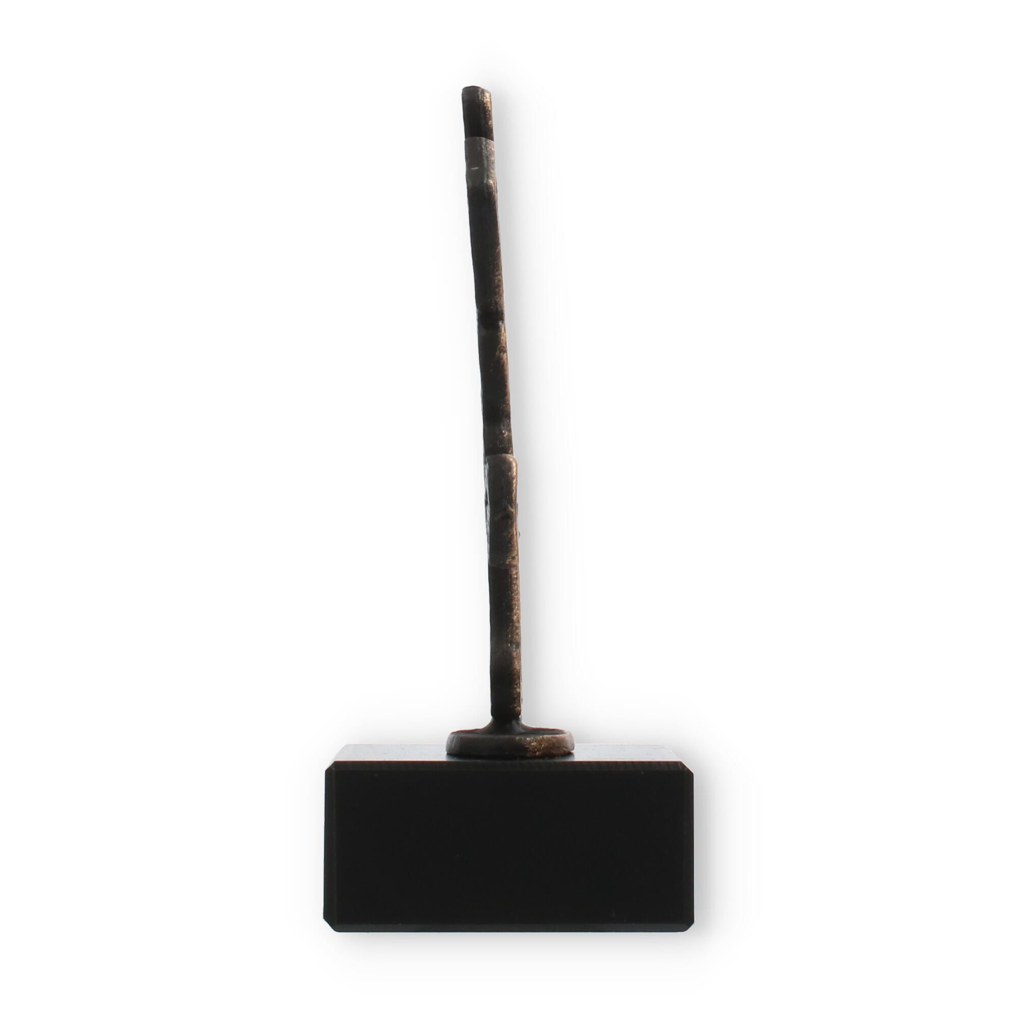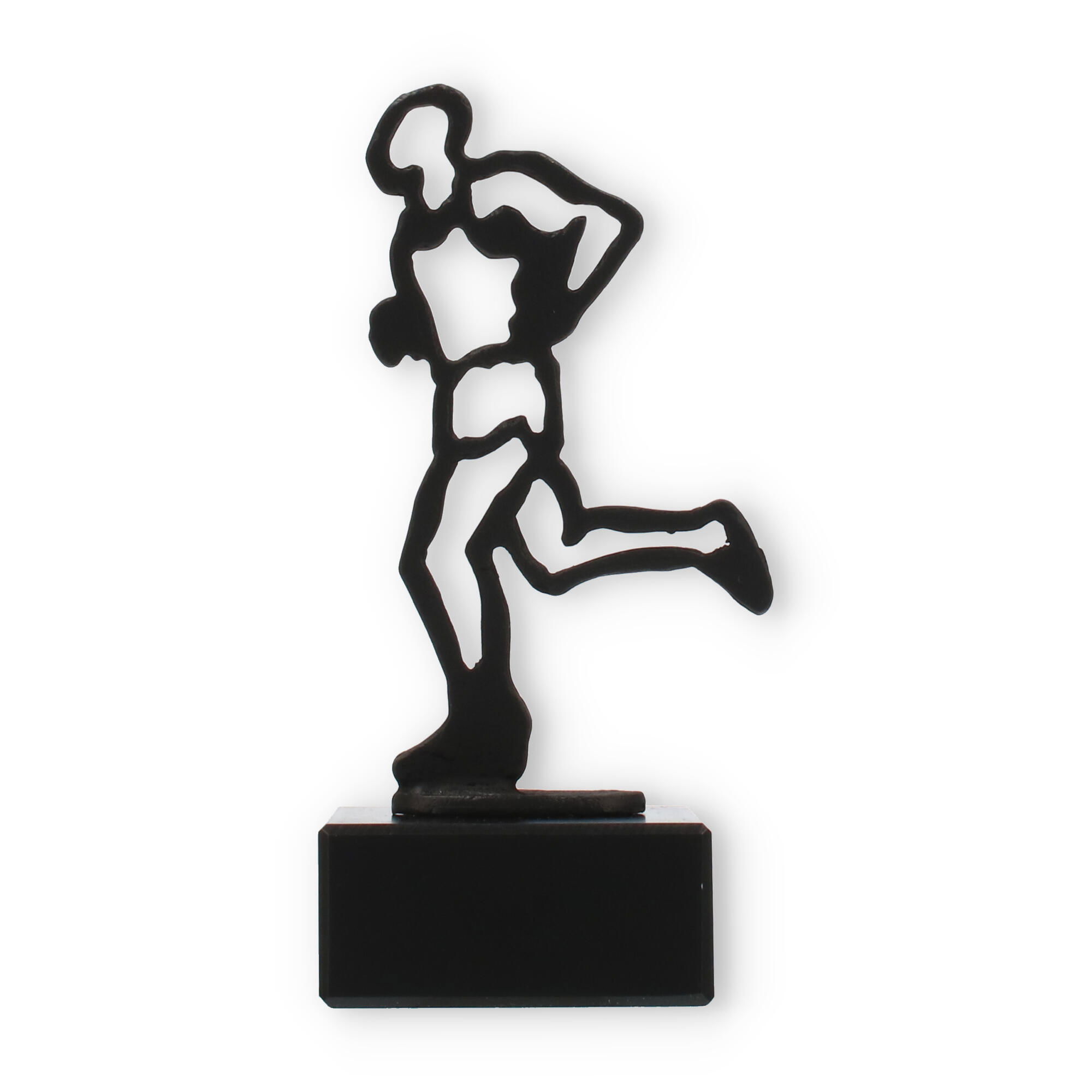Ce trophée arbore une figurine de métal couleur or ancien, parfaitement montée sur un socle en marbre noir. Son style minimaliste et expressif en fait une pièce unique qui est à la fois élégante et distinctive. La plaque de gravure, réalisée en plastique doré résistant, permet une personnalisation complète, rendant chaque distinction encore plus spéciale.