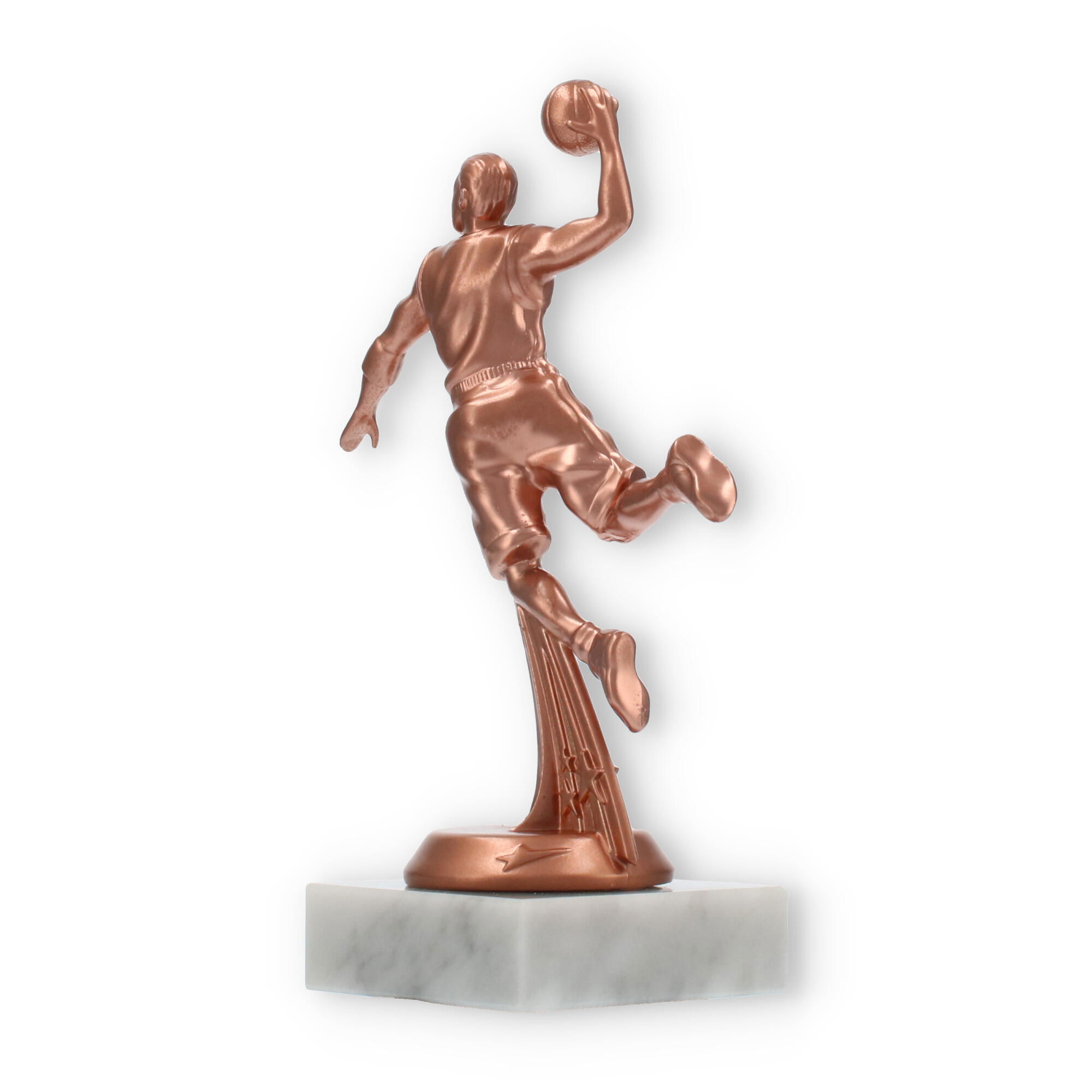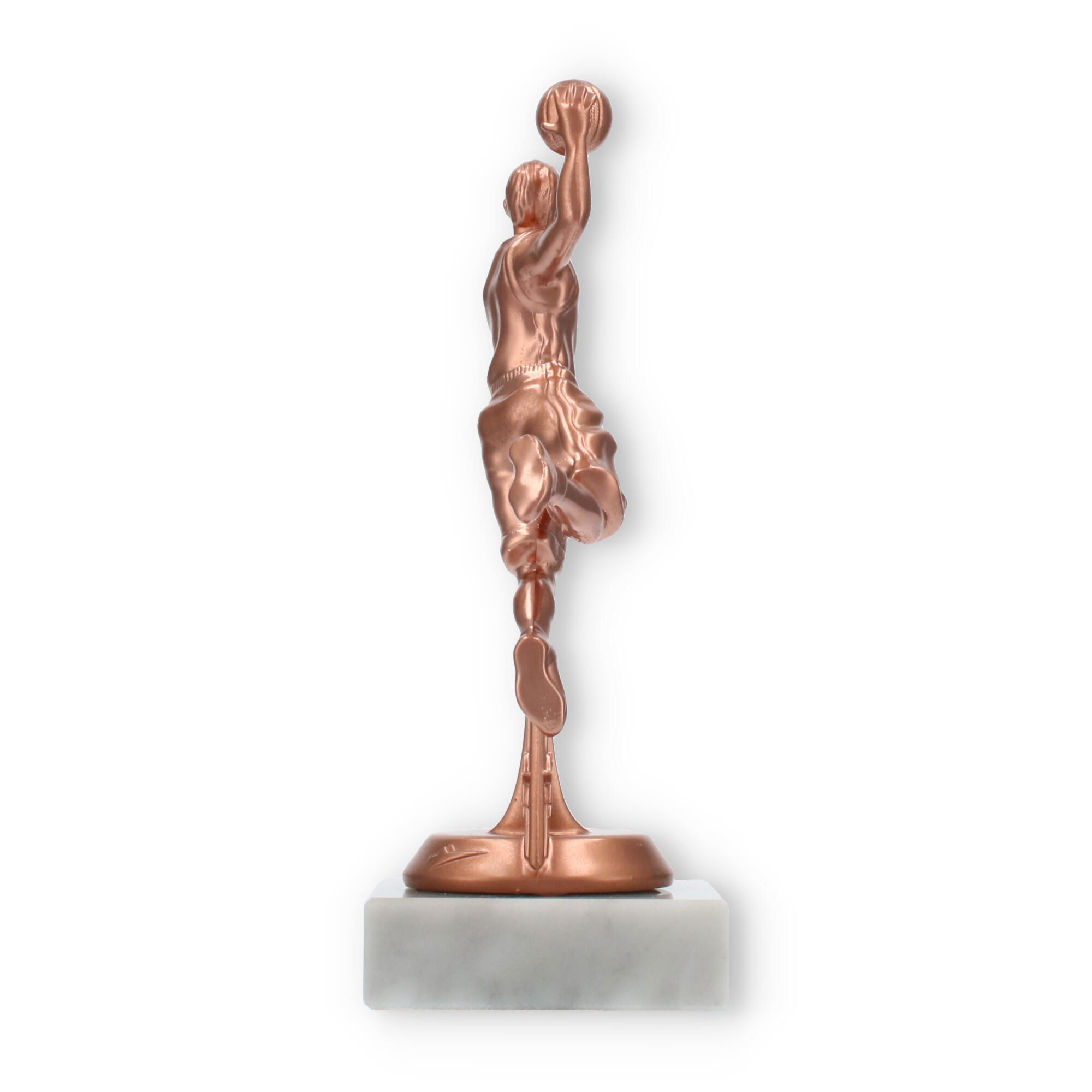Der Sockel besteht aus robustem Marmor und bietet der Figur eine solide Basis. Die weiße Farbe des Marmors hebt die bronzefarbene Figur zusätzlich hervor und sorgt für einen eleganten Kontrast. Diese Kombination aus Materialien macht den Pokal Basketballspieler zu einem optischen Highlight.
