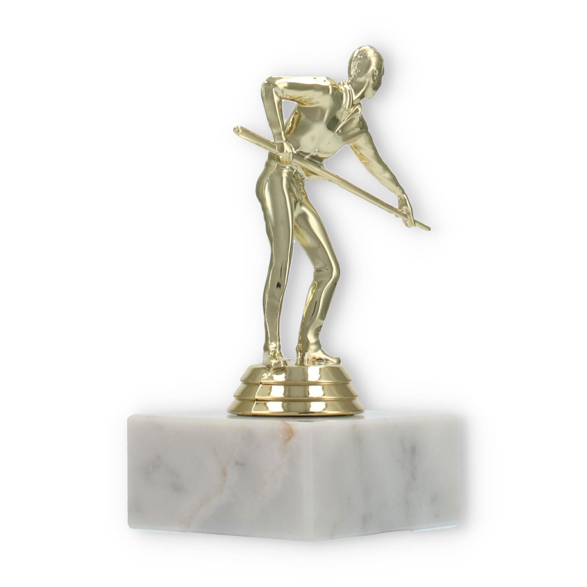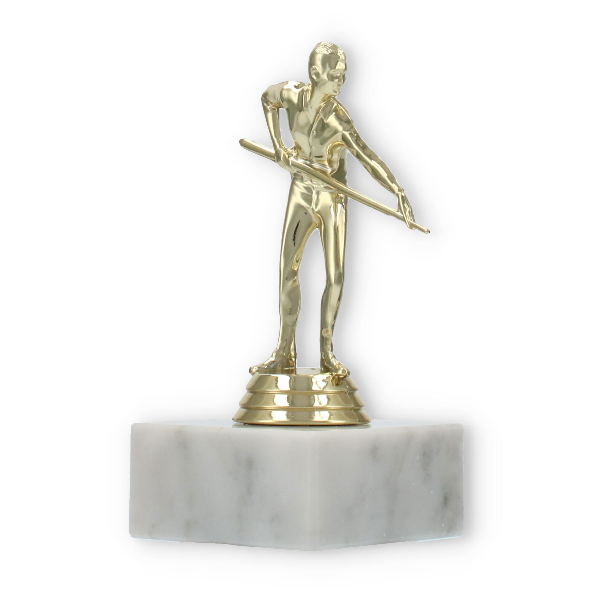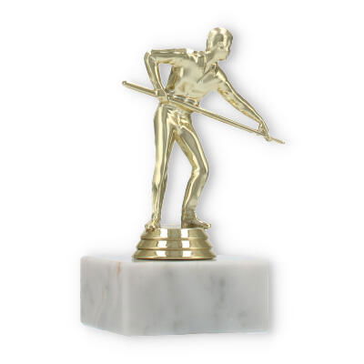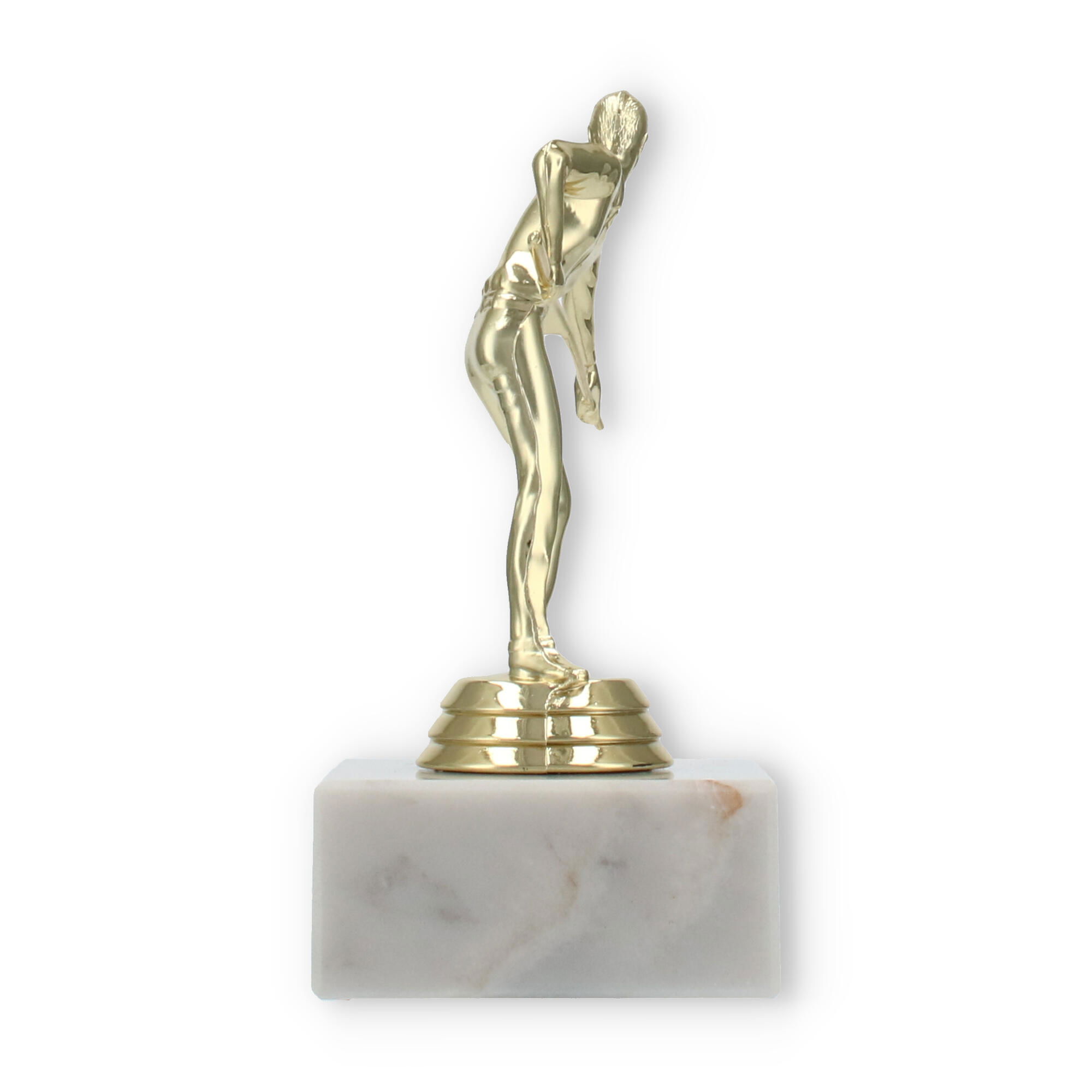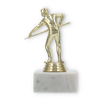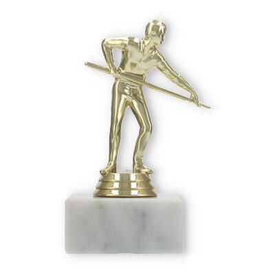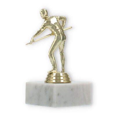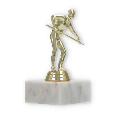 La figura se alza sobre una sólida base de mármol blanco, ofreciendo un contraste clásico y elegante. Los materiales utilizados para este trofeo garantizan tanto su durabilidad como su atractivo visual, convirtiéndolo en uno de los favoritos para reconocer los logros más destacados en el billar.