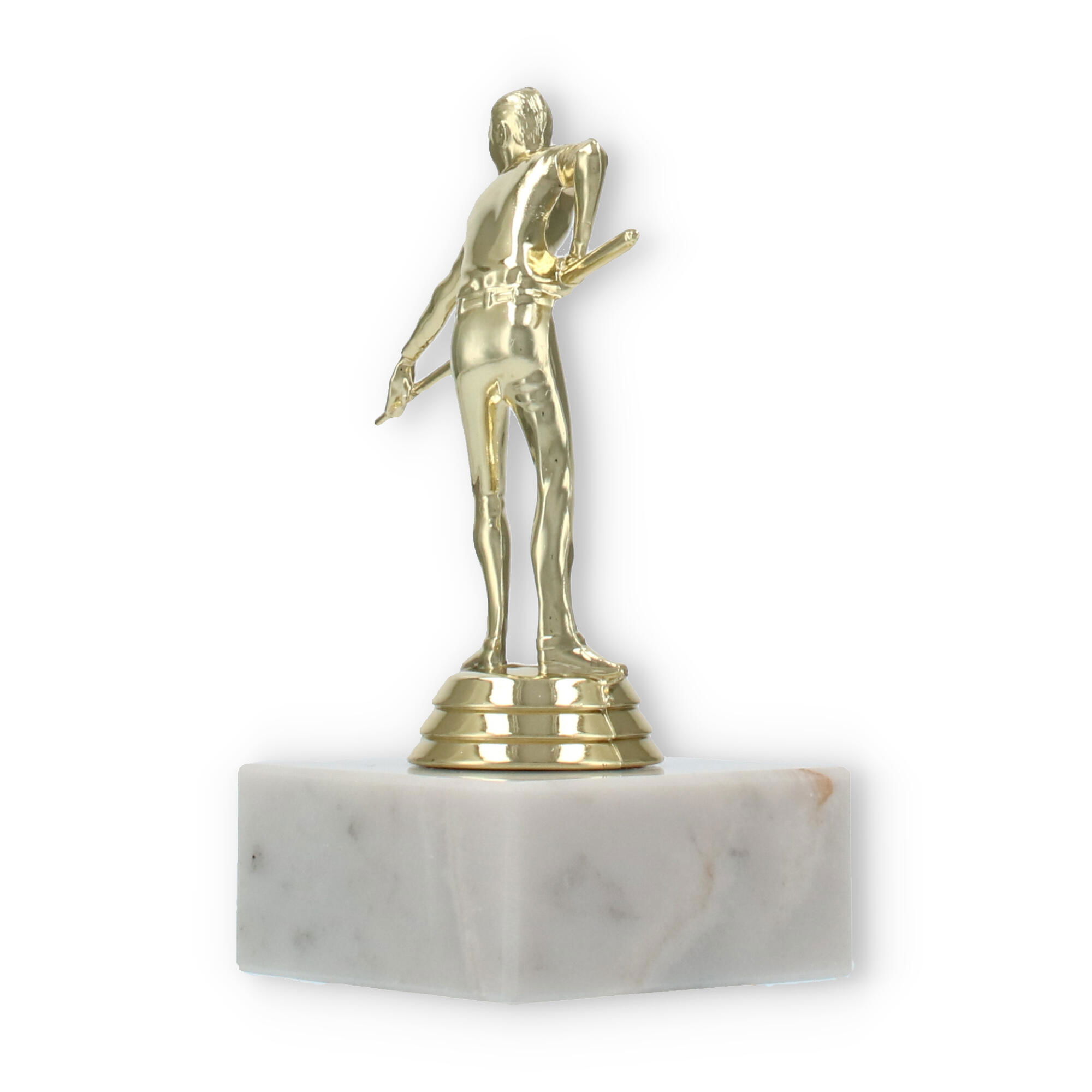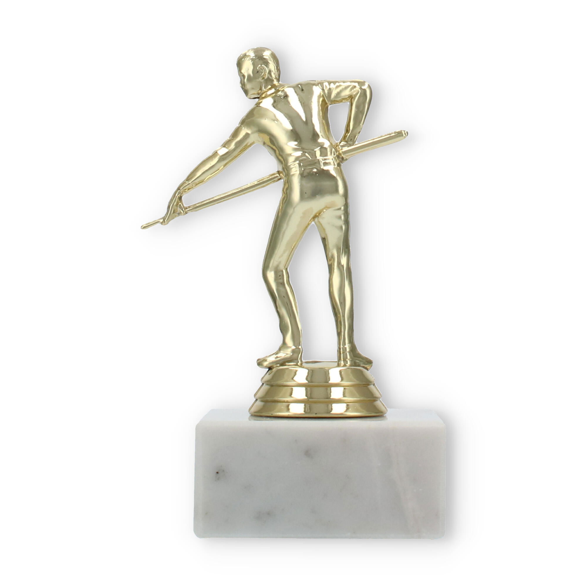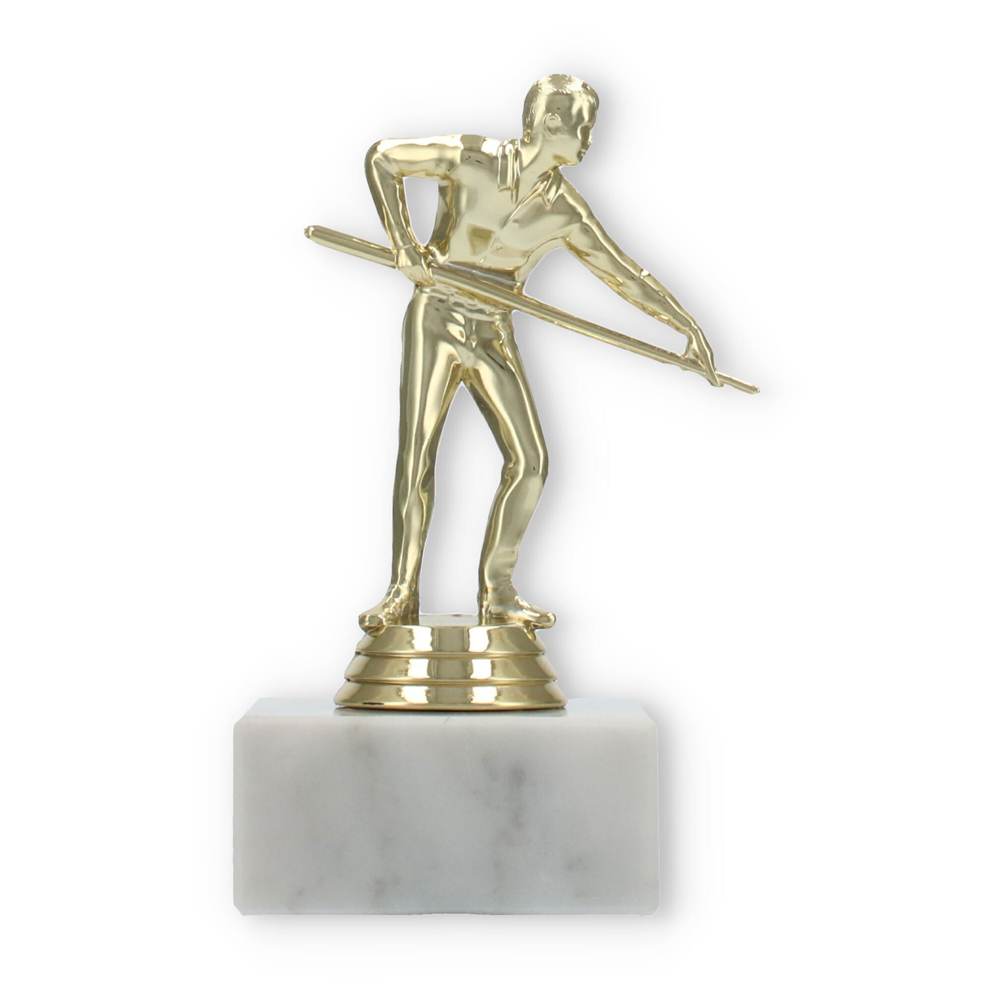La figura se alza sobre una sólida base de mármol blanco, ofreciendo un contraste clásico y elegante. Los materiales utilizados para este trofeo garantizan tanto su durabilidad como su atractivo visual, convirtiéndolo en uno de los favoritos para reconocer los logros más destacados en el billar.