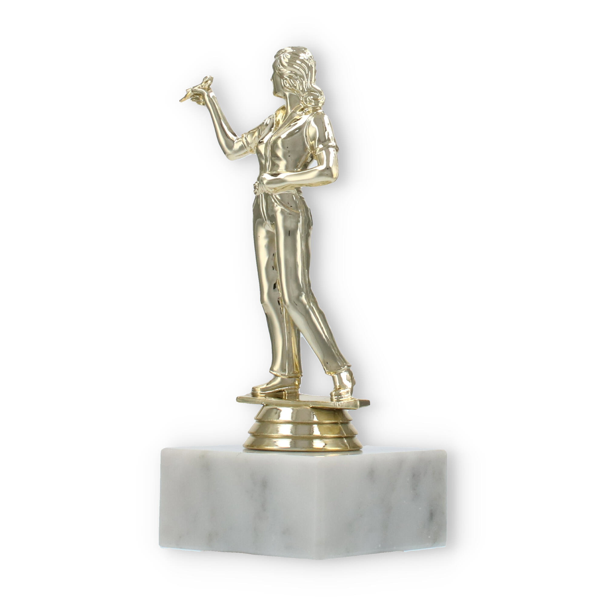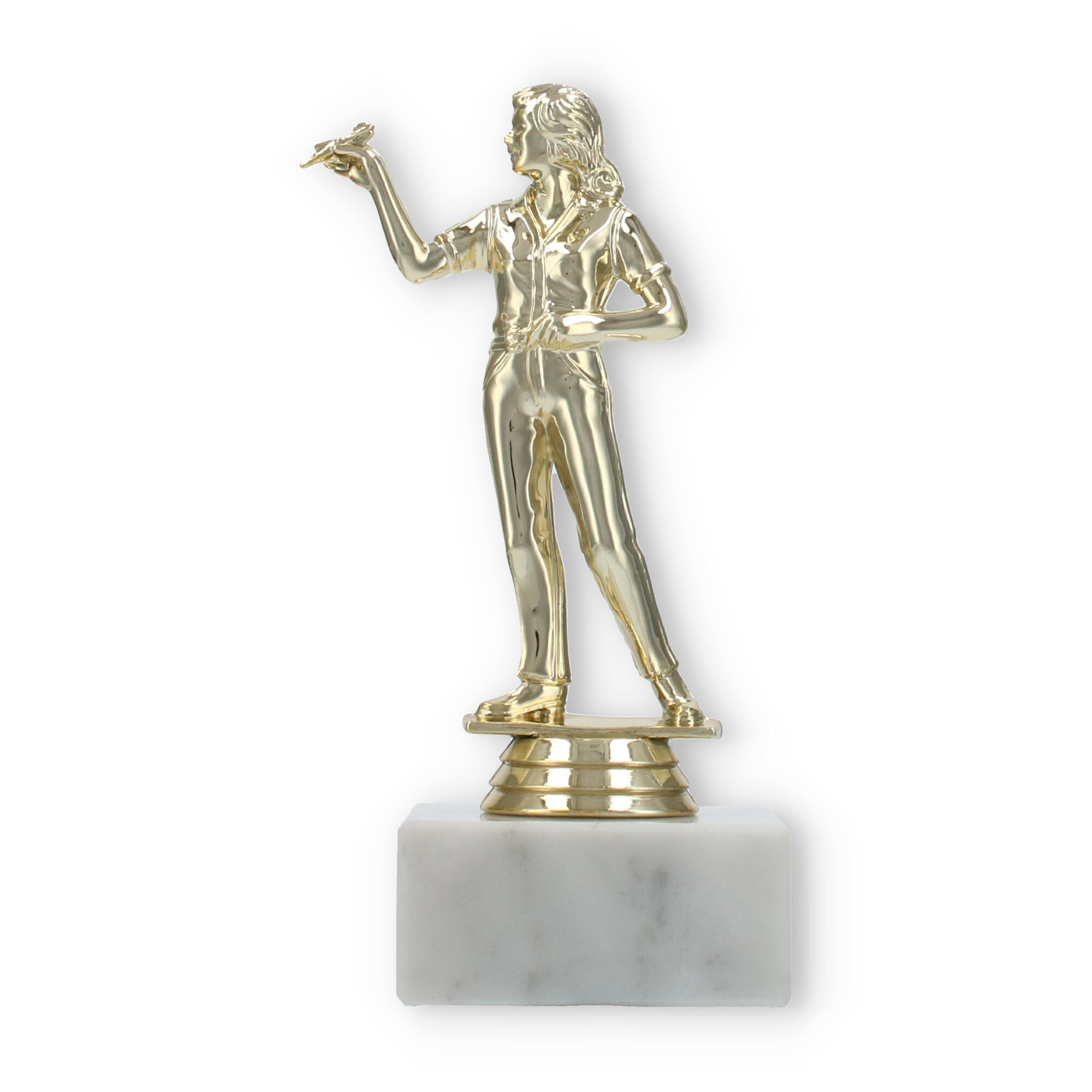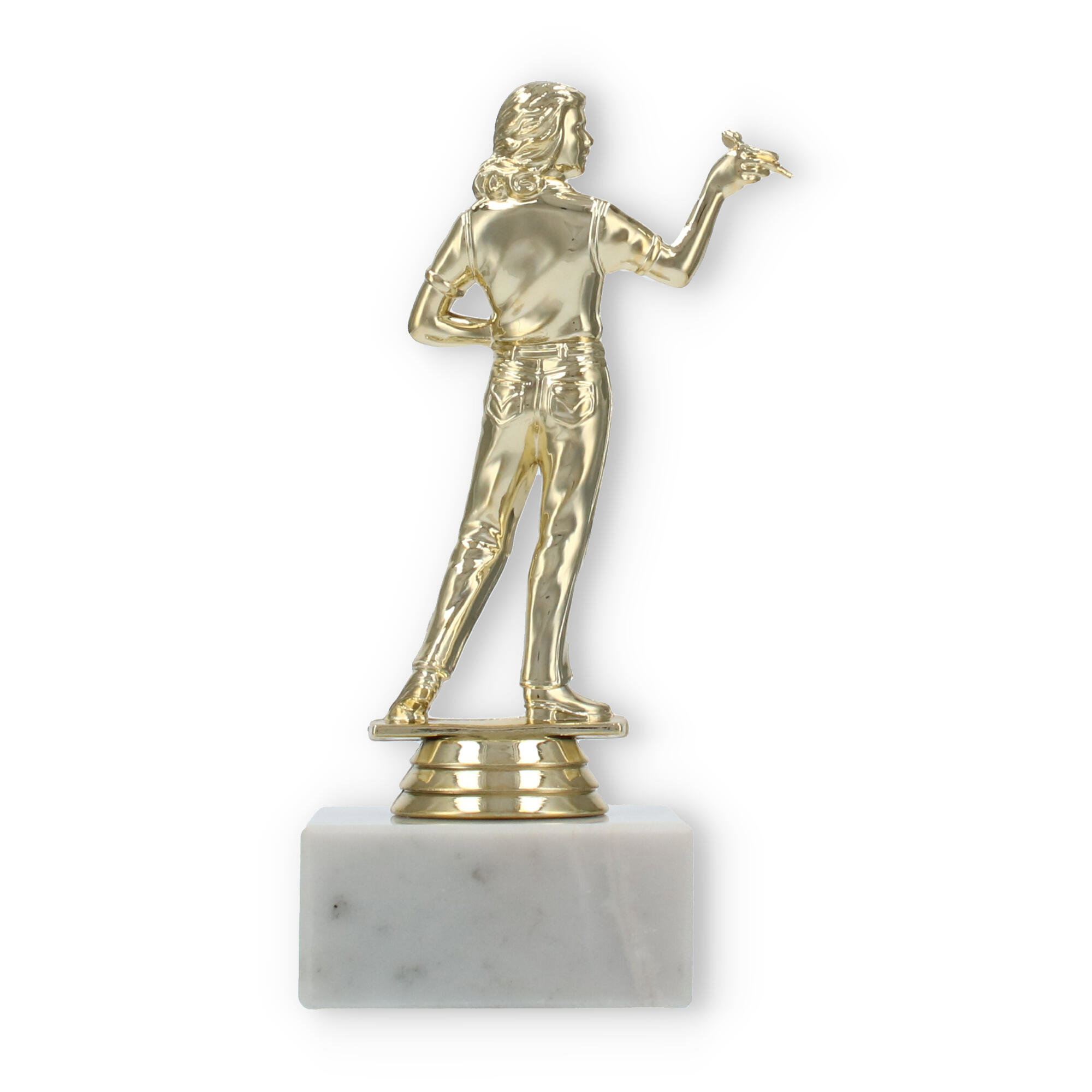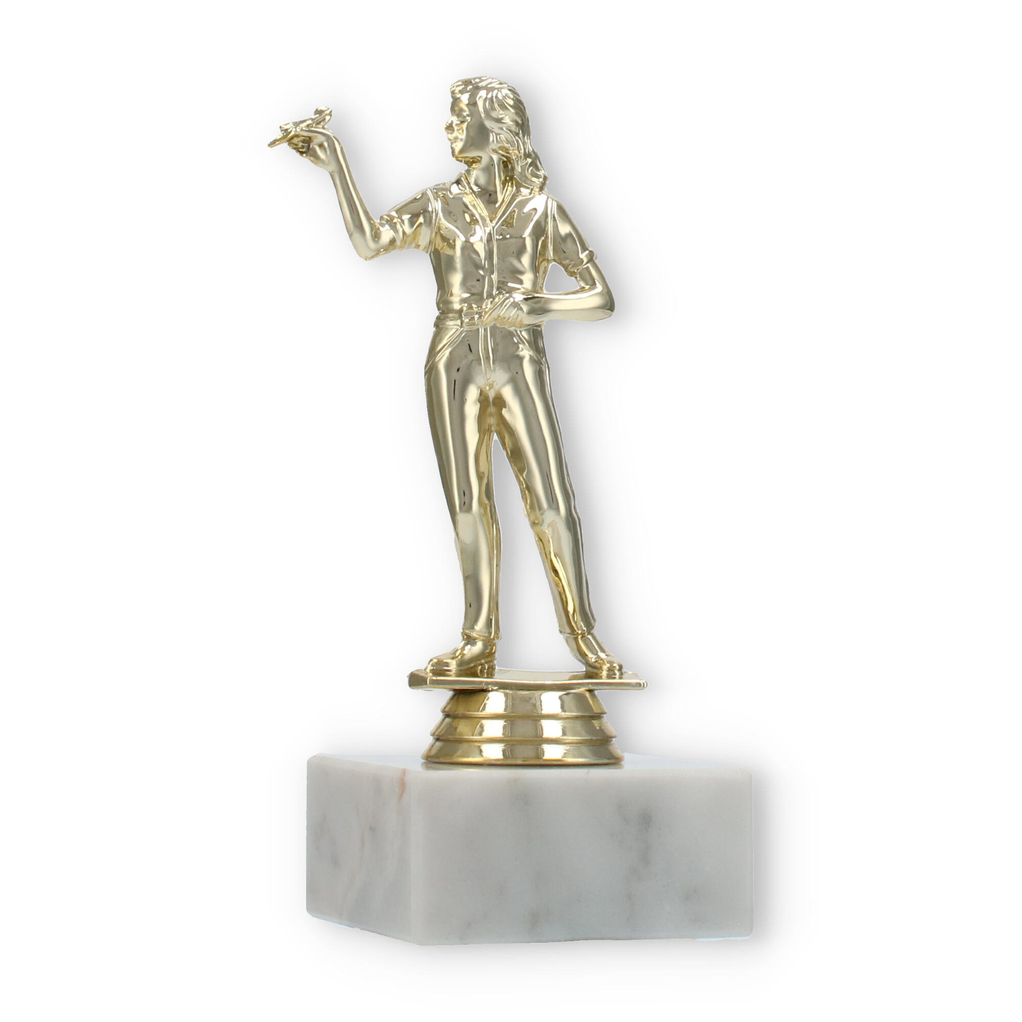 Unsere Pokalfigur Dartspielerin verewigt siegreiche Momente auf stilvolle Weise. Mit einer goldfarbenen Figur und einer Basis aus weißem Marmor wird jede Ehrung zu einem eindrucksvollen Ereignis. Personalisierbar und hochwertig – diese Trophäe ist die perfekte Wahl für Dart-Fans und Turniere.