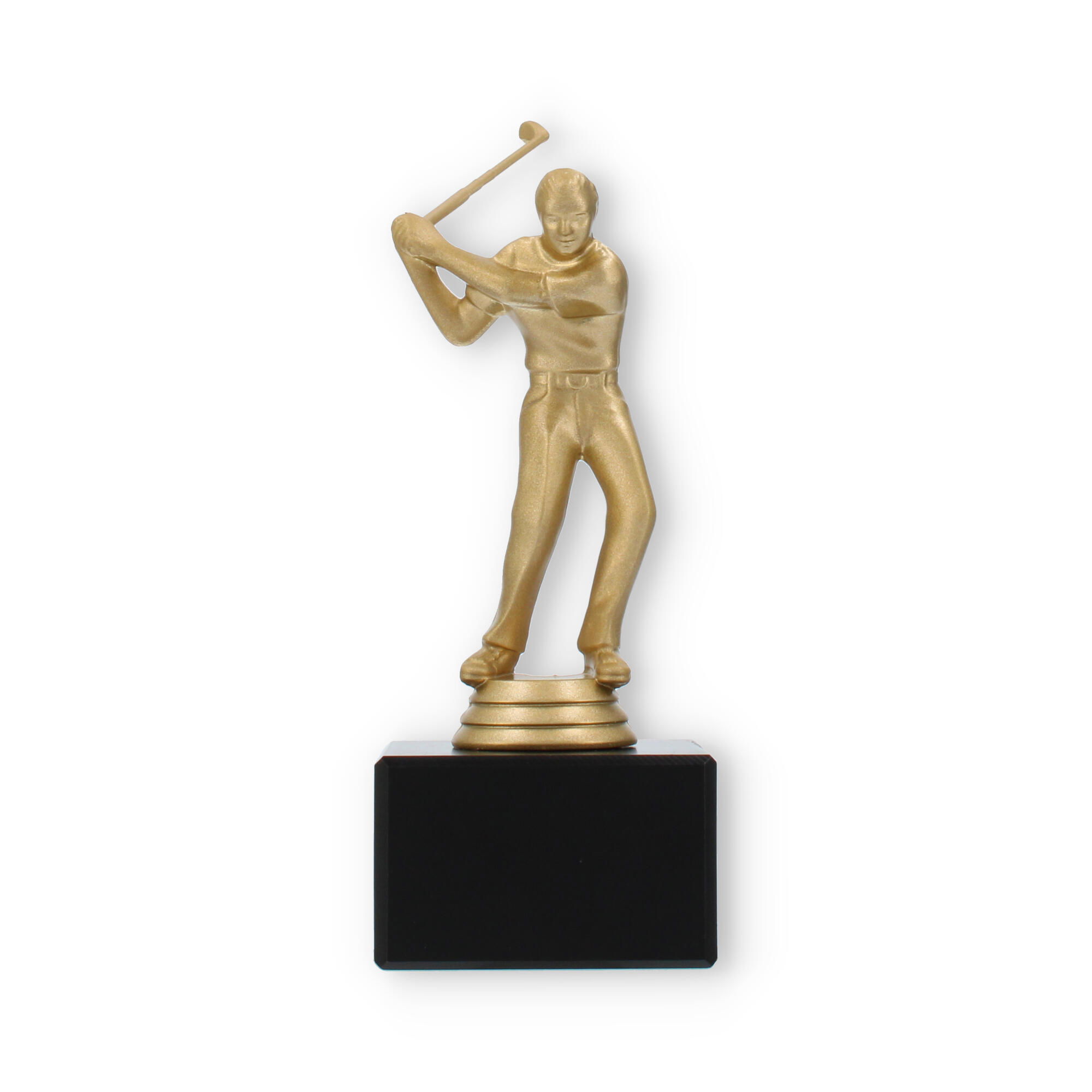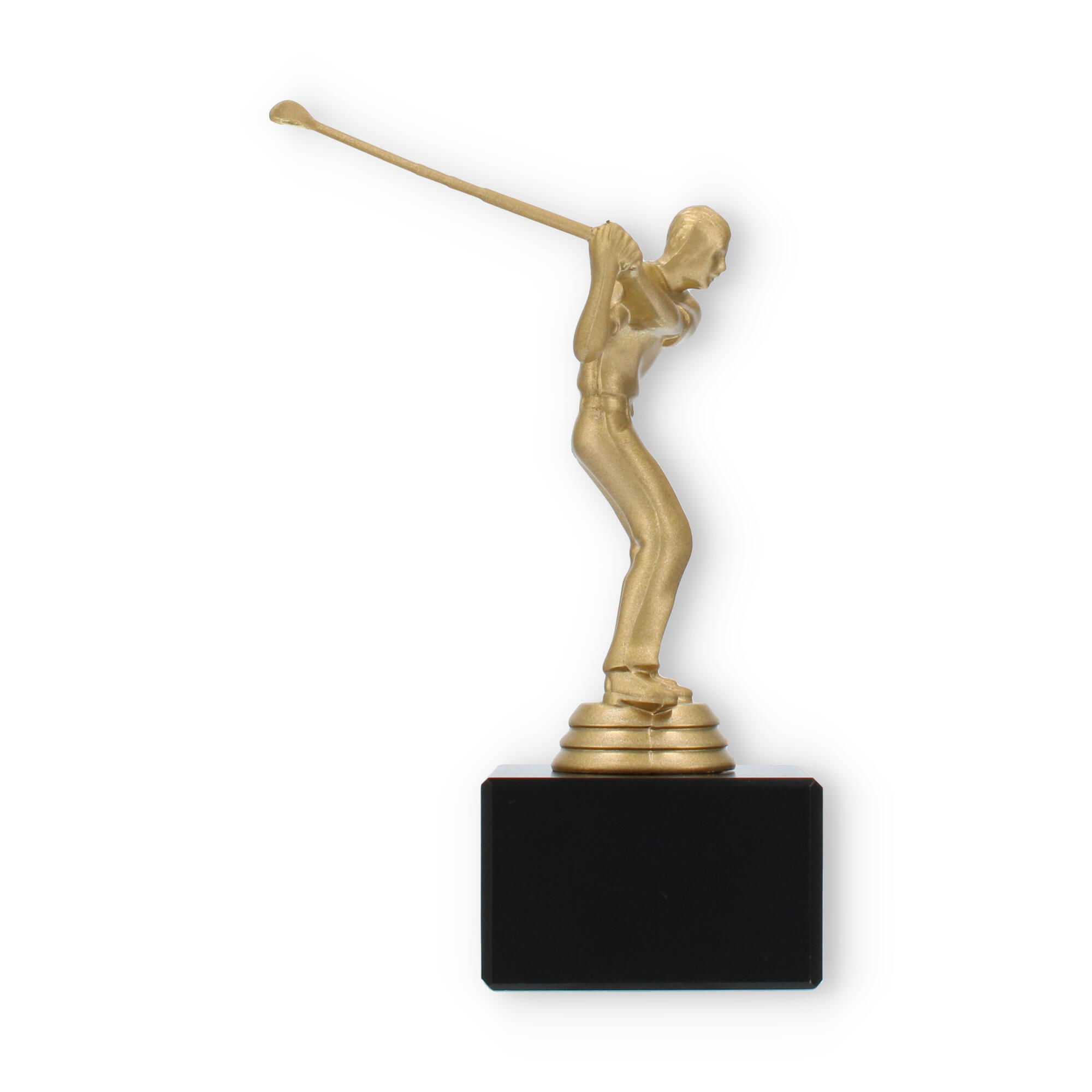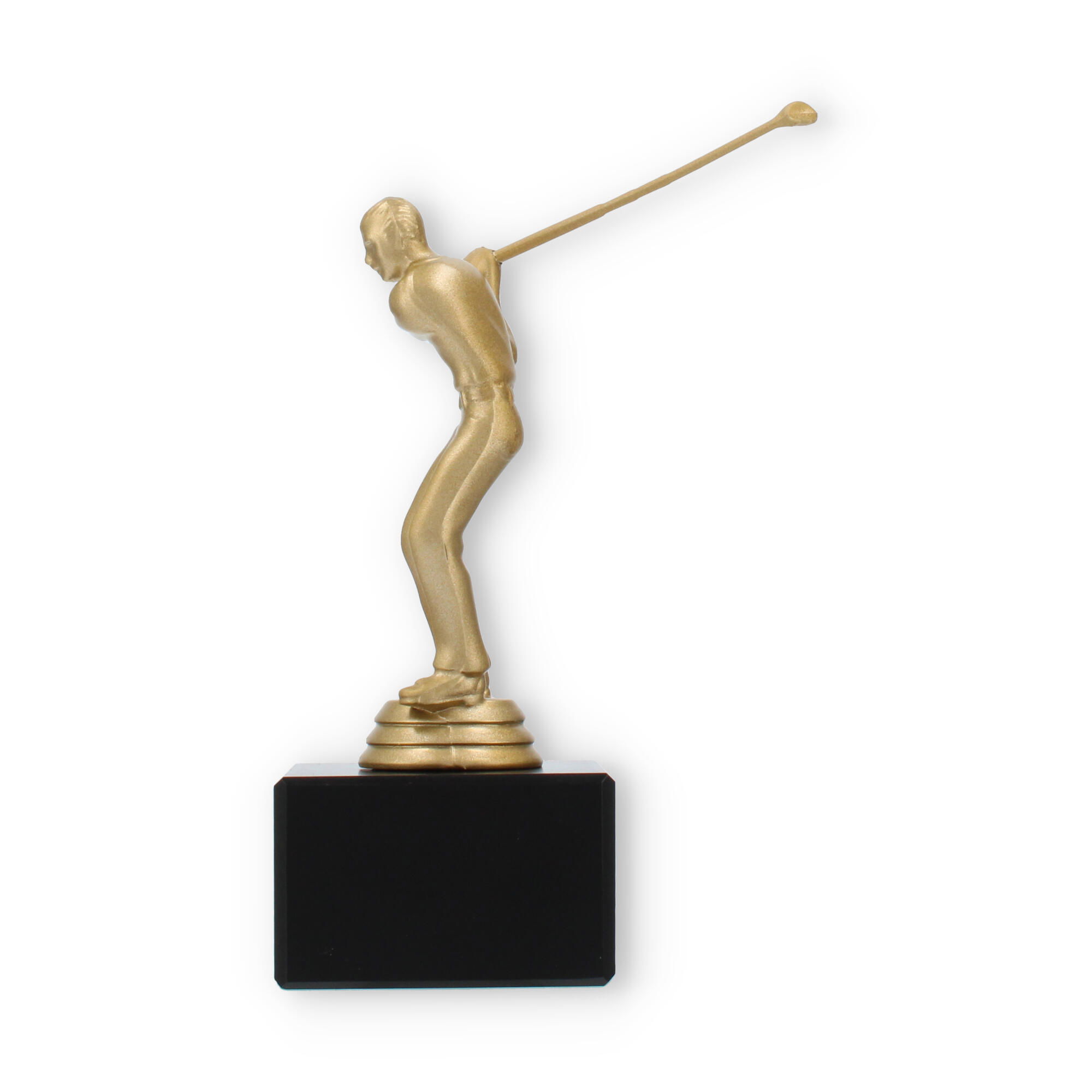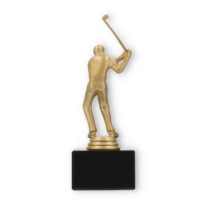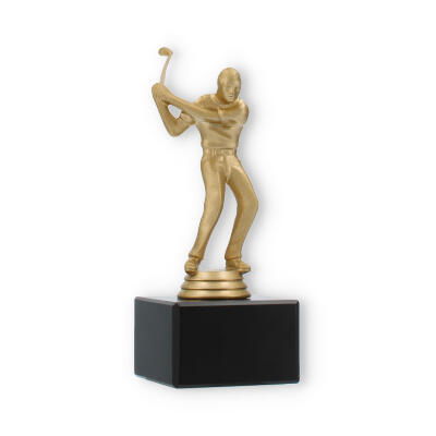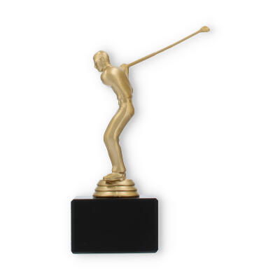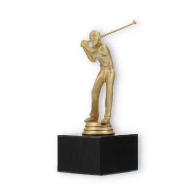 O troféu de Golfe destaca-se pela representação fiel de um golfista em pleno movimento. Esta figura, em cor de ouro metálico, traz à tona a emoção e a energia do desporto, cativando todos os que a observam. A base preta de mármore oferece estabilidade e um contraste elegante, elevando a sofisticação e o impacto visual do troféu.