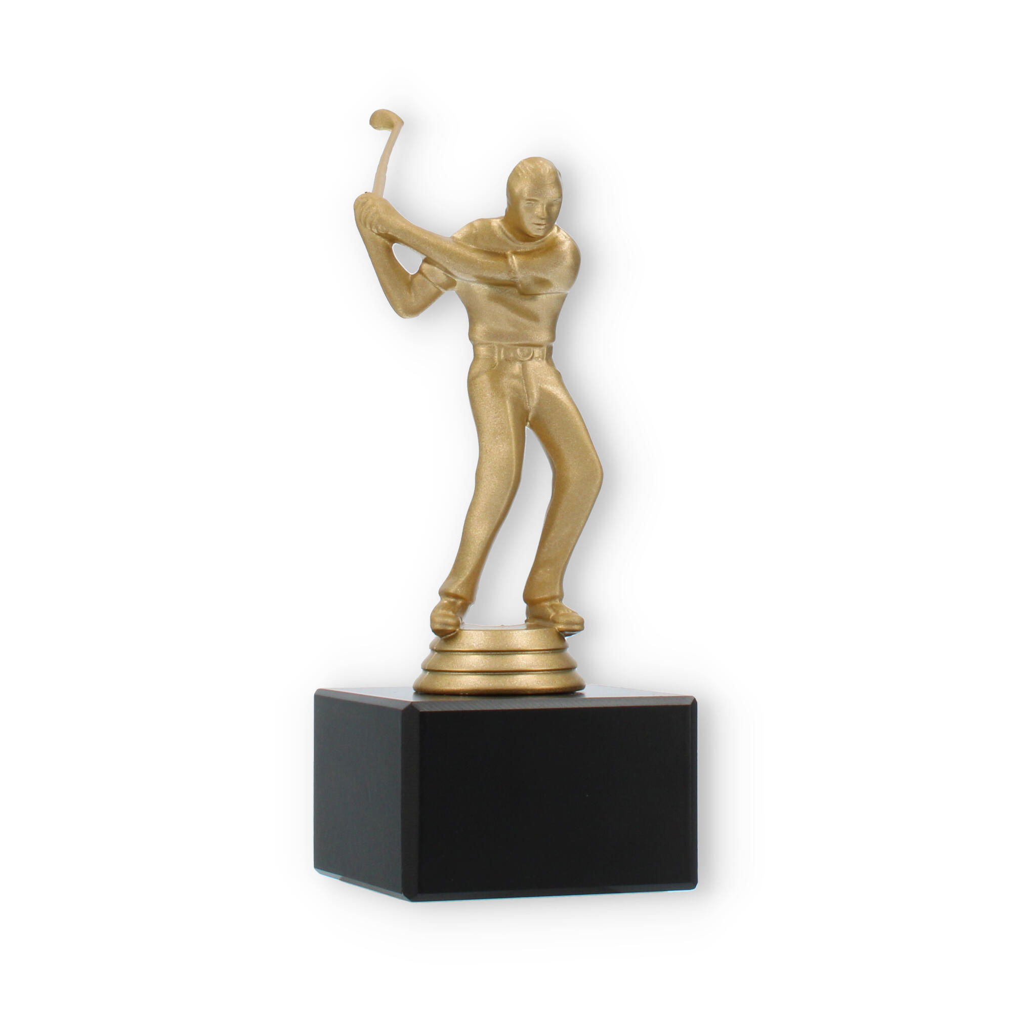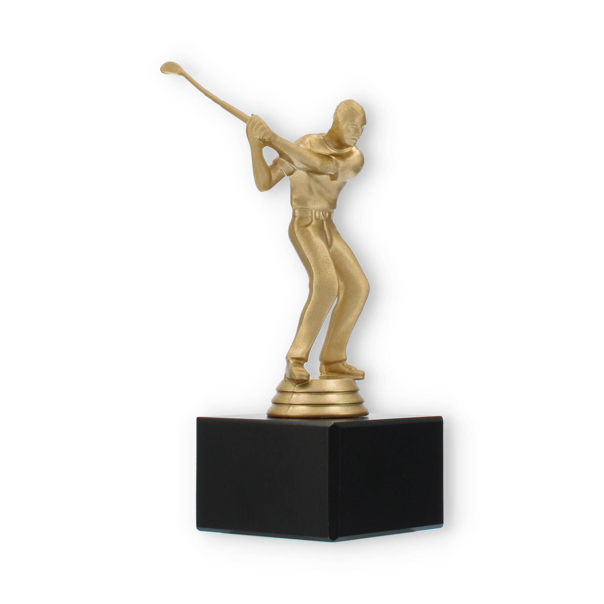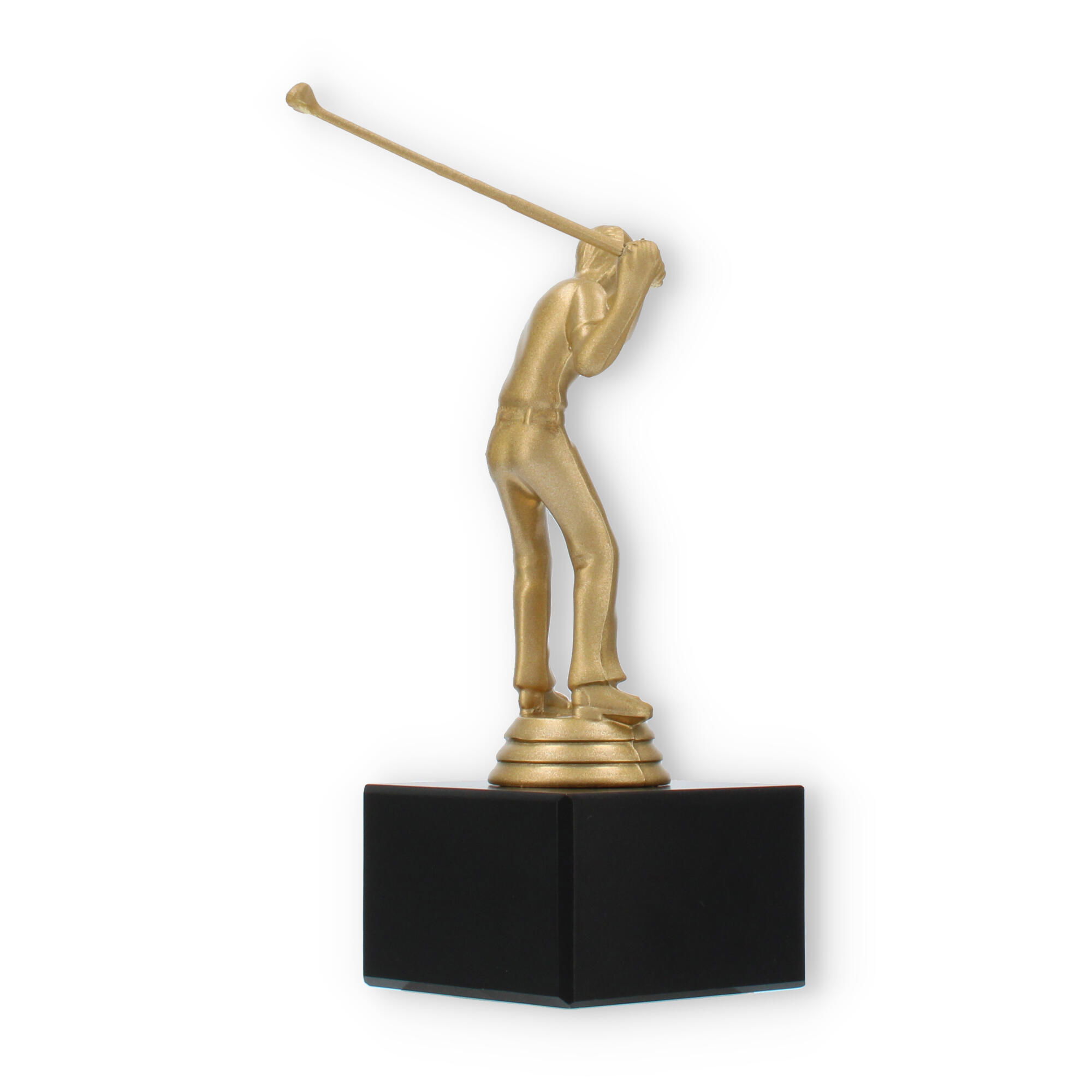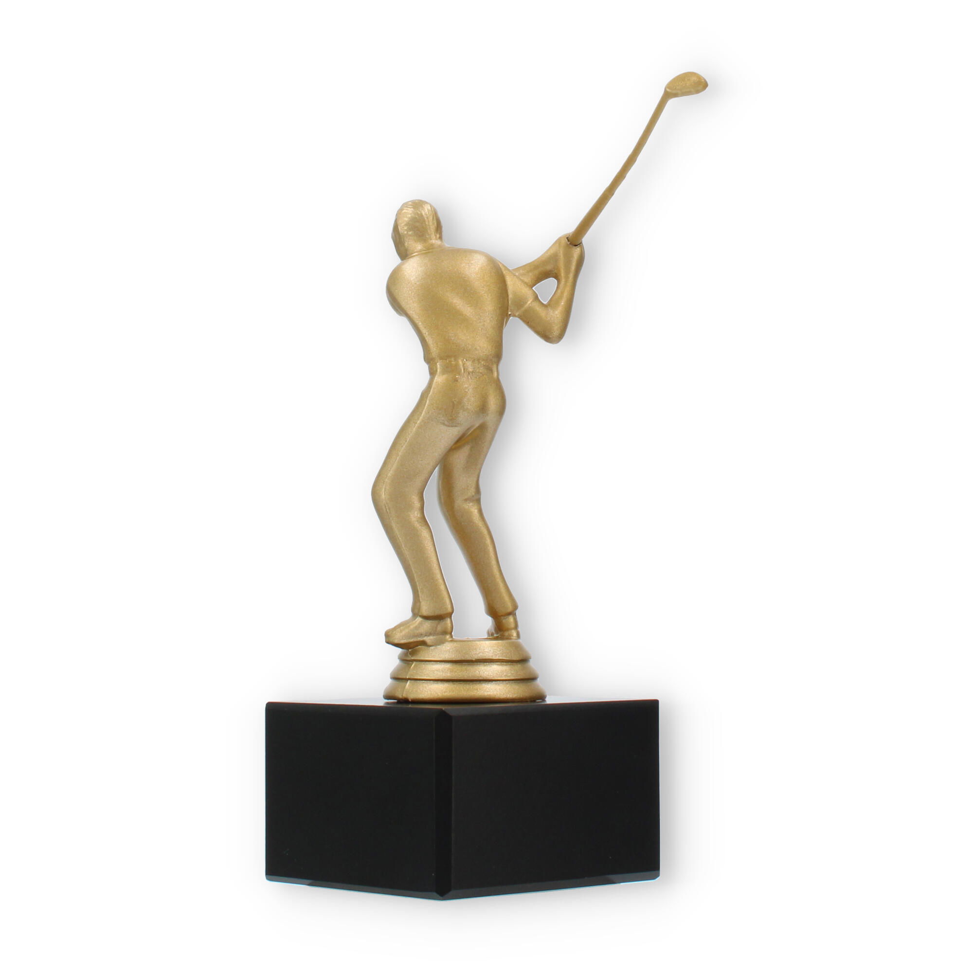 O troféu de Golfe destaca-se pela representação fiel de um golfista em pleno movimento. Esta figura, em cor de ouro metálico, traz à tona a emoção e a energia do desporto, cativando todos os que a observam. A base preta de mármore oferece estabilidade e um contraste elegante, elevando a sofisticação e o impacto visual do troféu.
