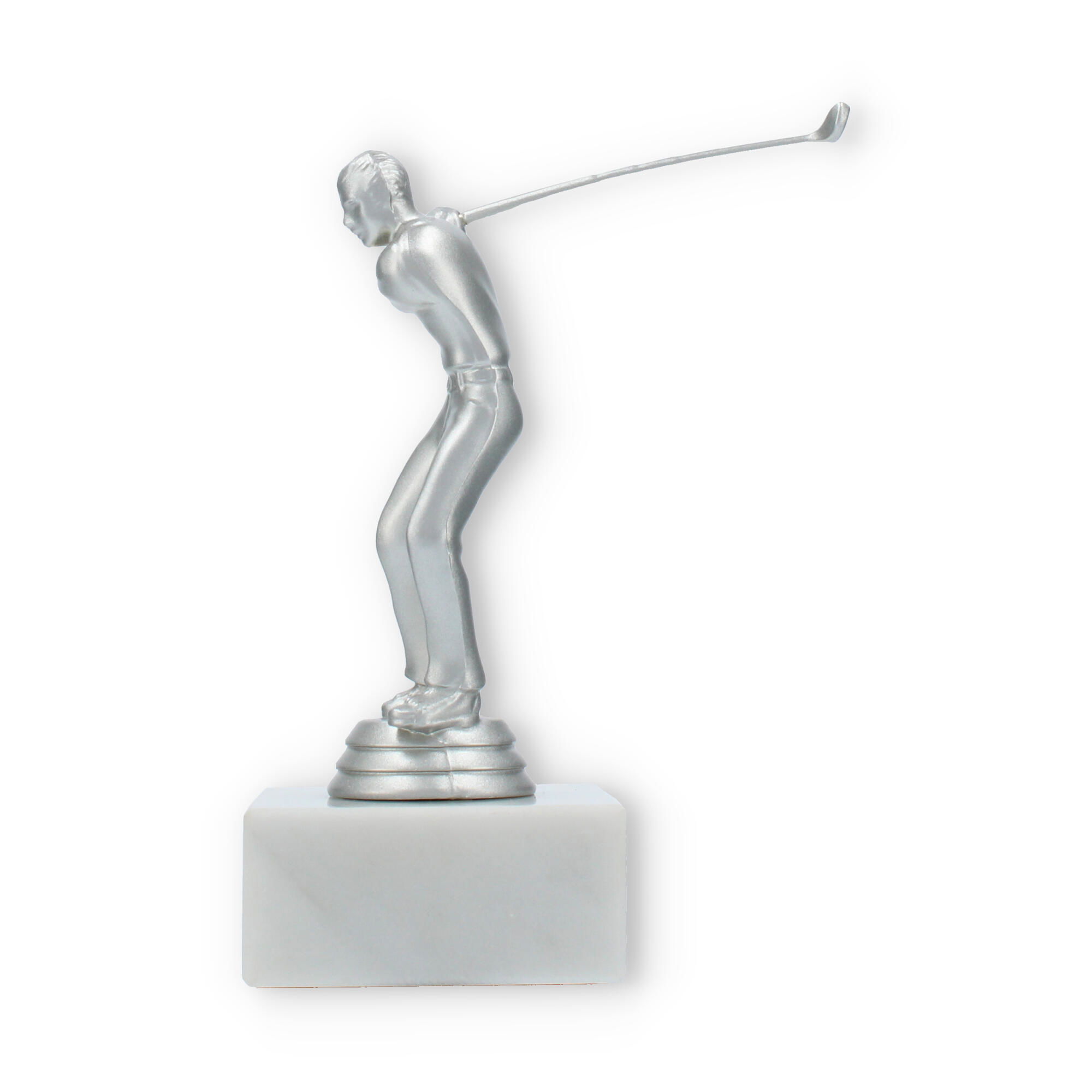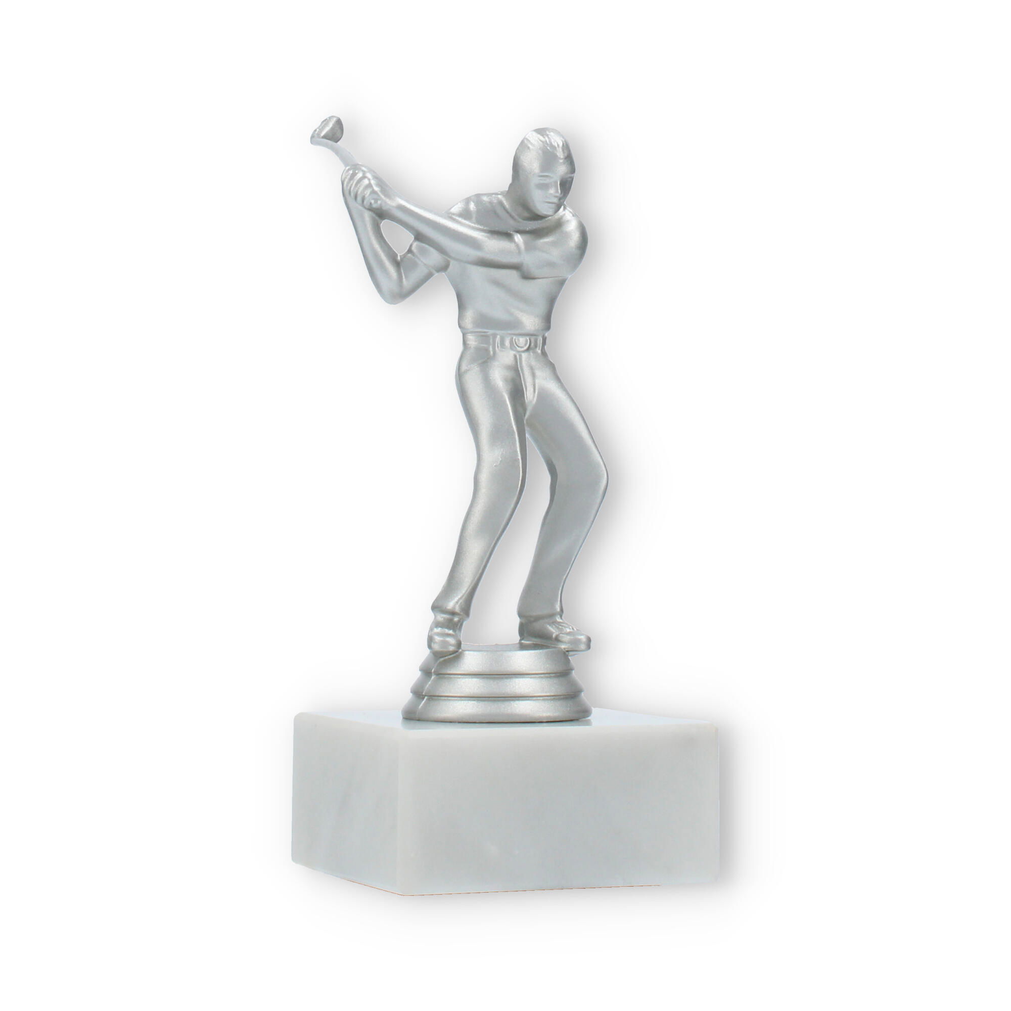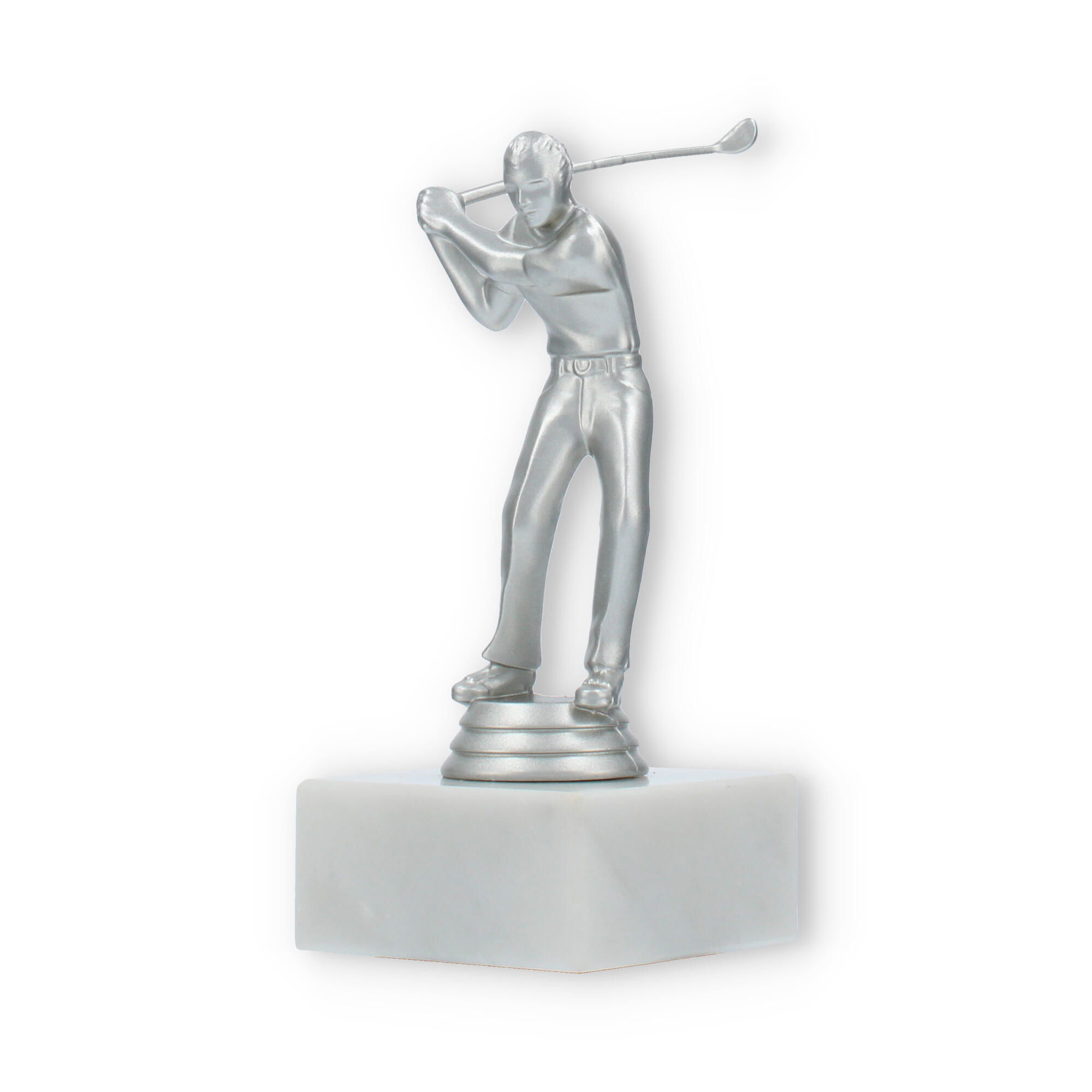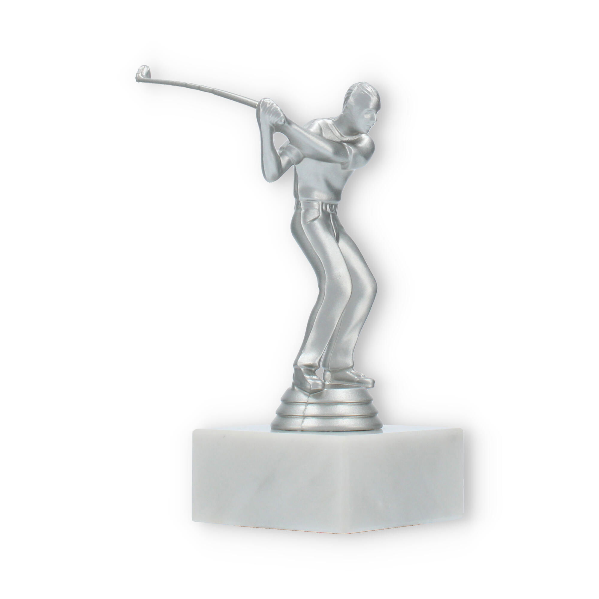 De Golf Men trofee is speciaal ontworpen voor liefhebbers van de golfsport. Deze elegante beker vangt de geest van competitie en de vreugde van overwinning binnen een prachtig ontwerp. De zilverkleurige kunststof figuur symboliseert een golfspeler in beweging, met oog voor detail in elke curve en lijn. Op de stevige witte marmeren sokkel komt het geheel magnifiek tot zijn recht.