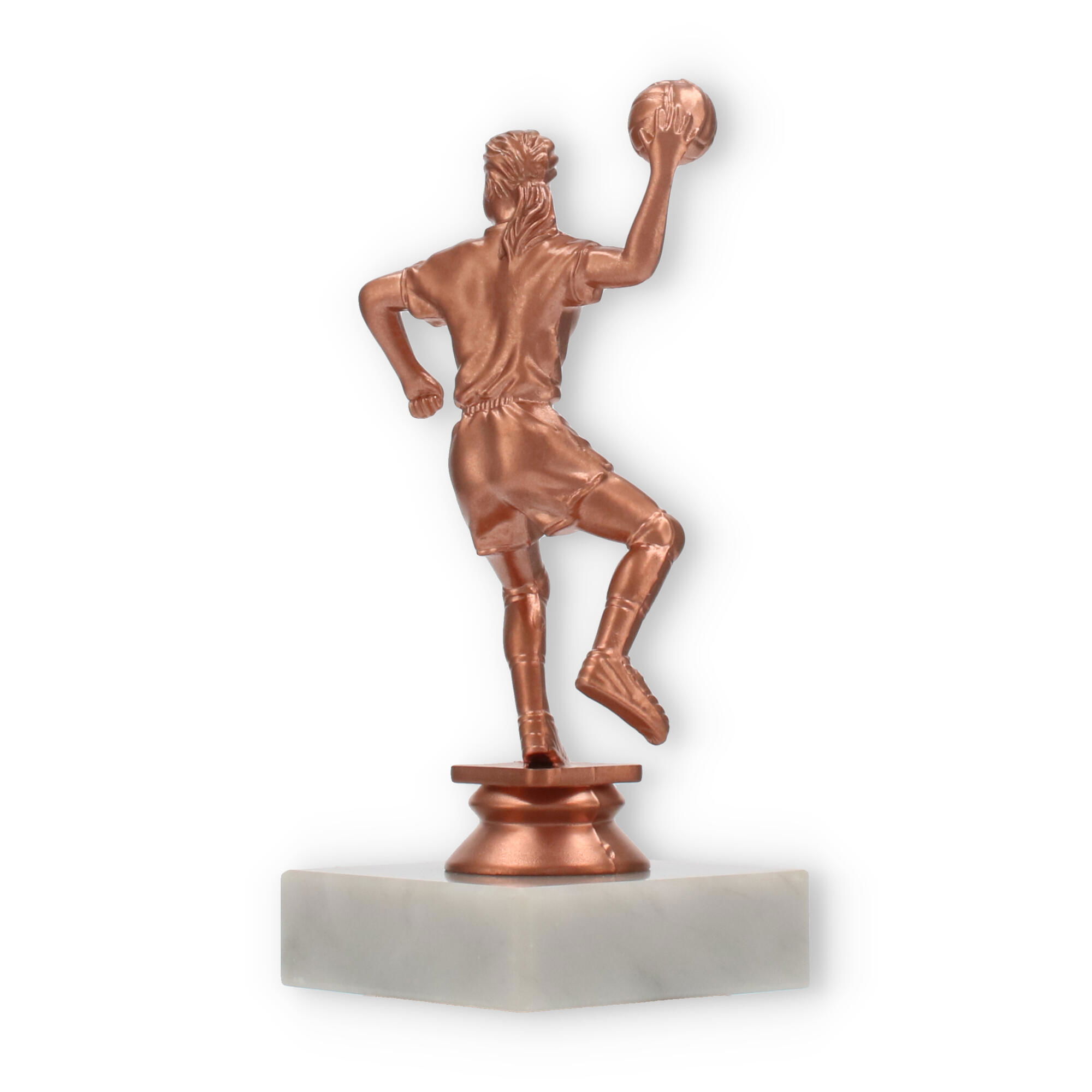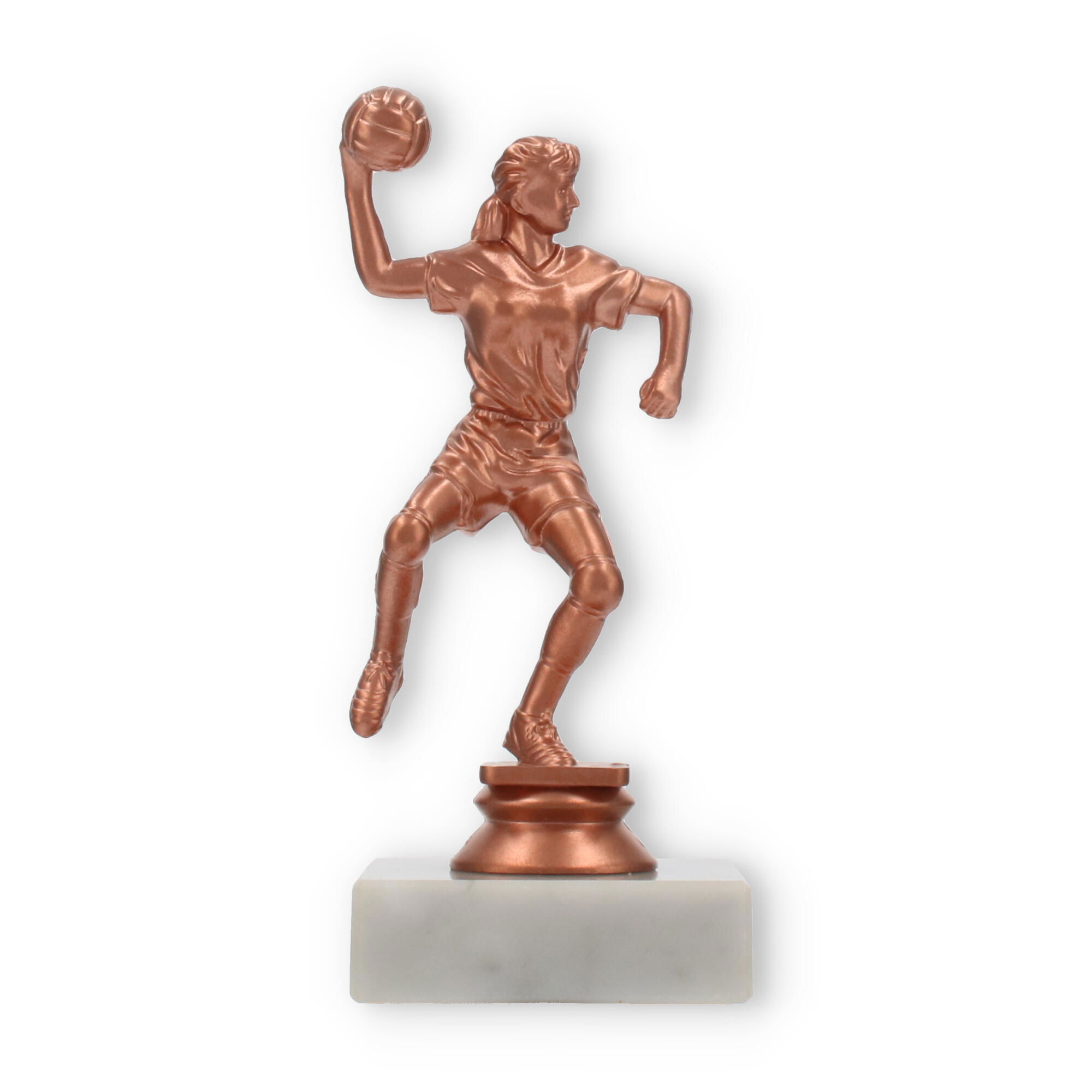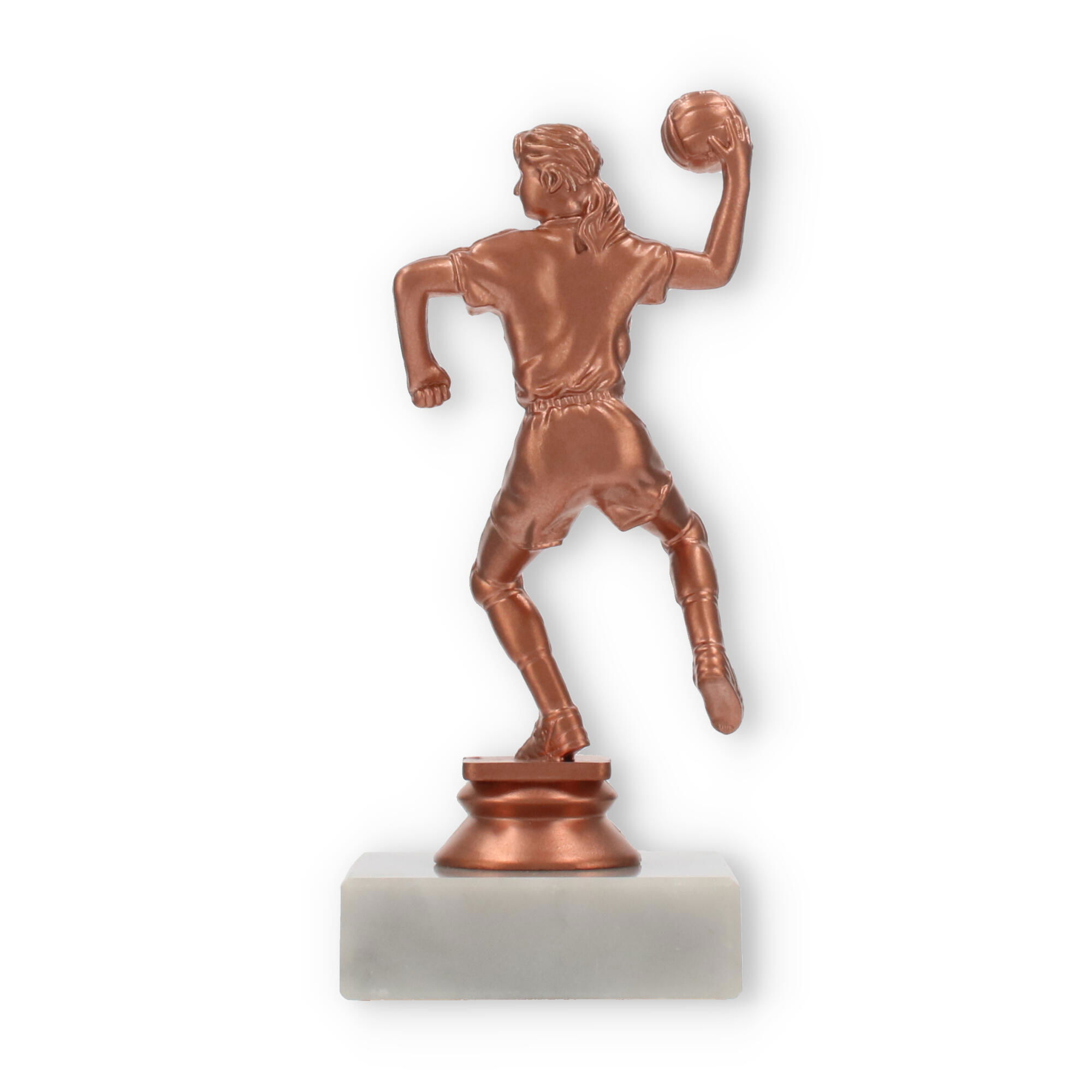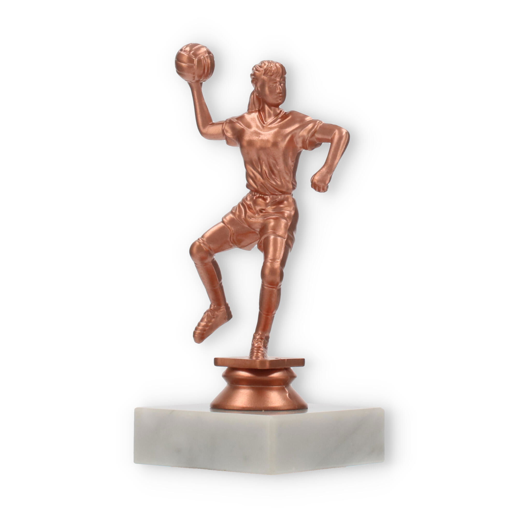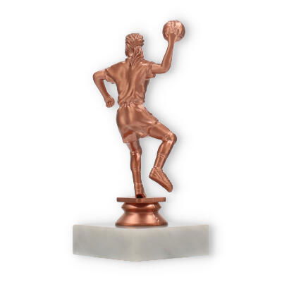 El trofeo de balonmano, una figura imponente con un acabado en colores bronceado, resplandece sobre su base de mármol blanco. Perfecto para decorar momentos de gloria, personalízalo con un grabado exclusivo para capturar el espíritu del triunfo.