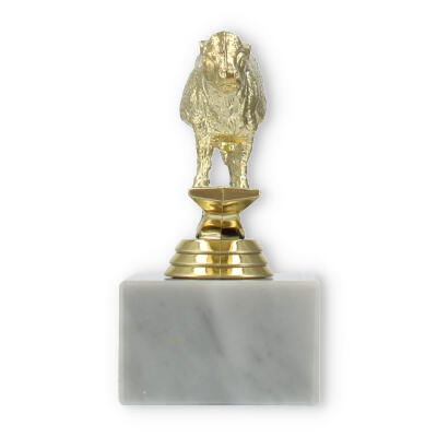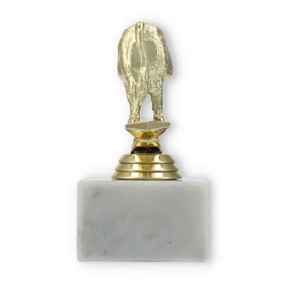 Die Figur steht auf einem goldfarbenen Zwischenelement, das durch seine zylindrische Form und metallische Optik ebenfalls beeindruckt. Dieses Zwischenelement verbindet die Figur elegant mit dem Marmorsockel und sorgt für einen harmonischen Gesamteindruck. Das Zusammenspiel von weißem Marmor und goldfarbenem Kunststoff macht die Trophäe zu einem Blickfang, der bei jeder Siegerehrung beeindruckt.